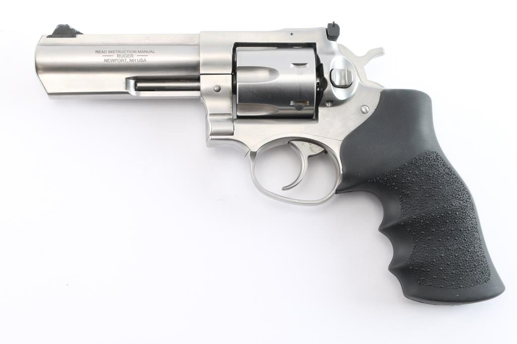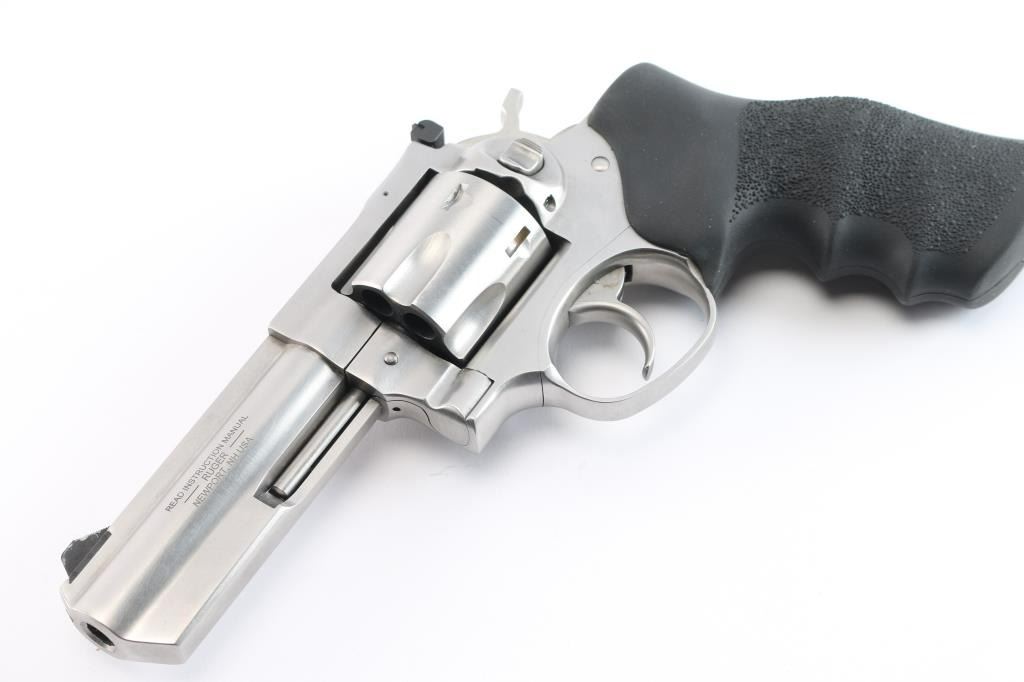 American made stainless steel double-action six shot revolver chambered in .357 Magnum, manufactured circa 2019. Features a brushed finish, 4" full lug and serrated rib barrel, with dovetailed serrated blade front sight, pinned adjustable white square notch rear sight, smooth trigger, knurled hammer spur, fluted six-shot cylinder, and black rubber textured target grip with stamped Ruger logo. Bore is excellent/bright with strong rifling. Retains approx. 95% metal finish with minor scratches, edge wear and or handling marks. Grip is excellent. Action is smooth with tight lock-up.