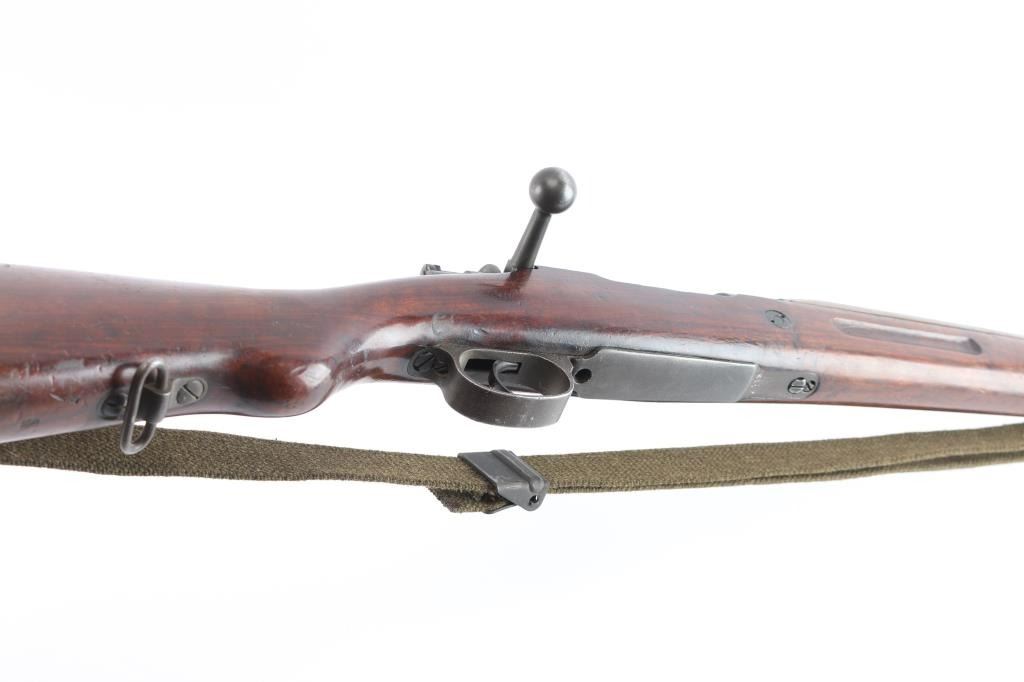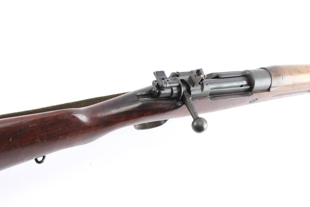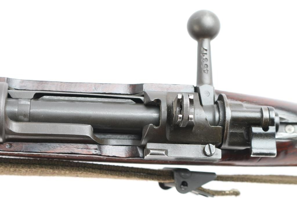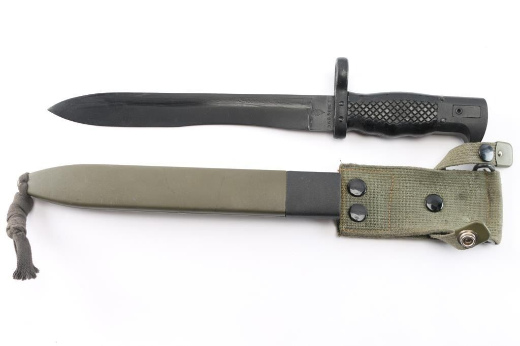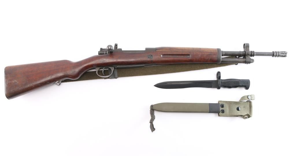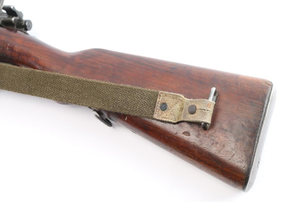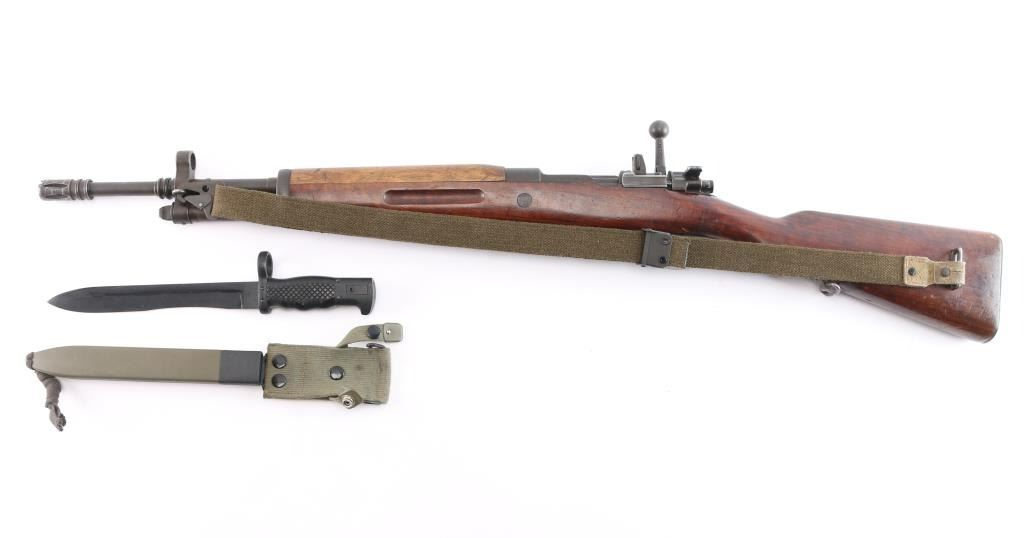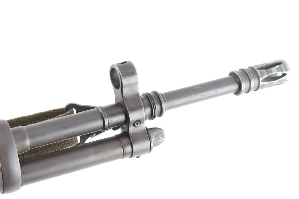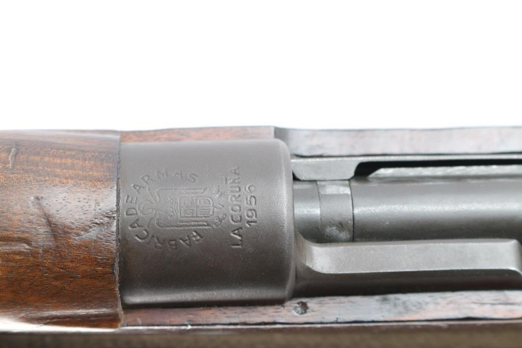 Spanish military rifle chambered for the 7.62x51mm cartridge, imported by C.A.I. St Albans VT. Barrel length is 18.5 inches. Features adjustable hooded post front & rotating dial rear sight with variable apertures & a 'v' notch, storage tube under the barrel, straight bolt handle, three-position safety on the rear bolt shroud, bayonet lug, sling swivels on side & bottom at butt, sling eyelet on front sight base, flash suppressor, hinged floorplate. Chamber dated 1956 with Spanish crest. Metal finish is about 80% coverage dark grey parkerizing. Stock is overall very good/sound condition with several dents and handling marks all over. Bore is excellent/bright. Matching Bolt. Includes a correct very good condition green cotton web sling with metal hook and leather tab end fasteners. Correct bayonet, scabbard in excellent condition. Original cleaning kit inside the storage tube under the barrel.