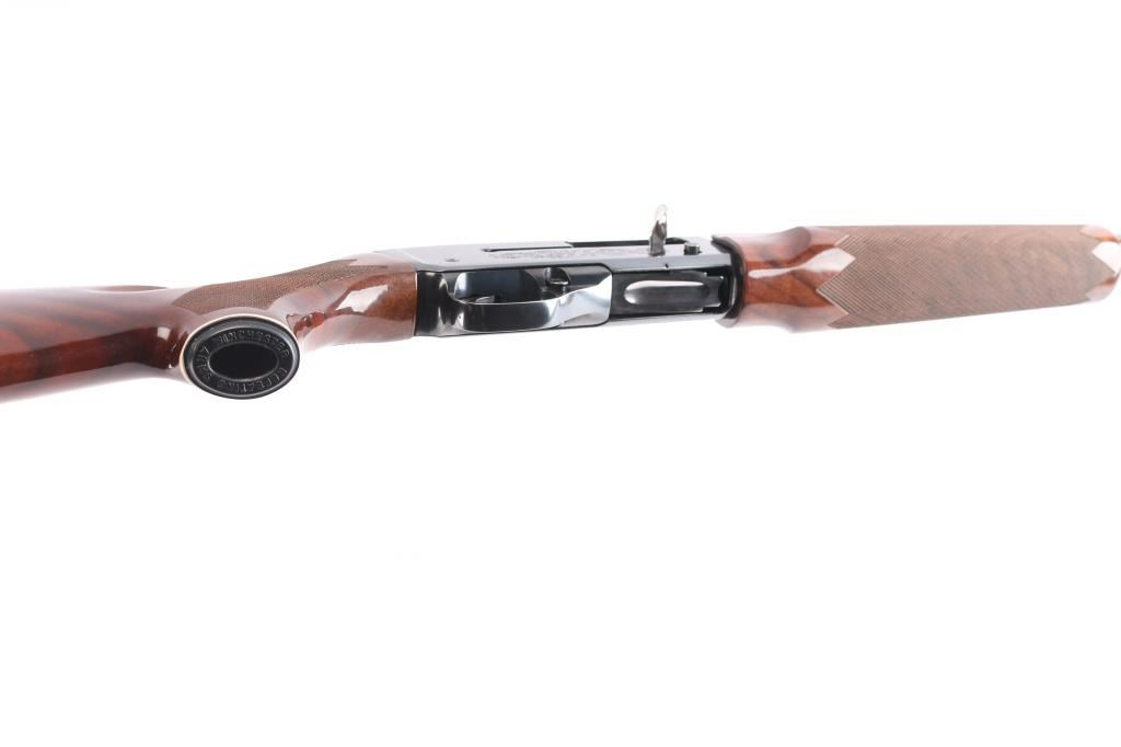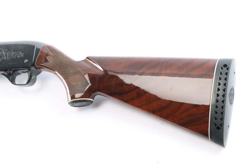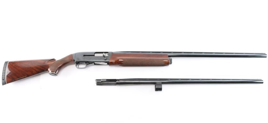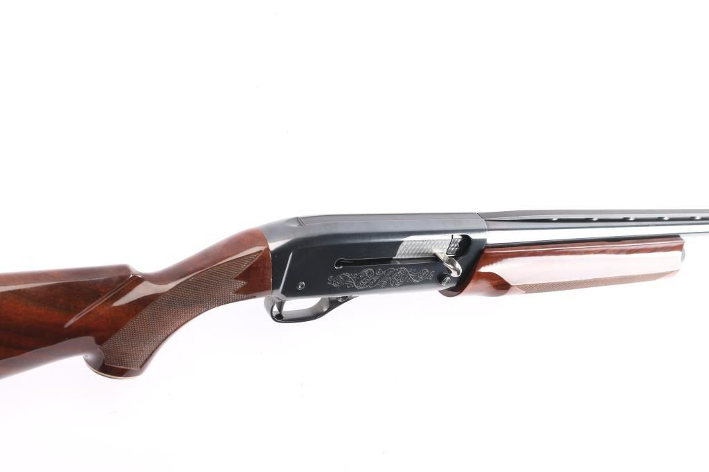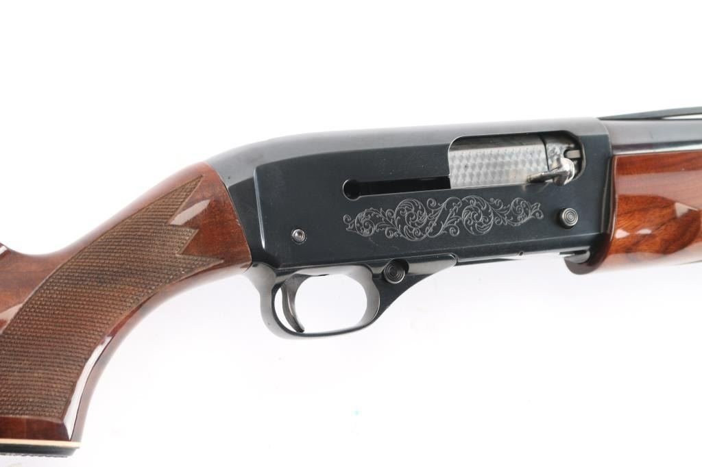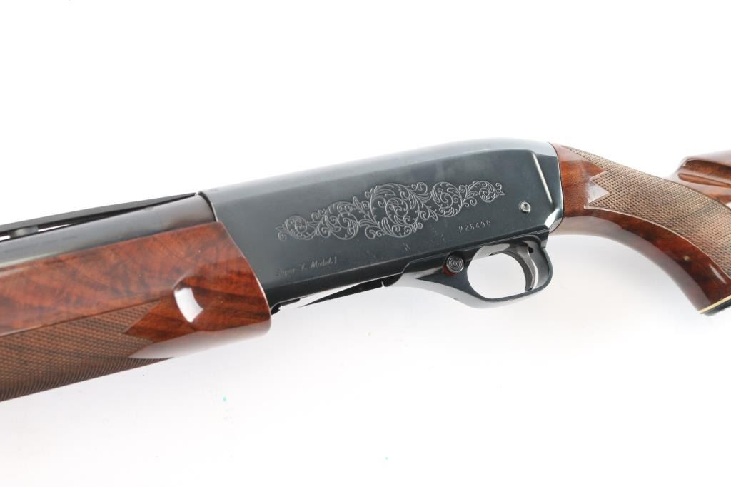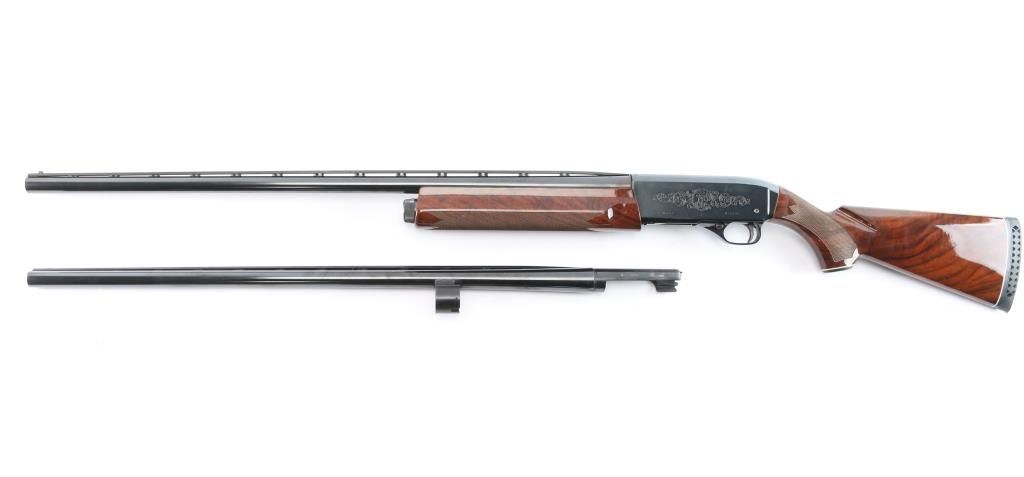 Two Barrel Set. Semiautomatic shotgun features blued finish, urethane finished fancy figured walnut stocks (checkered forend & curved grip stock with checkering at wrist), vented factory rubber recoil pad & steel grip cap with white spacers, 30" vent rib barrel with red polymer Bradley front & steel mid beads. Full fixed choke, manual safety. Floral/scroll engraved receiver, wide, serrated charging handle and machine turned, 'jeweled' bolt. Accepts 2-3/4" shells. LOP-14 1/2". Bore is excellent. Metal retains 99% blue with some very minor scratches. Wood is excellent condition. Comes with 28' Super-X vent rib barrel with Bradley white bead, steel mid beads, 2 3/4' chamber, fixed Modified choke in excellent condition. Super-X Model 1 manufactured 1974-81.