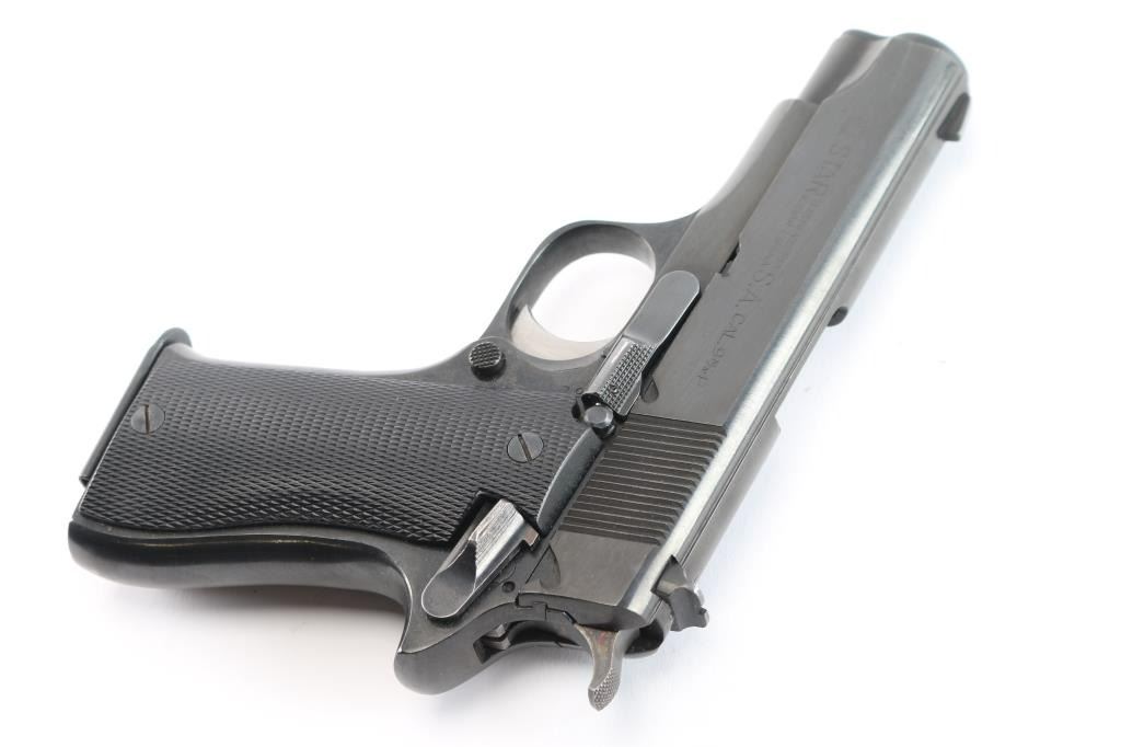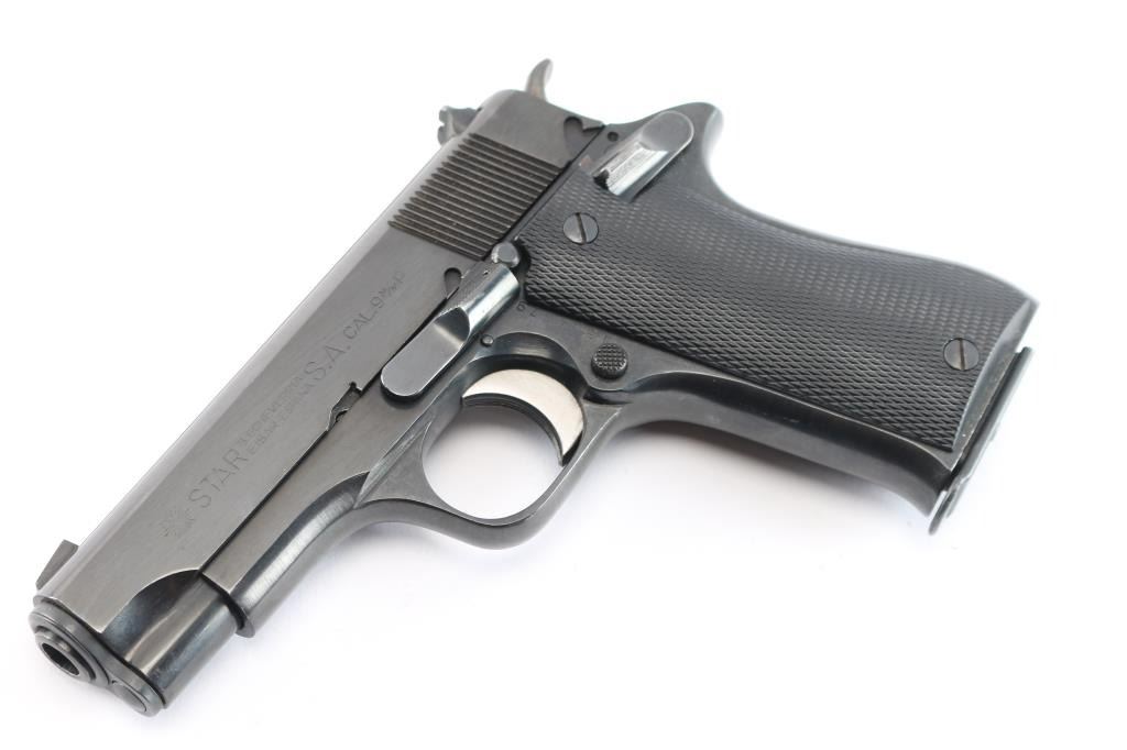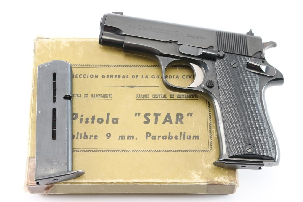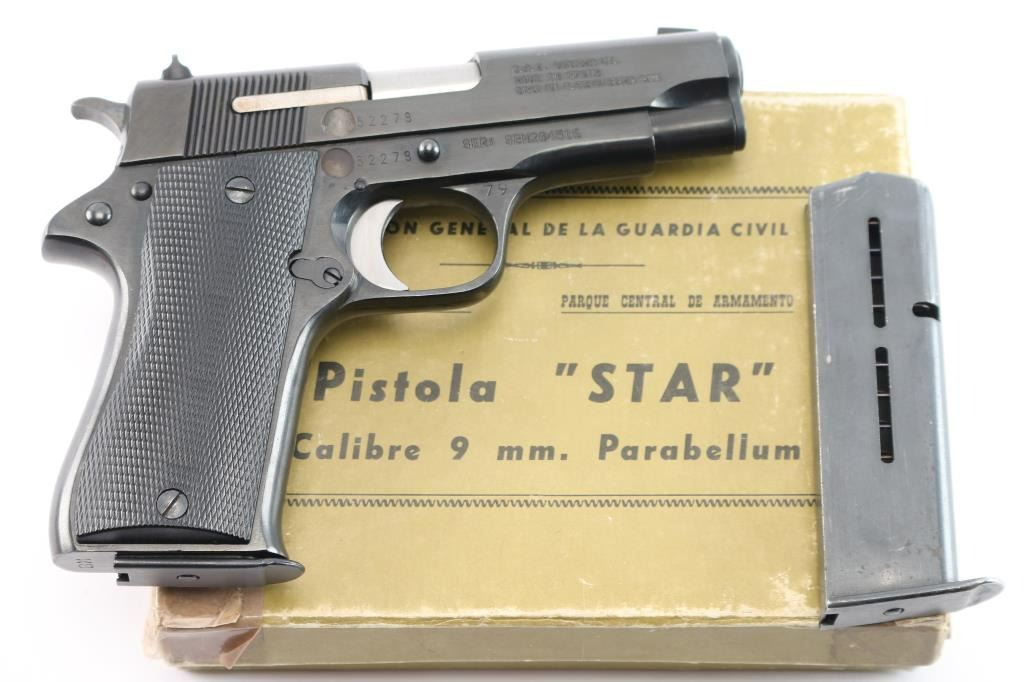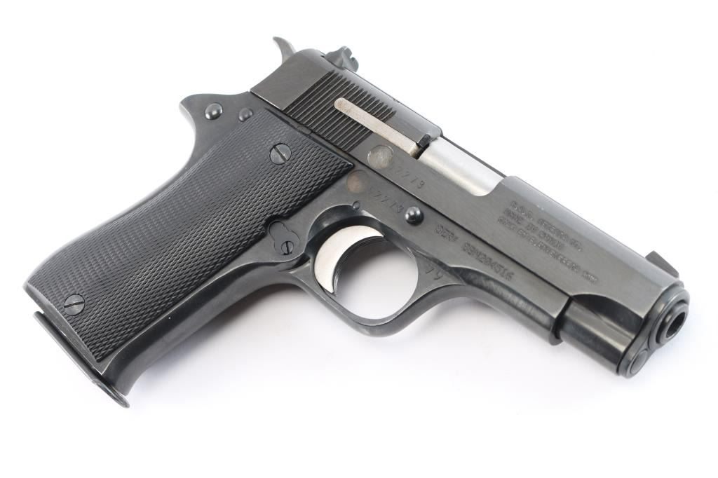 Spanish made single action semi-automatic compact pistol chambered in 9x19mm. Imported by C.A.I. of Georgia, V.T. with import marks on the right side of the slide & frame. Features a blued finish, 3.9" barrel, blade front sight, dovetailed square notch rear sight, serrated trigger, knurled hammer spur, manual safety on the left side of the frame, push button magazine release, 8 round magazine, steel frame and two-piece checkered black synthetic grips. Includes a factory cardboard box with extra magazine & manual (In Spanish). Pistol exhibits approximately 99% of it's blued finish showing no signs of wear. Action is smooth, the bore is excellent and the plastic grips are excellent. Manufactured 1979.
