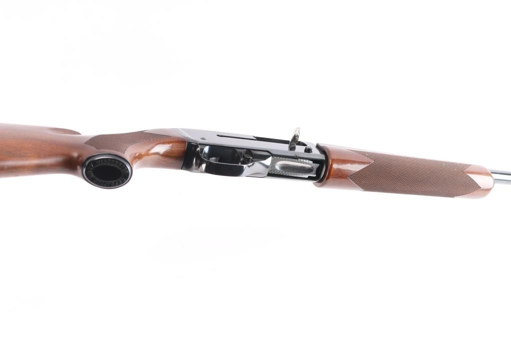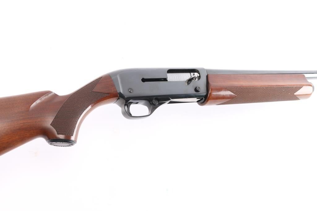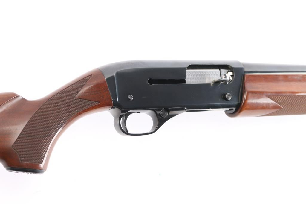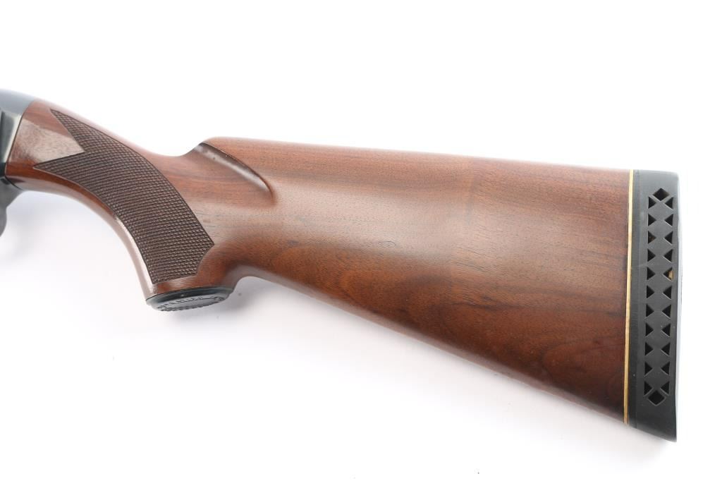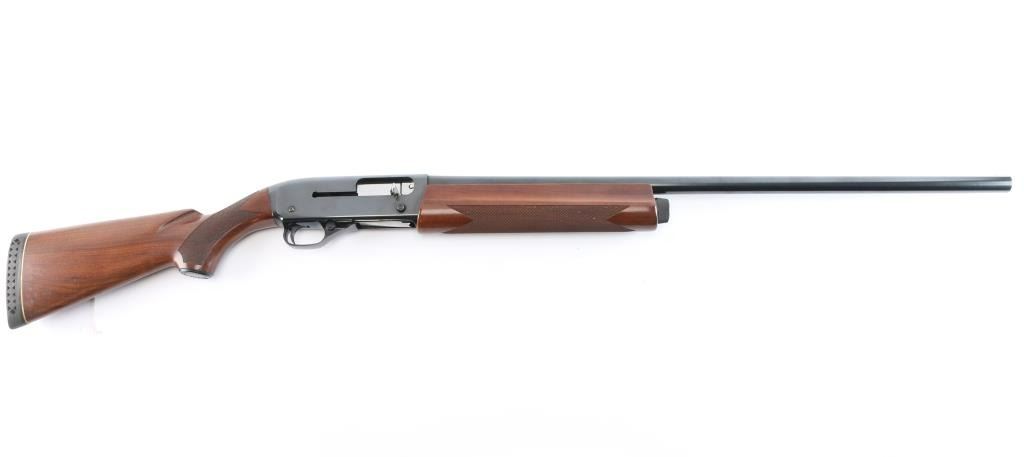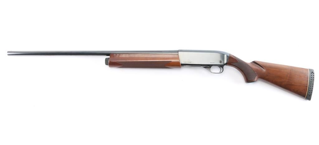 Semiautomatic shotgun features blued finish, urethane finished nicely grained walnut stocks (checkered forend & curved grip stock with checkering at wrist), vented factory rubber recoil pad & steel grip cap with white spacers, 28" plain barrel with steel bead. Modified fixed choke, manual safety. Wide, serrated charging handle and machine turned, 'jeweled' bolt. Accepts 2-3/4" shells. LOP-13 3/4". Bore is excellent. Metal retains 99% blue with some very minor scratches. Wood is excellent condition. Manufactured 1974.