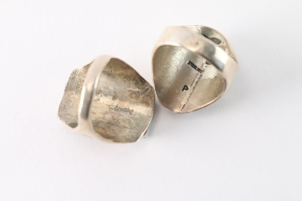 One is an oval turquoise stone set in sterling silver shadowbox design, maker marked P, size 10 3/4. The other has 3 turquoise rectangles in stamped sterling silver setting, no maker mark, size 10 1/2.