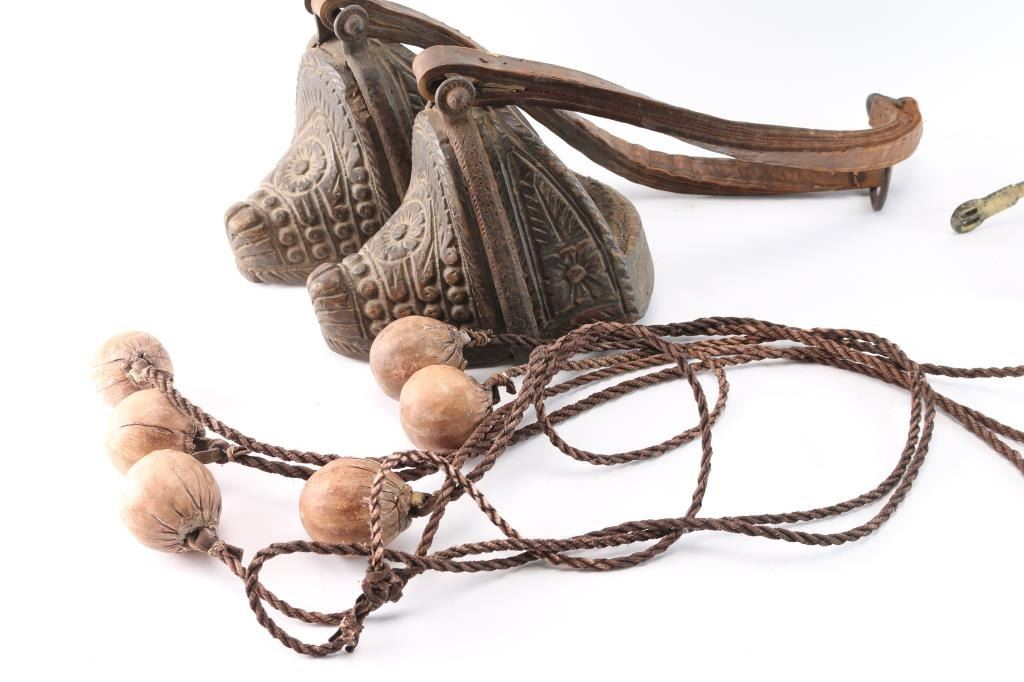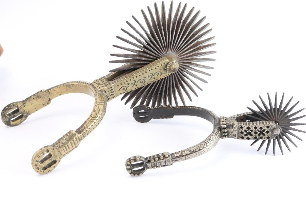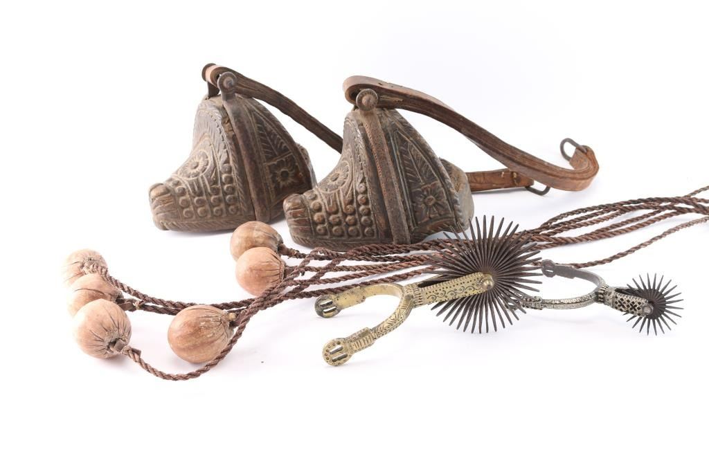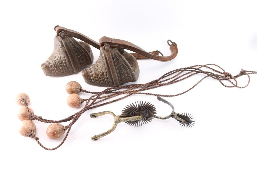 Pair of large rowel silver overlaid spurs, leather wrapped bolas , and carved wooden stirrups,