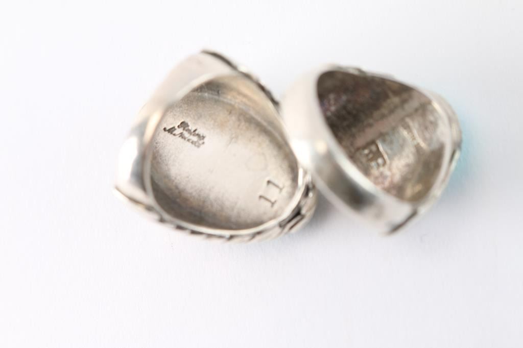 One has a large oval turquoise stone set in sterling silver, signed on back, stamped size 11 but measures size 10. The other has a large round turquoise stone set in sterling silver design, maker marked RB, size 10 1/4.