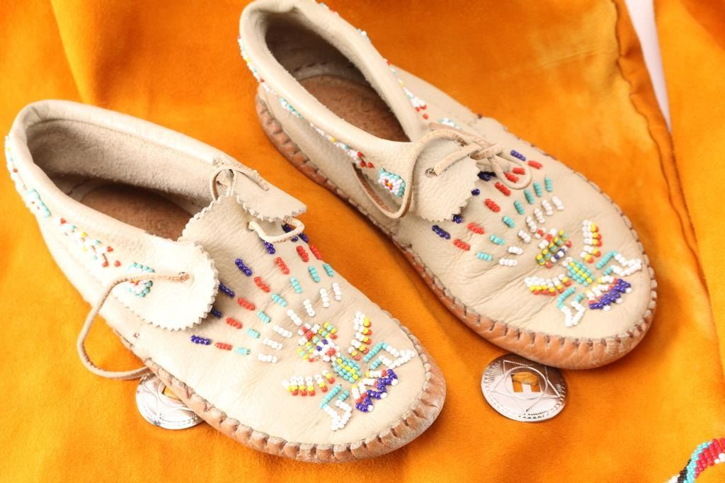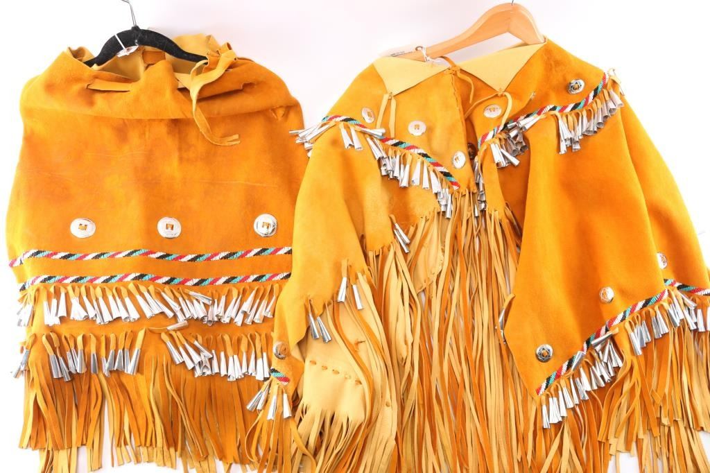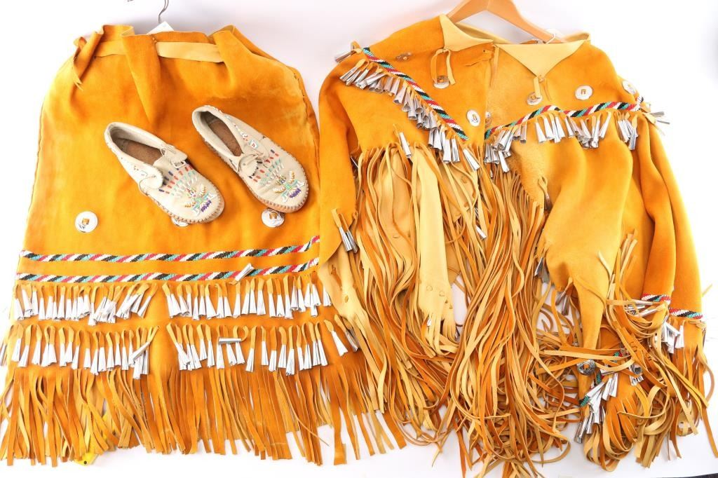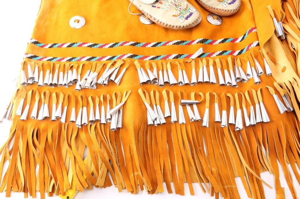 Leather with fringe with cone beads and multicolor beaded collar with matching skirt and beaded moccasins