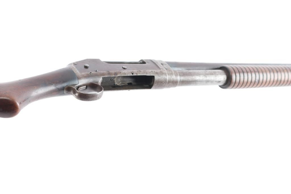 Vintage take down pump action shotgun manufactured circa 1917. Features blued finish, grooved "corn cob" walnut pump handle, smooth walnut stock with curved grip, hard rubber butt plate. plain 30" barrel with brass sighting bead, accepts 2-3/4" shells, fixed FULL choke, exposed hammer. Receiver extension numbered to receiver.(Top number is feint) LOP is 13 1/2". Bore is very good/bright. Retains none of the original blue, having turned a molted gray/brown patina, some scattered areas of very light pitting, action is a little stiff, needs oil, wood has some minor scratches/dings but sound.