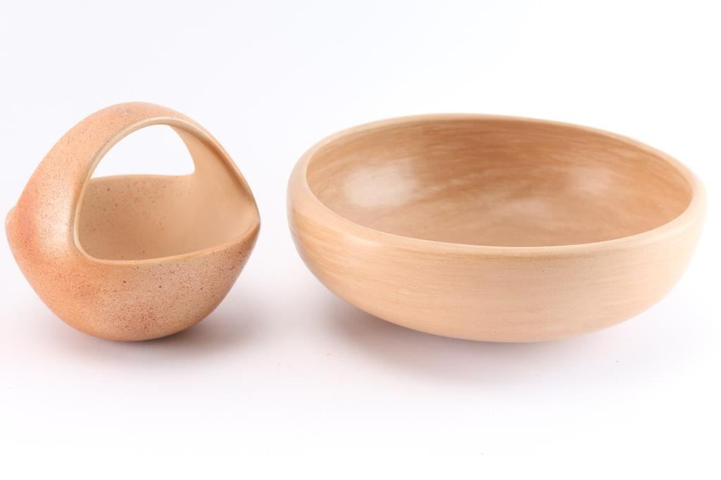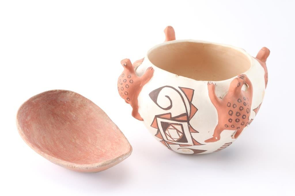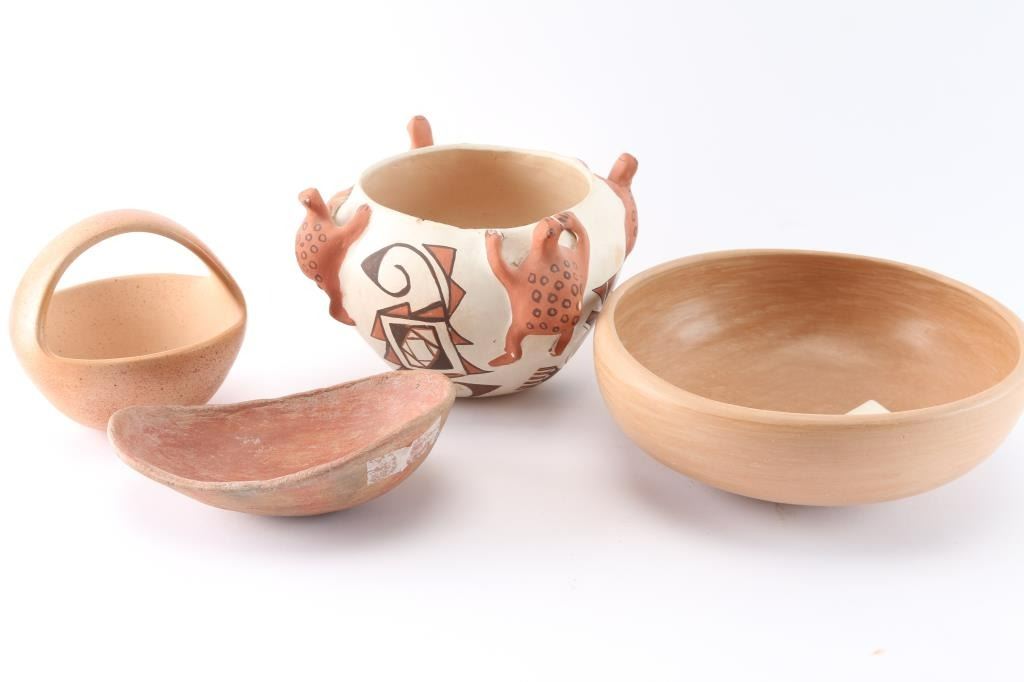 (1) Frog pot with 4 frogs, signed M. Lahaison, measures 5.5" x 8.5". (1) Plainware bowl, signed A. Silas, measures 3" x 8.75". (1) Small Plainware pot with handle, signed Dorothy Ami, measures 5" x 5". (1) Small red clay pot, measures 2.5" x 4.5"