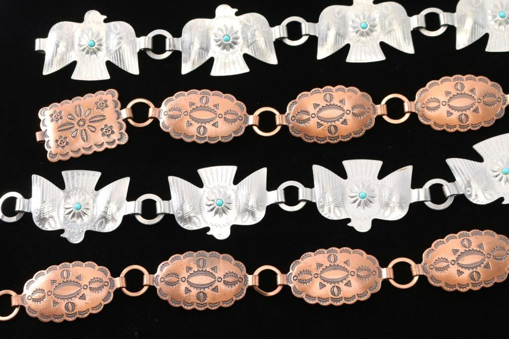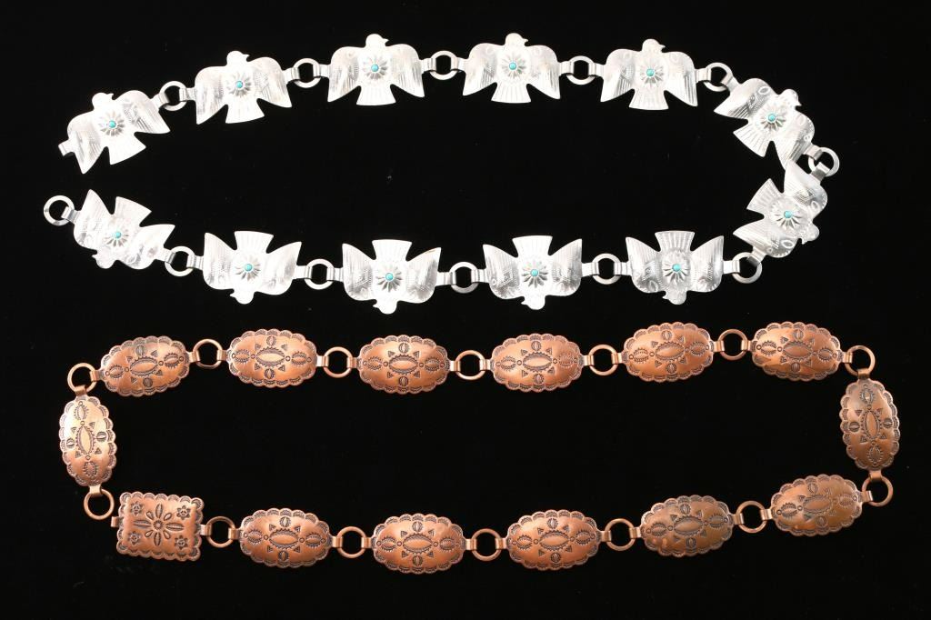 One is copper with stamped Indian design, measuring 31 1/2" end to end; the other is silver tone thunderbirds with stamped design and turquoise bead in each, measuring 29 1/2" end to end.