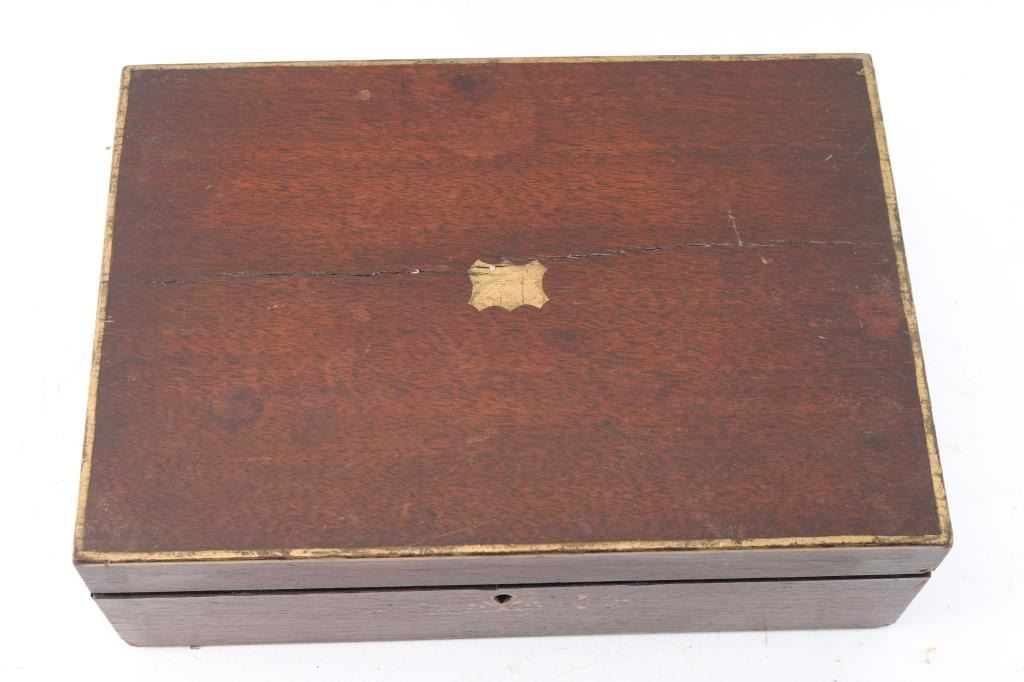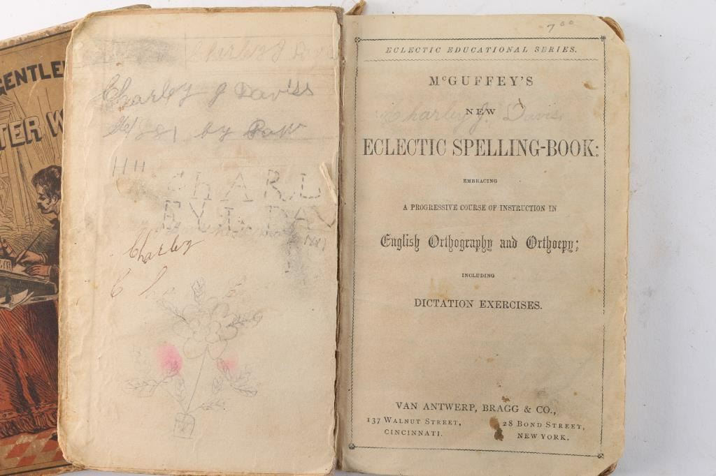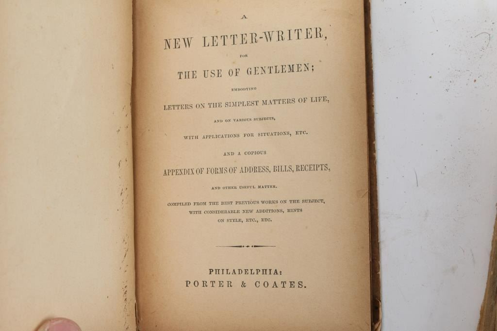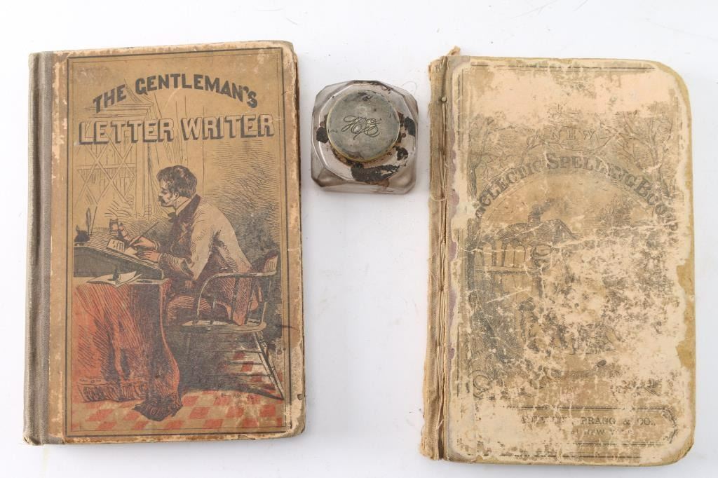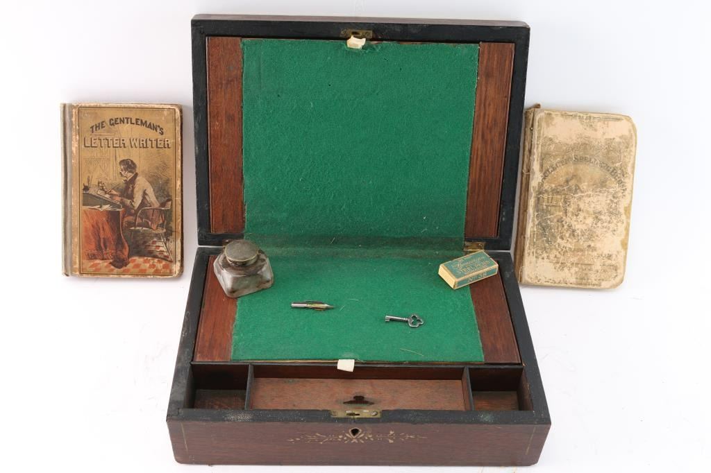 Wooden lap desk measuring 11-1/2"W x 8"D x 2-1/2"H. Opened up reveals a green felt writing surface. A compartment in the lid opens for storing paper. In the base is a compartment with an inkwell with lid and a place to store your pens. The writing surface opens up for additional storage. Includes two books: "Eclectic Spelling-Book" and "The Gentleman's Letter Writer".