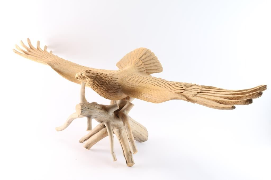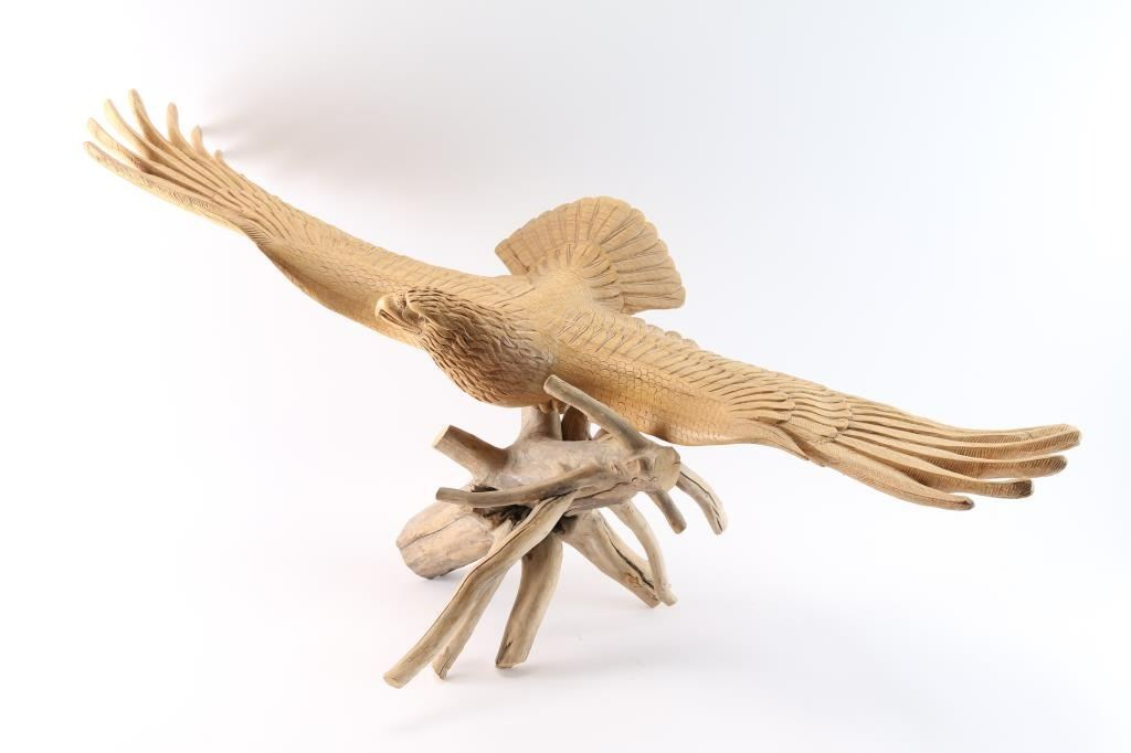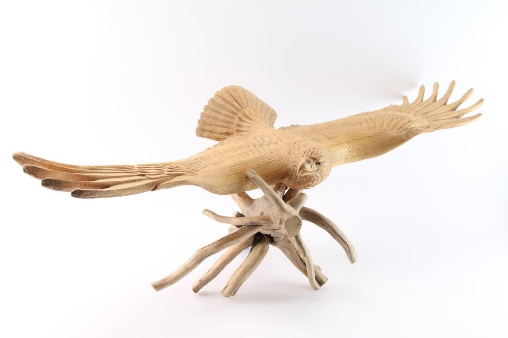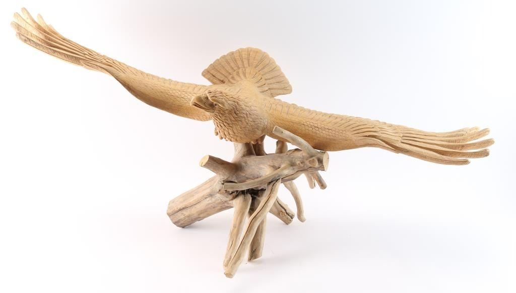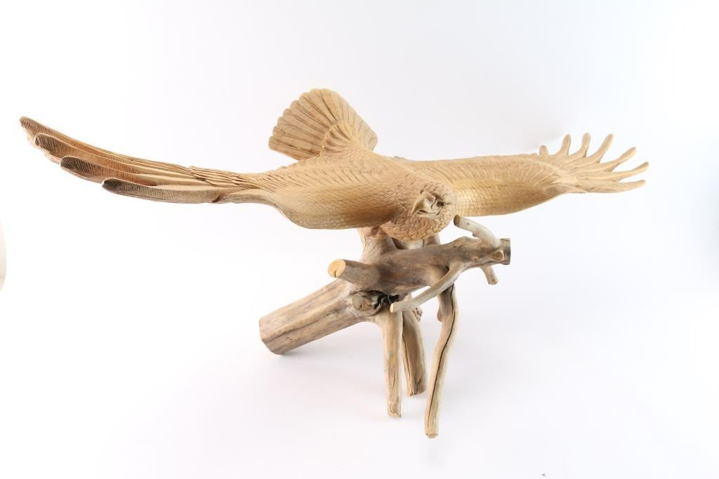 Beautiful Eagle soaring with it's wings spread and feet tucked, carved in great detail. Mounted on a driftwood stand. Measures: 14"H x 38"W x 14"D. Outside shipper required or buyer arrange pick up.
