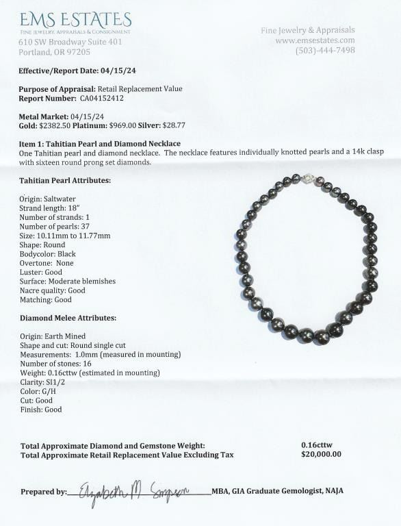 Luxurious Pearl Necklace featuring graduating 10.00-12.00 mm Tahitian Pearls with rich color tones and high luster. Beautifully accented set with a Diamond studded clasp featuring 16 round cut Diamonds with G-H colors and SI clarity. Elegant Fine Pearls, Collectors Piece. Full Retail Appraisal - $20,000.00.