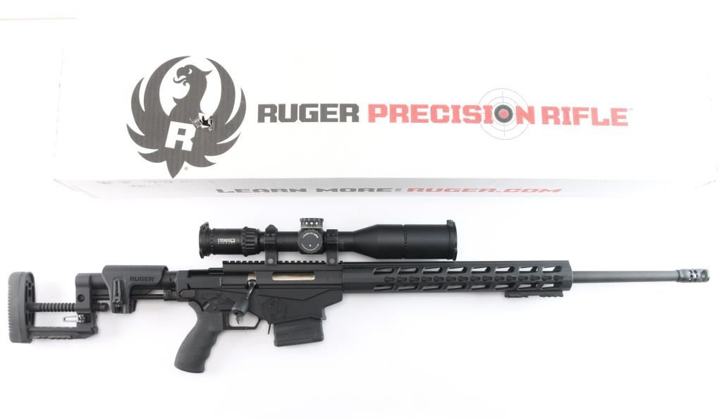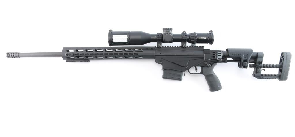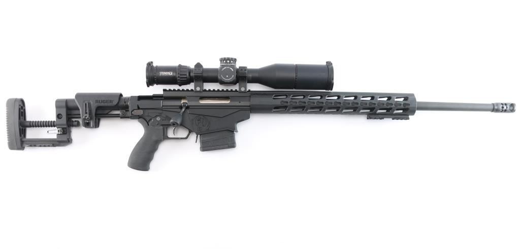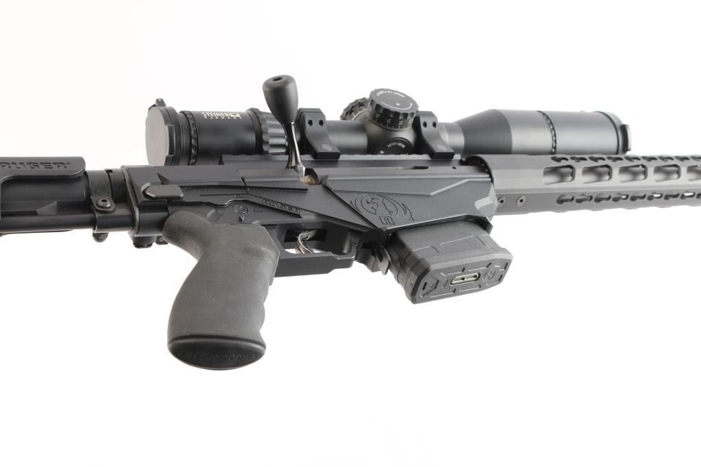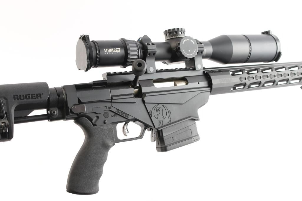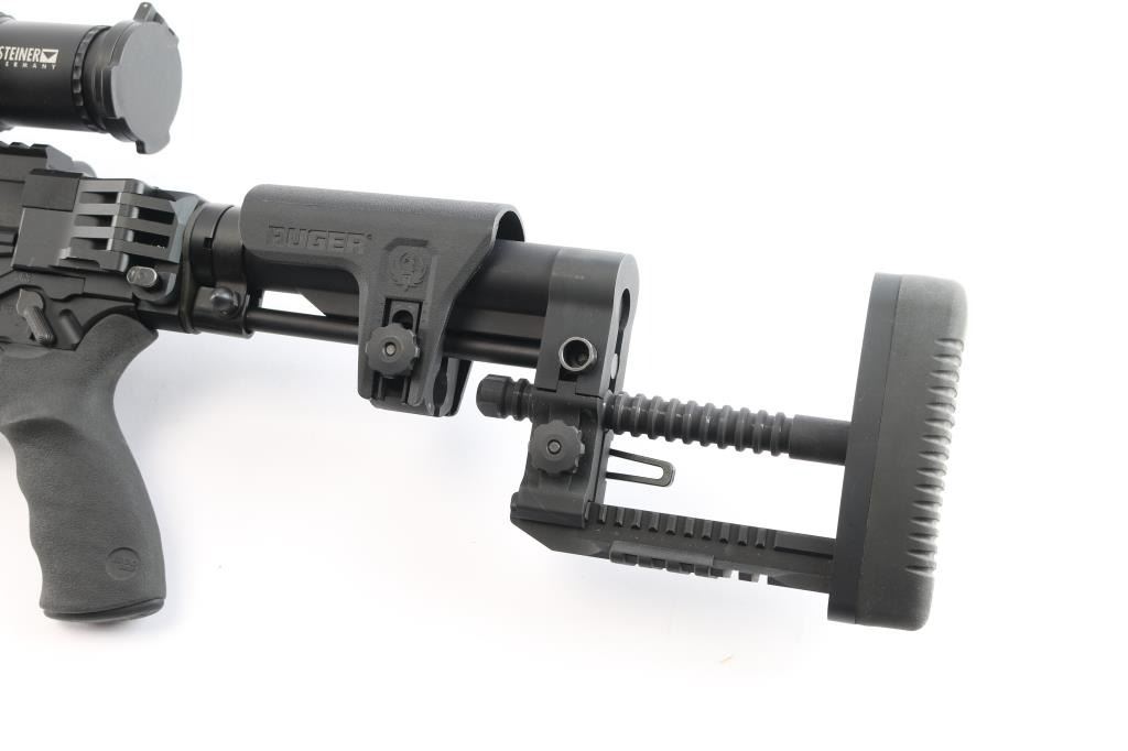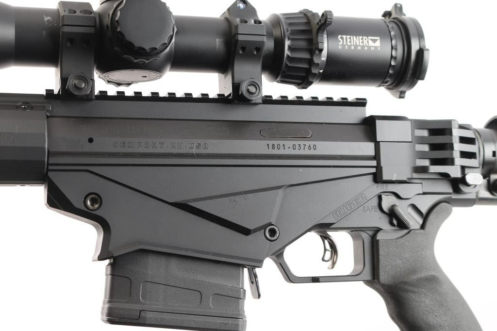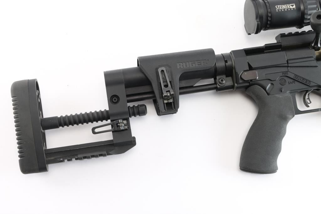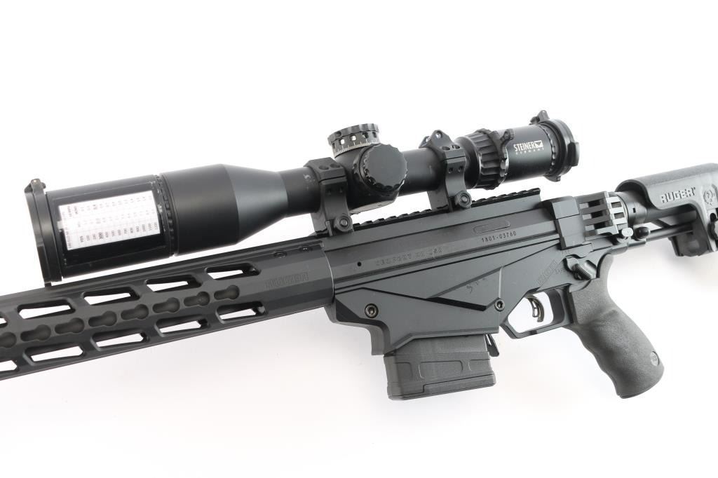 Magazine fed bolt action target rifle. Features matte black finish, heavy contour 24” barrel with ported muzzle break, three-lug bolt with 70 degree throw & oversized knob, Marksman Adjustable trigger, accepts detachable magazines, one 10 rd magazine provided, manual safety, Ruger 15” aluminum free-float key-mod handguard added quick detach swivel socket added, Picatinny rail section attached to handguard at 6 o'clock position, AR style Ergo pistol grip, Ruger left-side folding shoulder stock with fully adjustable Ruger butt stock on AR style tube. Bore is bright, appears very good, needs cleaning. Retains 95% finish with handling marks. Mounts a Steiner T5Xi 3-15x50mm scope, illuminated SCR reticle (not tested - battery not present), Steiner rings, extended sun shade, excellent condition, clear view. Includes factory boxes for rifle and scope..