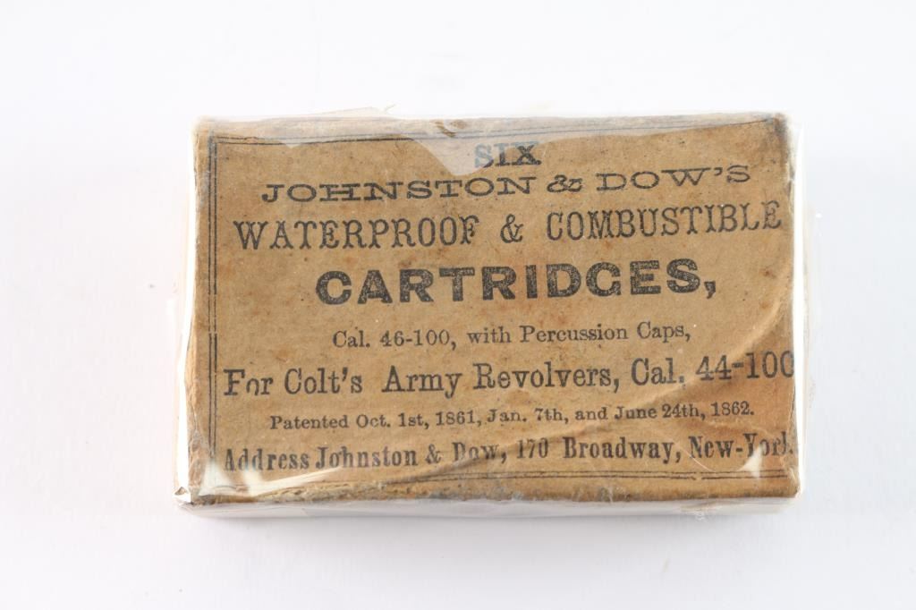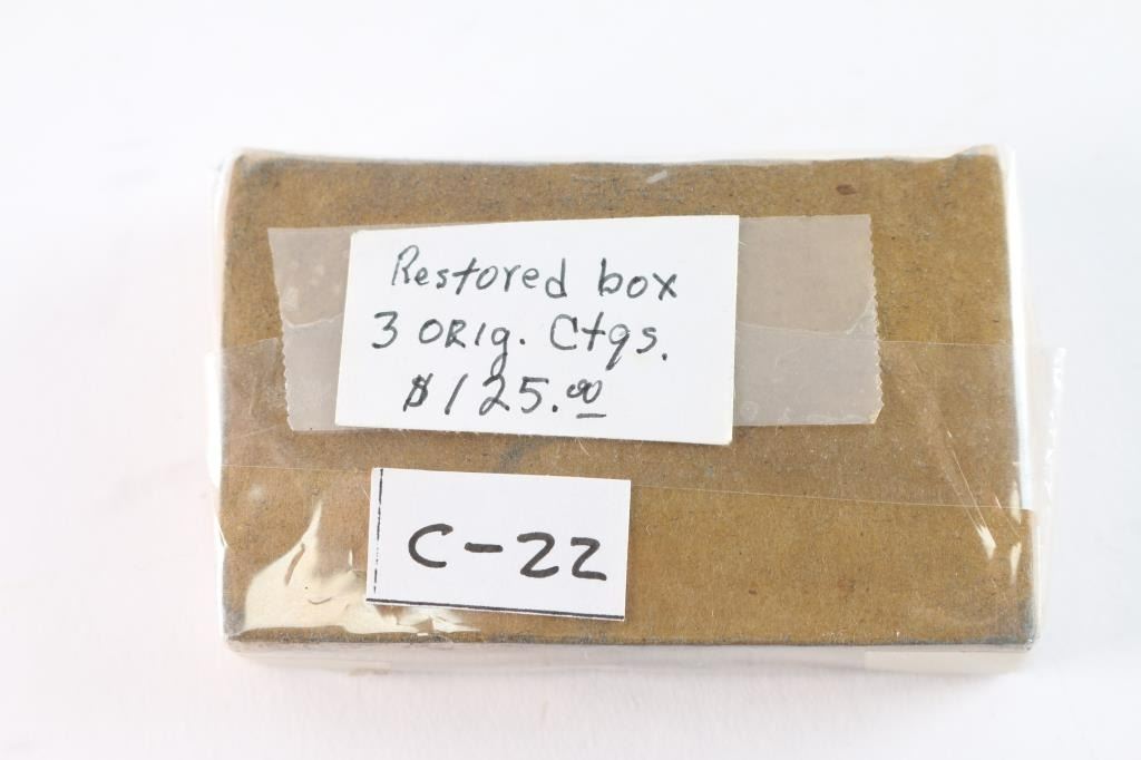 For Colt's Army pistol 44-100 Cal. by Johnson and Dow. John Kopec's note on side reads, "3 original cartridges, box restored". Near fine restored (re-gluing and paper repair - expert job). The John Kopec Estate collection.
