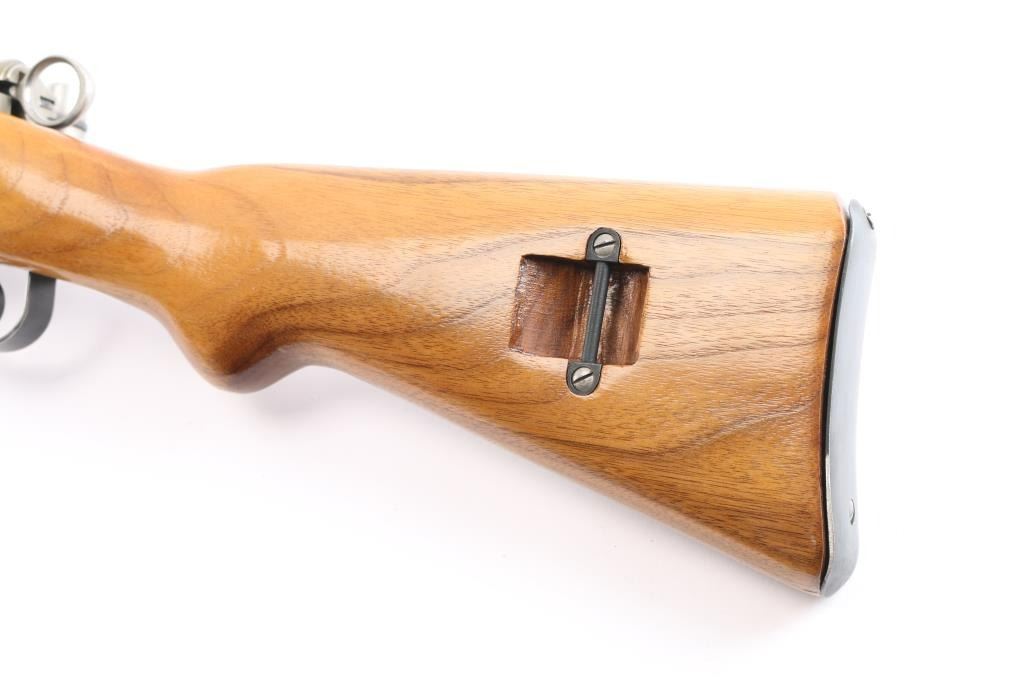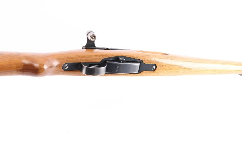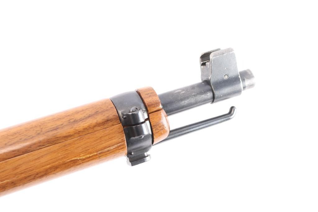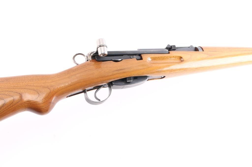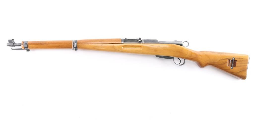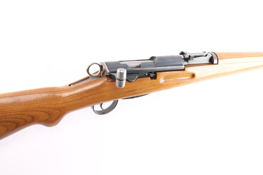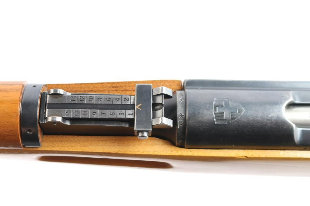 Schmidt–Rubin' Swiss military straight pull bolt action rifle. Manufactured 1957. Features blued finish, wood semi pistol grip stock, 25" barrel, bayonet lug, stacking hook, blade front sight inside protective ears, tangent rear sight, detachable magazine, "beer barrel" shaped aluminum bolt knob, ring cocking piece. Swiss cross in shield on chamber. Imported by Simpson's Ltd, etched on bottom metal. Bore is excellent/bright. Retains about 96% coverage of blued finish, showing some handling wear. Bolt assembly is mostly bright polished, some blued pieces, overall in very good condition. Stock is excellent Original serial number matched on receiver, barrel, bolt, magazine.