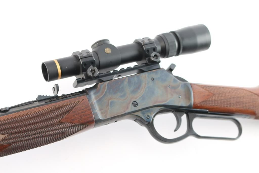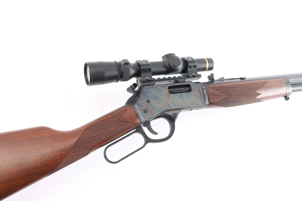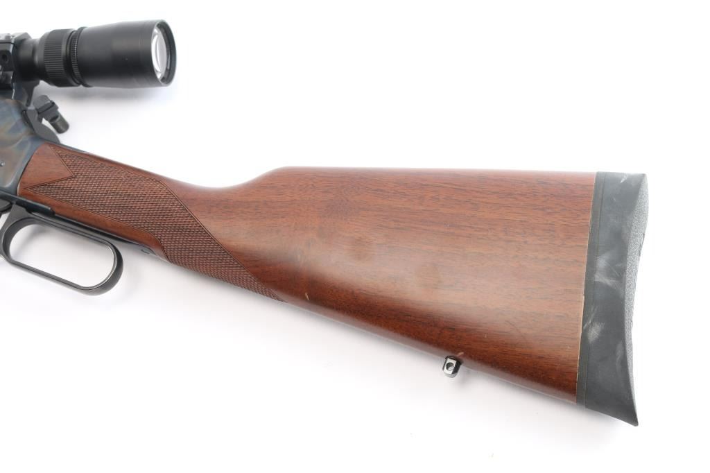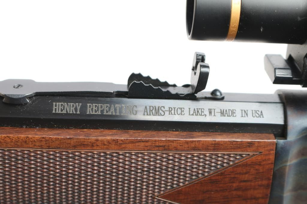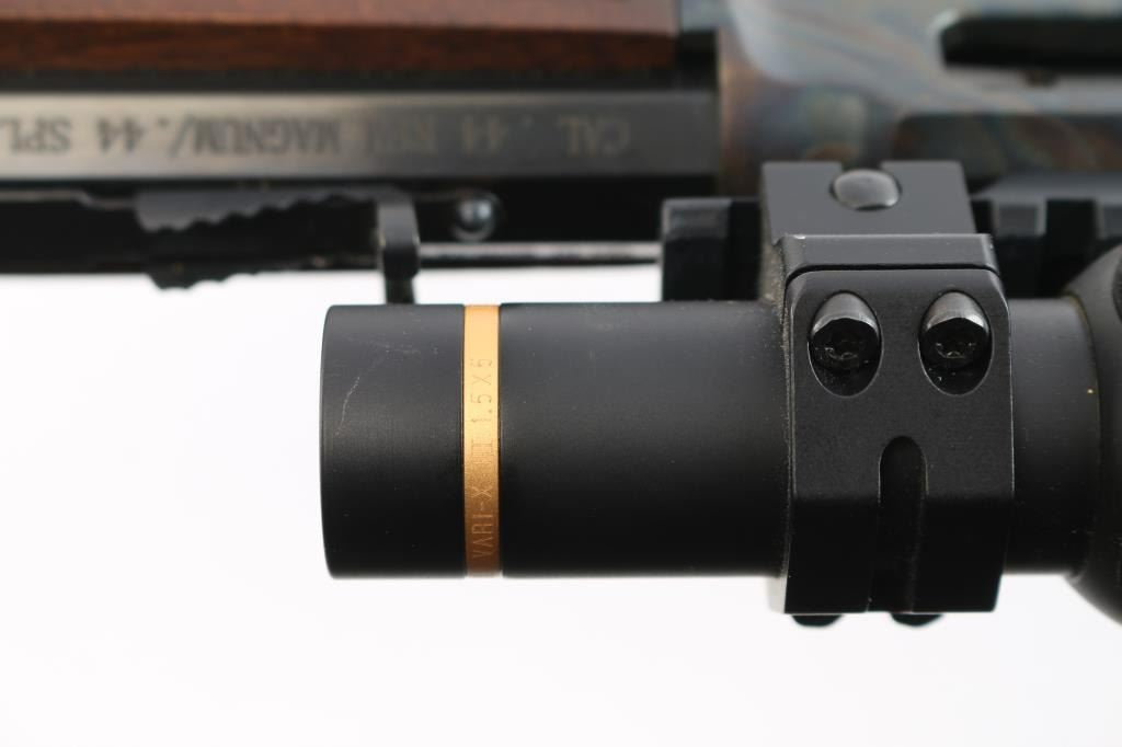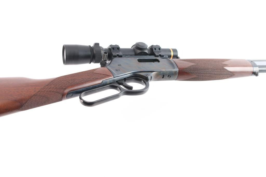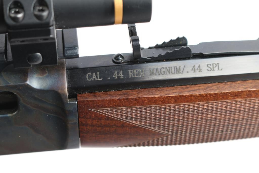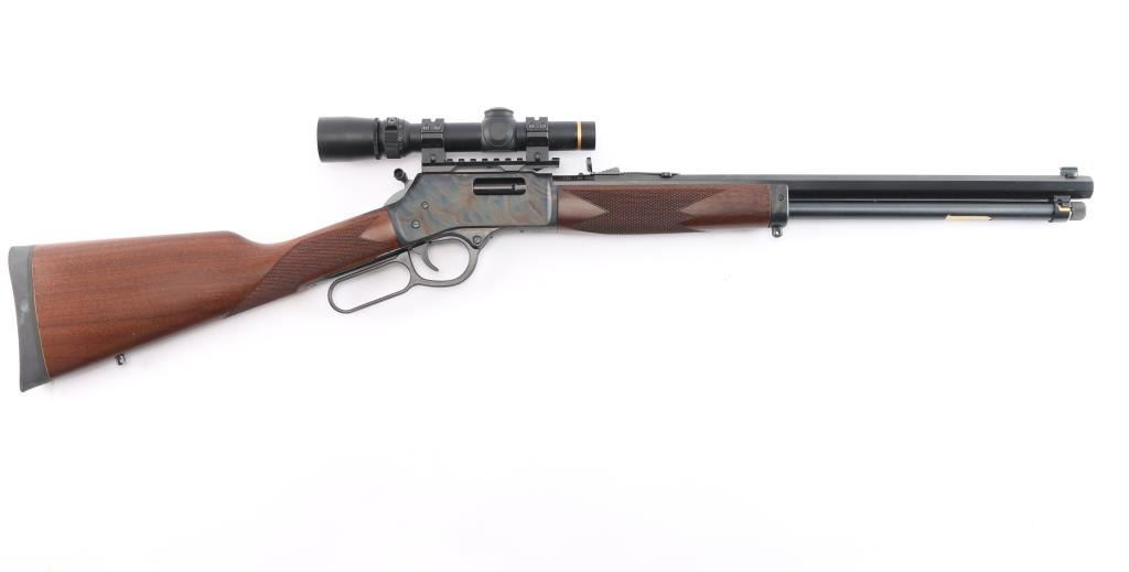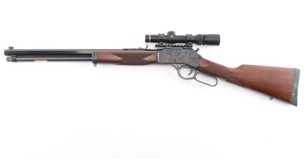 SN: BBSCC001480. Lever-action rifle chambered in .44 Remington Magnum/.44 special. "Big Boy Steel" American made by Henry. Barrel address is Rice Lake WI. 20" 1:20 twist octagonal barrel with brass bead front, fully adjustable semi-buckhorn with diamond insert rear sights Checkered American walnut stock/forearm sling swivel studs, factory black rubber buttplate. Full length magazine. (10 rds) Transfer bar safety. Blue finish with case colored receiver, drilled/tapped. Smooth trigger. Finger extension installed on hammer. Mounted with a Leupold Vari-X III1.5x5 scope on one piece multi-slot base, duplex reticle, clear optics. Bore is pristine, cction is smooth/tight. Metal/wood are excellent. Rifle appears in new condition.