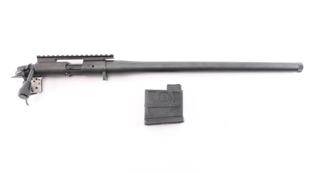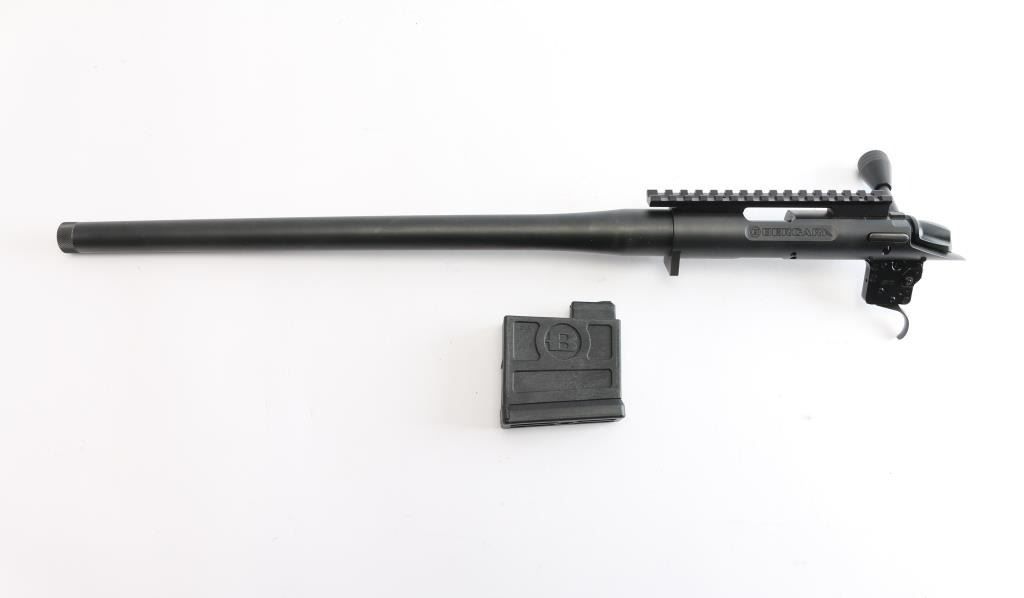 Bergara B-14 Trainer Barreled Action, 22LR. 18" heavy, free floated threaded barrel, matte black finish, 410 Stainless Steel, Twist: 1:16", Barrel Thread: 1/2X28. Multi-slot scope base installed. Manufactured in Spain and ready to drop into a Remington 700 chassis, this Bergara B-14 Trainer barrel action is chambered for .22 LR and comes with a 10 round ACIS patterned magazine. Complete, like new condition, bore is pristine.