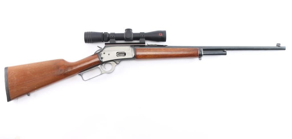SN: 09008881. 'Classic' American made lever action repeating rifle chambered in .218 Mashburn Bee. Features a blued finish, 21 3/4" JM marked barrel, 1/2 length tube magazine, blade/bead front sight, adjustable semi-buckhorn rear sight, drilled & tapped receiver, serrated hammer spur, smooth trigger, push button safety, smooth walnut forend and straight grip shoulder stock with factory black rubber recoil pad, sling swivel studs. Rifle exhibits approximately 98% of it's original finish showing only light handling marks & wear. Action is smooth, bore is excellent and wood stocks are overall very good/sound with minor scratches/scrapes. Mounted with a Redfield Revolution 2-7x33 scope, duplex reticle, clear optics. one piece base. Manufactured 1991.