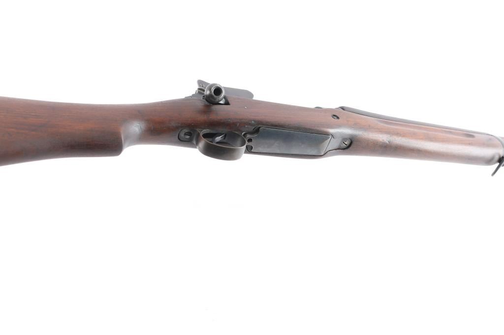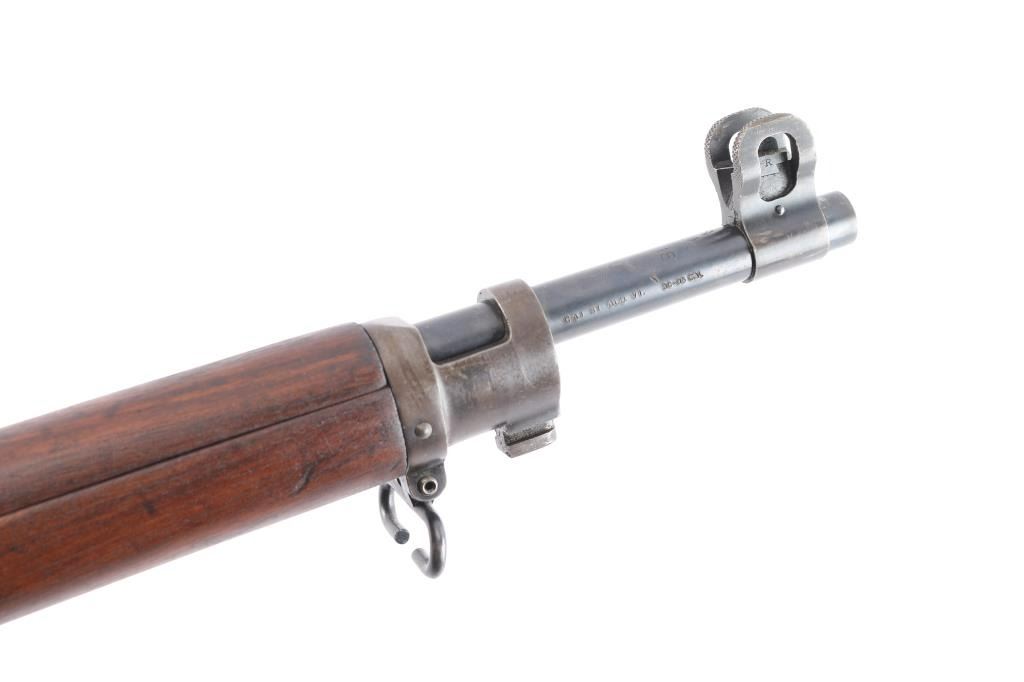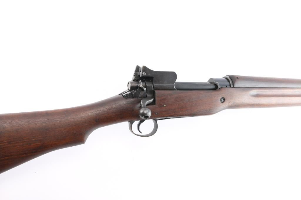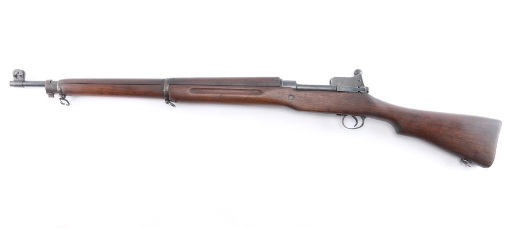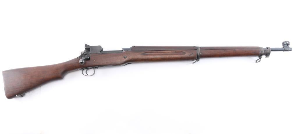 American military bolt action rifle manufactured for use in WWI. Features dog-leg bolt handle, protected blade front sight, folding ladder rear sight with peep apertures, approx 26 inch barrel, manual thumb safety, sling swivels, stacking swivel, storage compartment in butt, blued finish on metal parts, wood stock and handguard. Remington barrel stamped "R 4-18" under flaming bomb, cocking piece stamped "N.S. eagle head" and "W" (Winchester), bolt handle stamped "684326",manufactured by Eddystone (a subsidiary of Remington) in July 1918. Front sight stamped ".060", sight base stamped "R". Eagle head and "14" cartouche on wood behind triggerguard. (Feint) Eagle Head proofs on various parts. Blue on metal parts is about 85% with minor edge wear, handling loss and some rubs. Wood is overall very good with a hairline crack in the handguard Bore is fair to good, strong rifling, frosting in the grooves. Action is smooth. Imported by CAI, marked on right barrel.