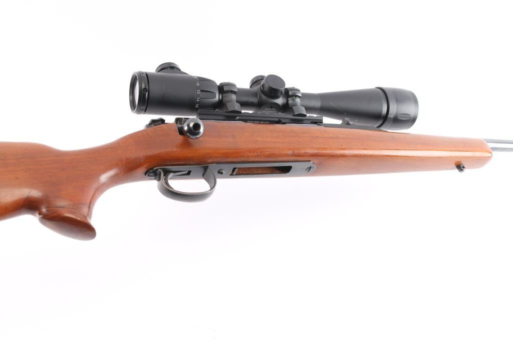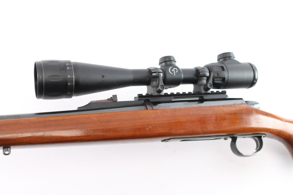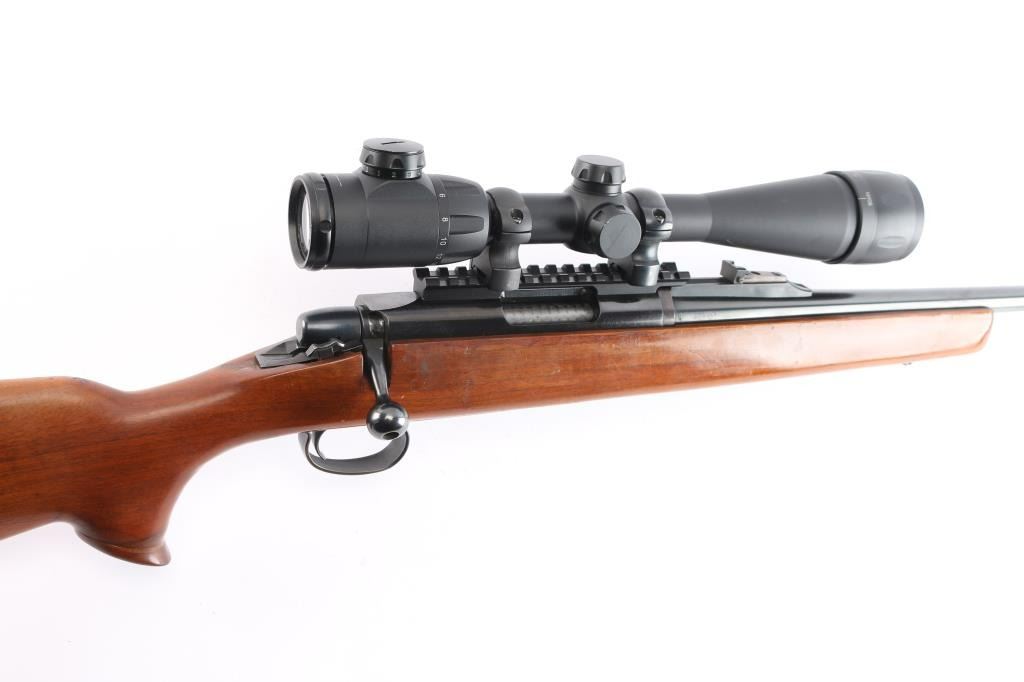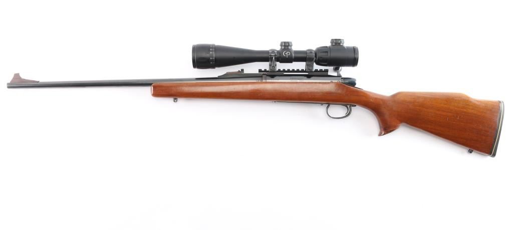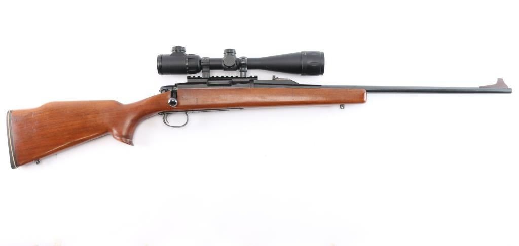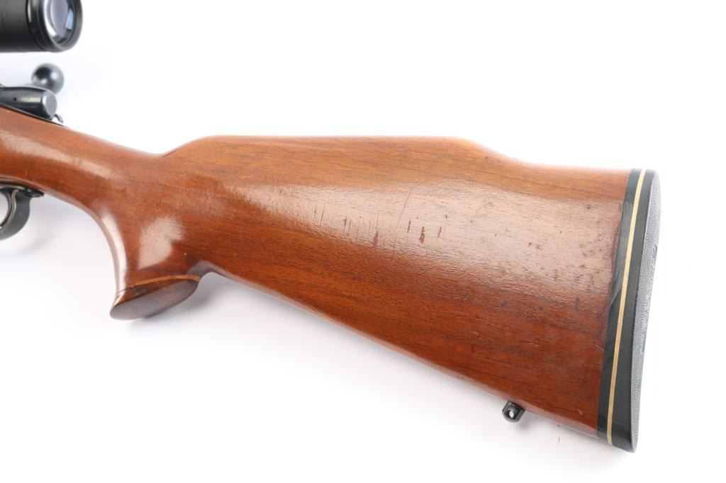 Bolt action rifle, dated coded 1968, second year of production. Features blued finish, 24" barrel with raised large blade front and u notch adjustable rear sights, detachable magazine No magazine included), manual thumb safety, Redfield one piece EGW multi-slot base & quick release rings mounted with a Center-Point 4-16x40 AO Rifle Scope, red illuminated BDC reticle, clear optics. Smooth hardwood stock features Pachmayr rubber buttplate, flared grip cap, sling studs. Bore is very good/bright, action is smooth,retains about 95% finish with handling marks. Stock is very good with few small dings. No Magazine.
