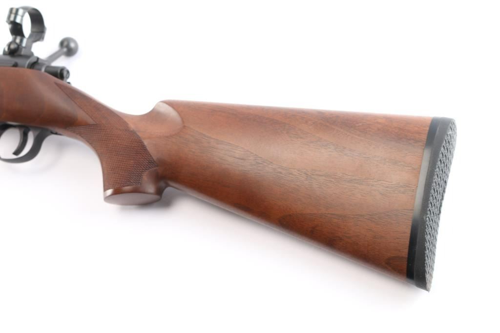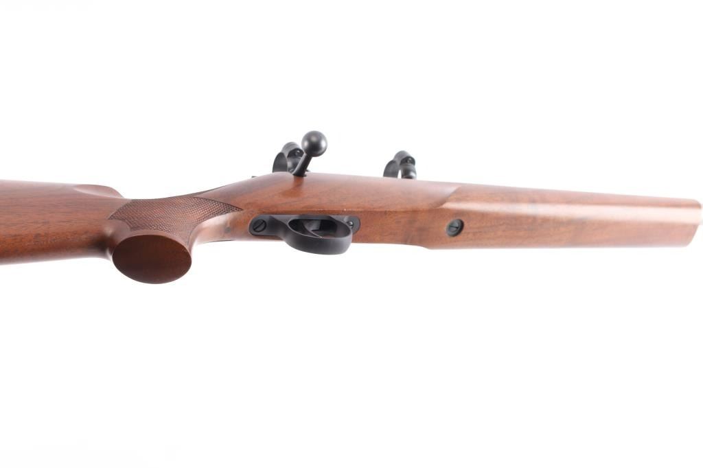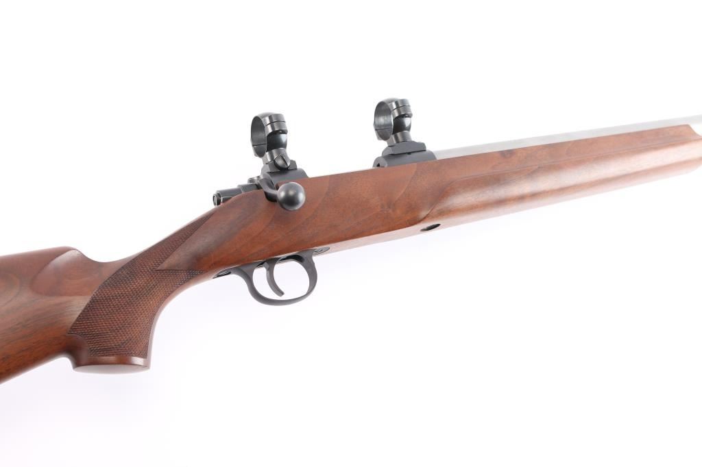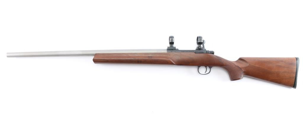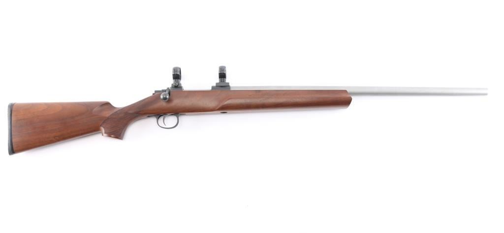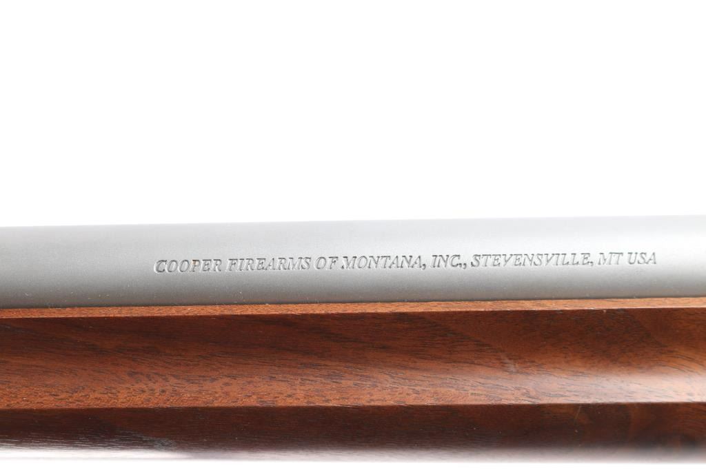 Cooper Firearms of Montana, Inc. single shot bolt action rifle. Features an approximately 24" medium to heavy contour stainless barrel, smaller sized centerfire action with no magazine cutout, straight bolt handle, manual safety on the right side of the tang, two piece blued steel Leupold type bases (no optic), checkered semi pistol grip walnut stock with smooth beavertail forend, thin rubber butt pad. original receiver bluing is approximately 99%, and matte stainless barrel is also 99%. Bolt cycles smoothly and the bore is excellent. External condition is excellent with few minor handling marks on the top of the buttstock.