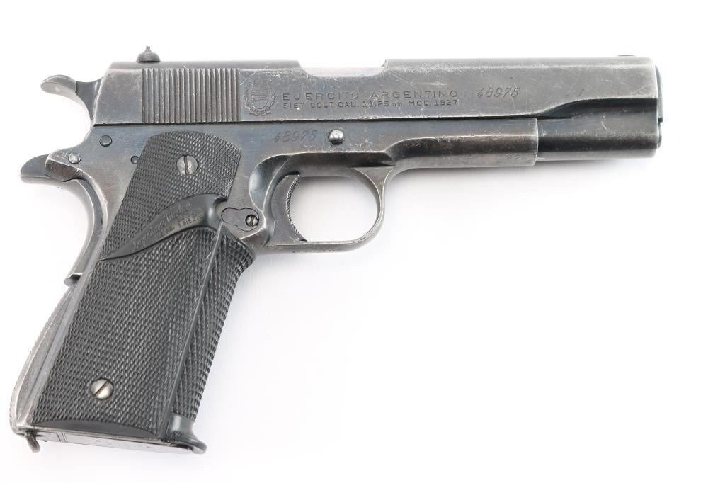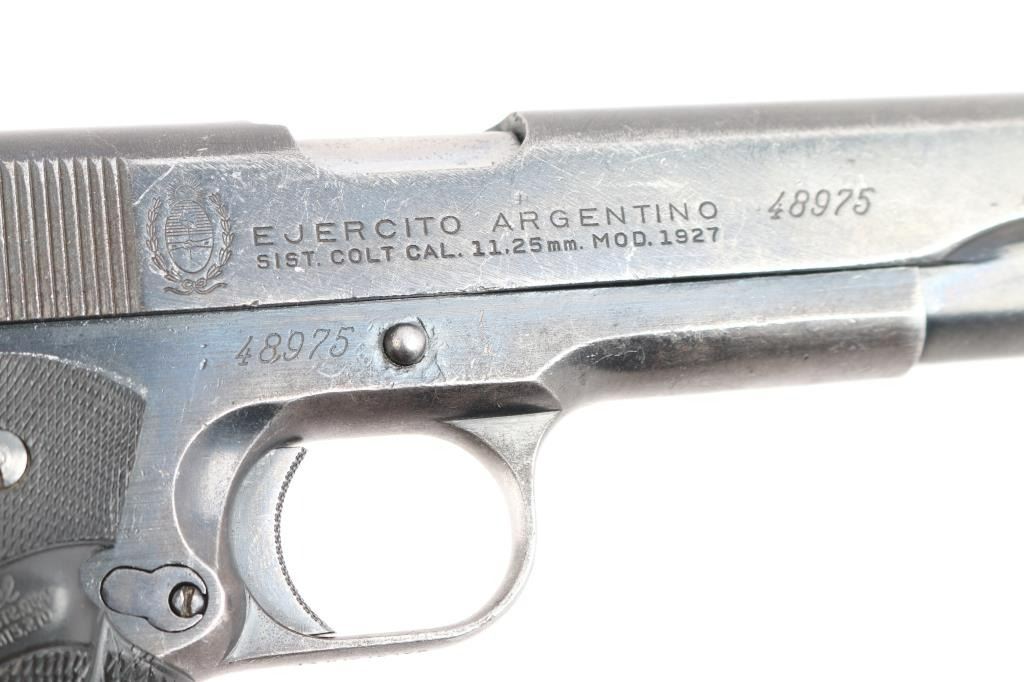 Produced by DGFM FMAP in Argentina after 1945. This is a Colt pattern 1911 made for the Argentine military. The left side of the slide is marked “D.G.F.M. – (F.M.A.P.). The right side of the slide is marked the Argentine crest, “EJERCITO ARGENTINO / SIST. COLT CAL. 11.25mm. MOD. 1927”. These guns are made tough as a Colt with parts that are interchangeable. It has a blued finish. 5" barrel, low profile blade front sight, dovetailed u notch rear sight, arched knurled mainspring housing, manual & grip safety, lanyard loop, knurled trigger and hammer spur with black rubber checkered Pachmayr grips. Metal finish looks okay but worn, showing plenty of signs of use and handling with nicks, scuffs a loss of blue on in spots on both the frame and slide. Bore is very good/bright. Grips are a little worn but good. Comes with one Colt 8-rd magazine.