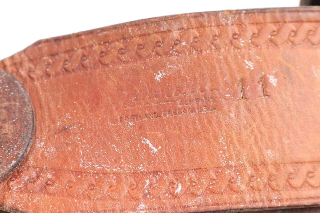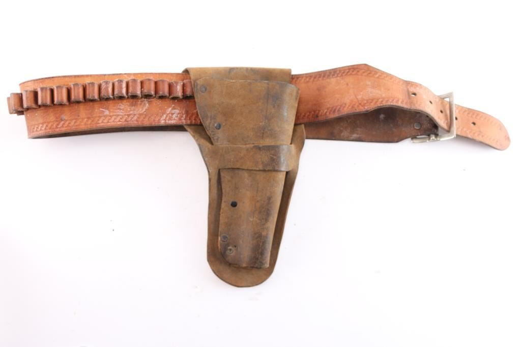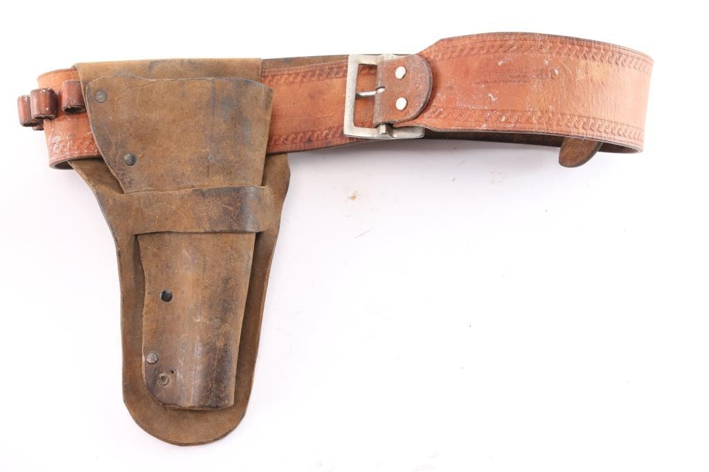 With .45 Colt size loops stamped "Lawrence (size 40)" with hand made outer single loop holster for Colt S.A. 5-1/2". Belt very good, holster fair to good.