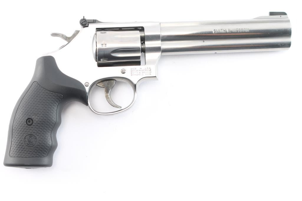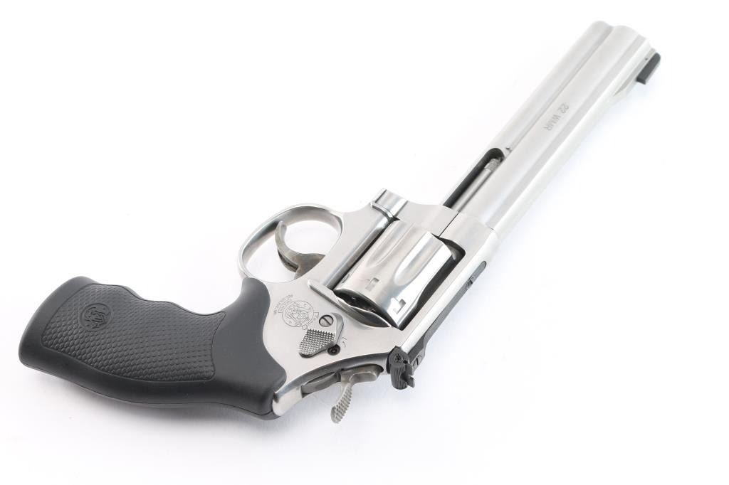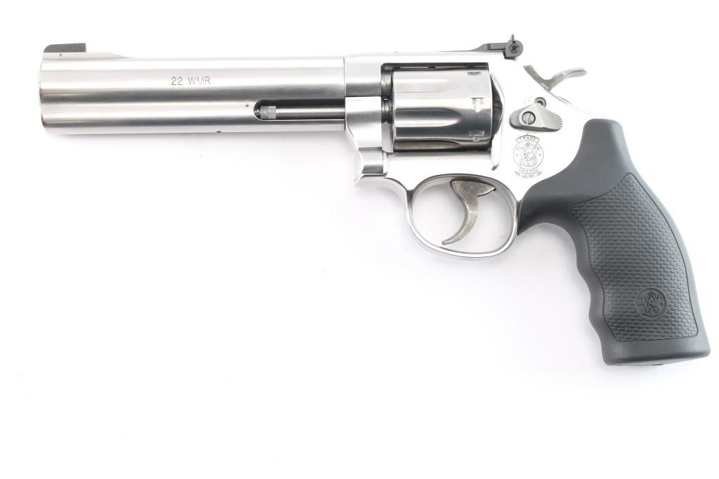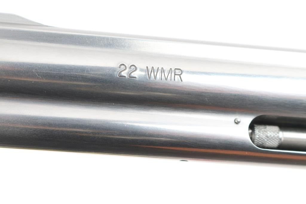 Smith & Wesson stainless steel eight shot revolver chambered for .22 Magnum cartridges made in Springfield, MA. It has a 6" barrel, smooth curved trigger, full underlug, fluted cylinder, raised blade front sight, adjustable rear sight, passive firing pin, knurled hammer spur, wrap-around rubber factory grips with finger grooves and S&W logos. Metal finish looks excellent at approximately 99%. Bore looks excellent and bright. Manufactured circa 2003-2005.
