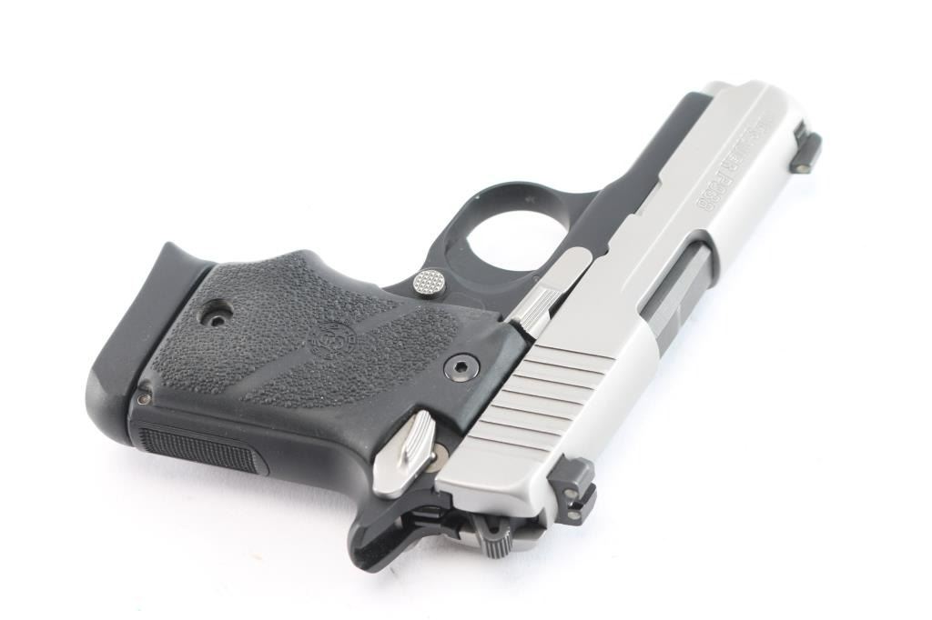 American made, single action semiautomatic pistol features 3" barrel, fixed 3 dot night sights in dovetails (do not glow), black rubber fingered groove Hogue grips, checkered backstrap, ambidextrous manual safety, metal guide rod, serrated curved trigger, checkered magazine release. Finish is 2 tone with a black frame and brushed stainless slide. Bore looks Excellent . Overall condition is 98%, with few light handling marks on the top of the slide, a light scratch below the slide stop, and external barrel finish wear. Includes spare magazine, cable lock, a Galco leather inside-the-waistband holster, manual, and original plastic box (missing latch).