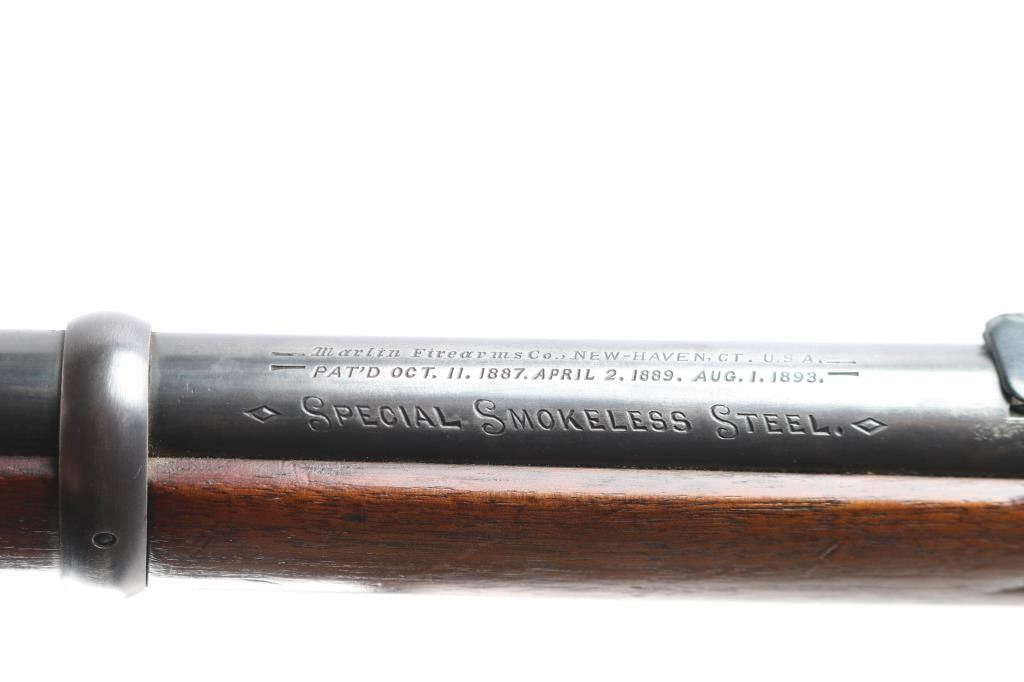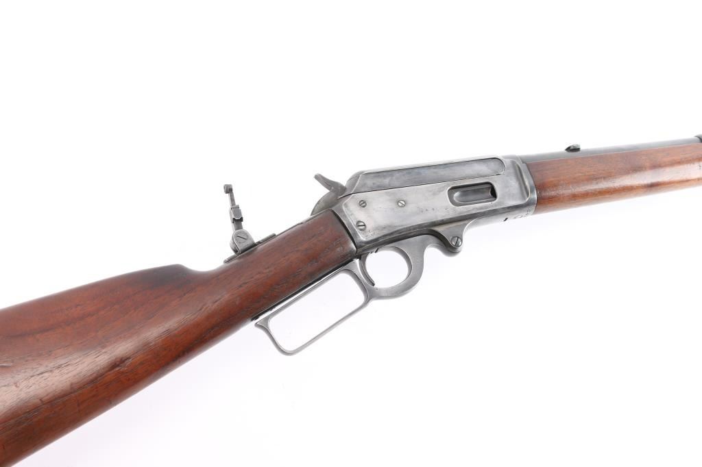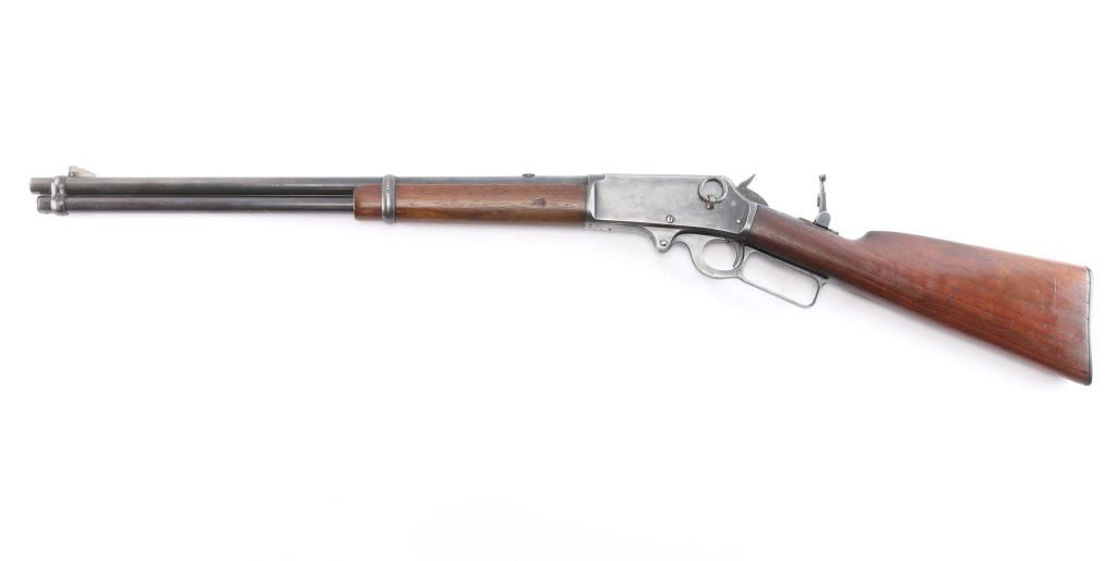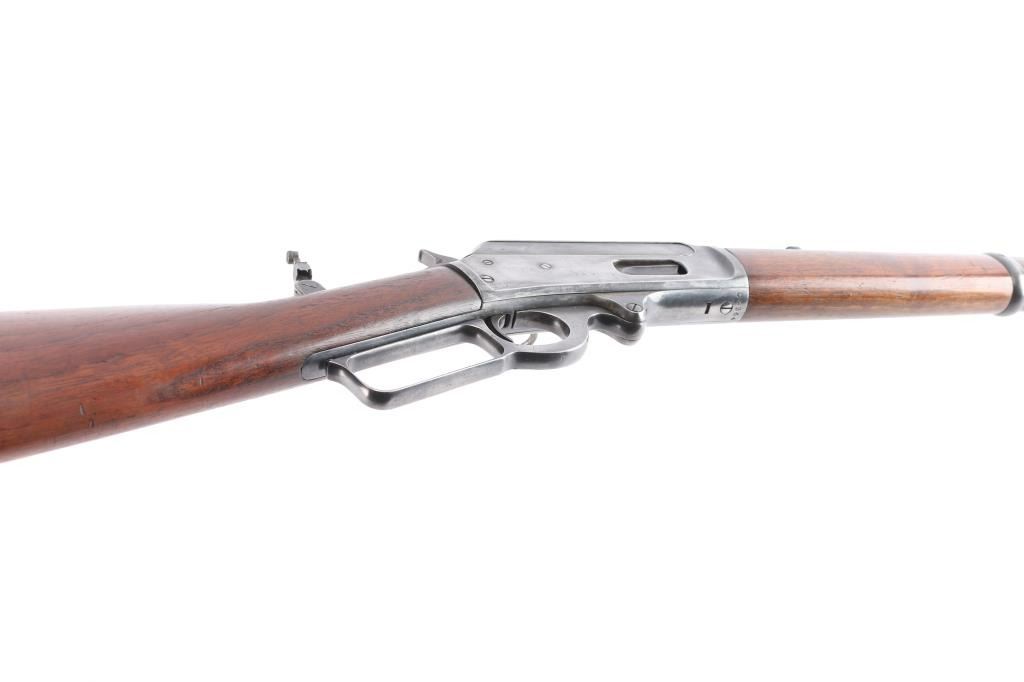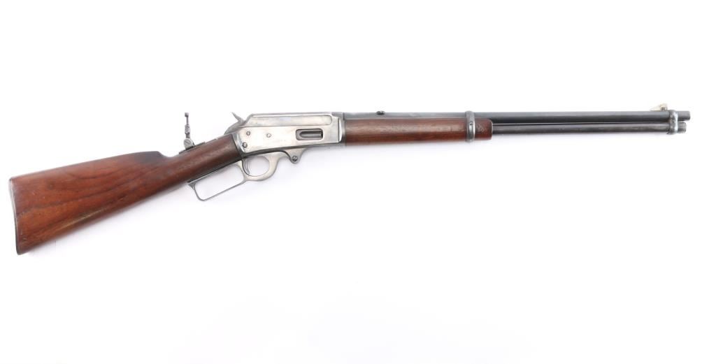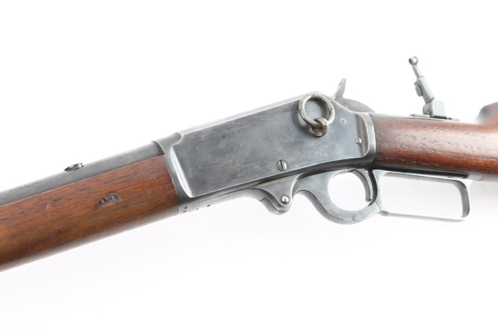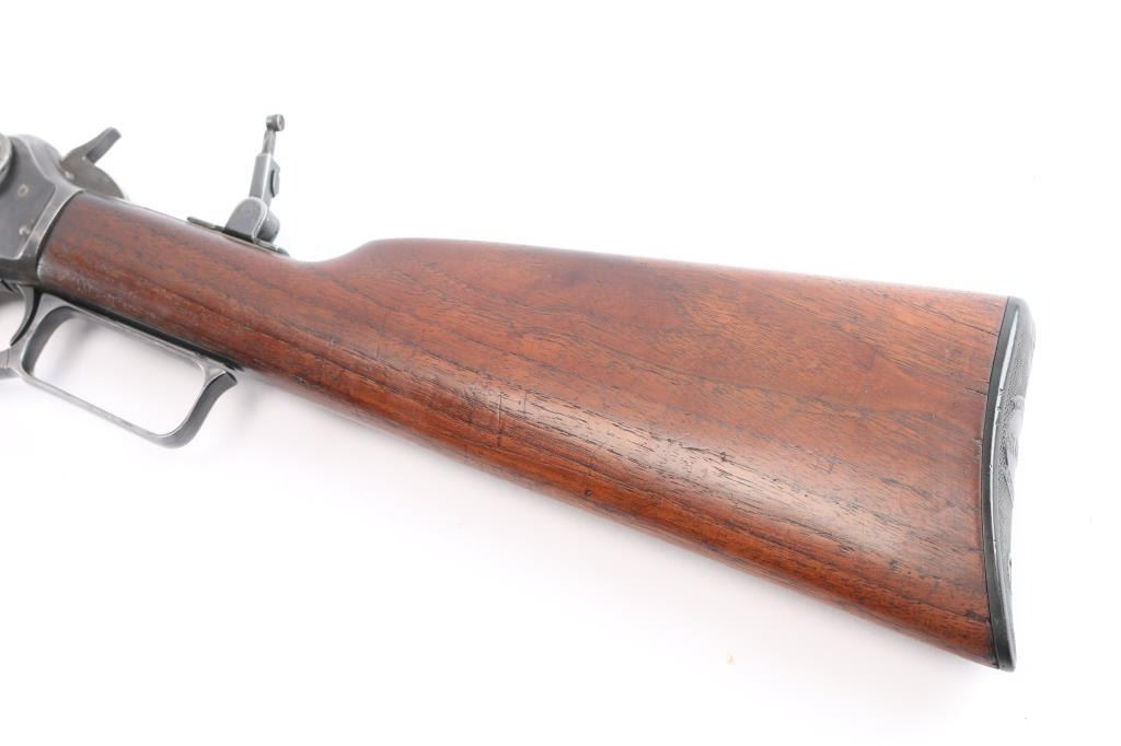 Vintage lever-action saddle ring carbine chambered in .25-36, a Marlin calibre based on the .32-40 Marlin Ballard case. Manufactured around 1918, during World War I. The top barrel flat is marked with the two-line address/patent dates ahead of the rear sight "SPECIAL SMOKELESS STEEL", behind the rear sight is ".25-36 M." on top at the breech. The top of the receiver is marked "MARLIN SAFETY", "MARLIN/1893" on the upper tang and the serial number is on the underside of the receiver. Equipped with a full length tube magazine. Blue finish and magazine mounted with a smooth walnut forearm with a steel end cap and straight grip stock with factory checkered hard rubber buttplate. 20" round barrel with modified sheet metal squared blade, rear sight removed, steel insert in dovetail, vintage Marble peep sight installed on tang, marked "M.S.A. Co. Gladstone, Mich." Original saddle ring. C prefix serial number, manufactured 1918-1919. Bore is good, strong rifling, light frosting in grooves, action is smooth/tight, wood is overall very good/sound with some minor dings/dents and the original blue is about 605 with handling wear/finish loss mostly on the lower barrel & receiver.