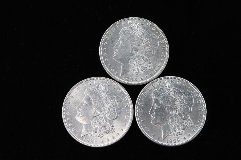 Includes: (3) Morgan Silver Dollars. Minted: Philadelphia. Dates: 1888, 1889, 1898.