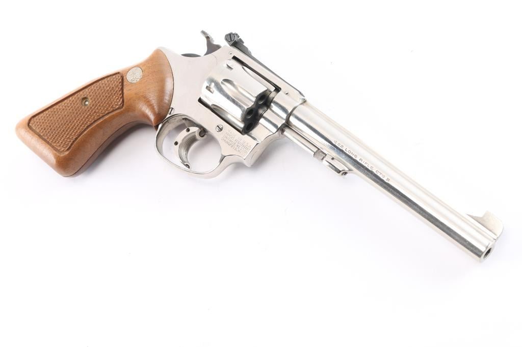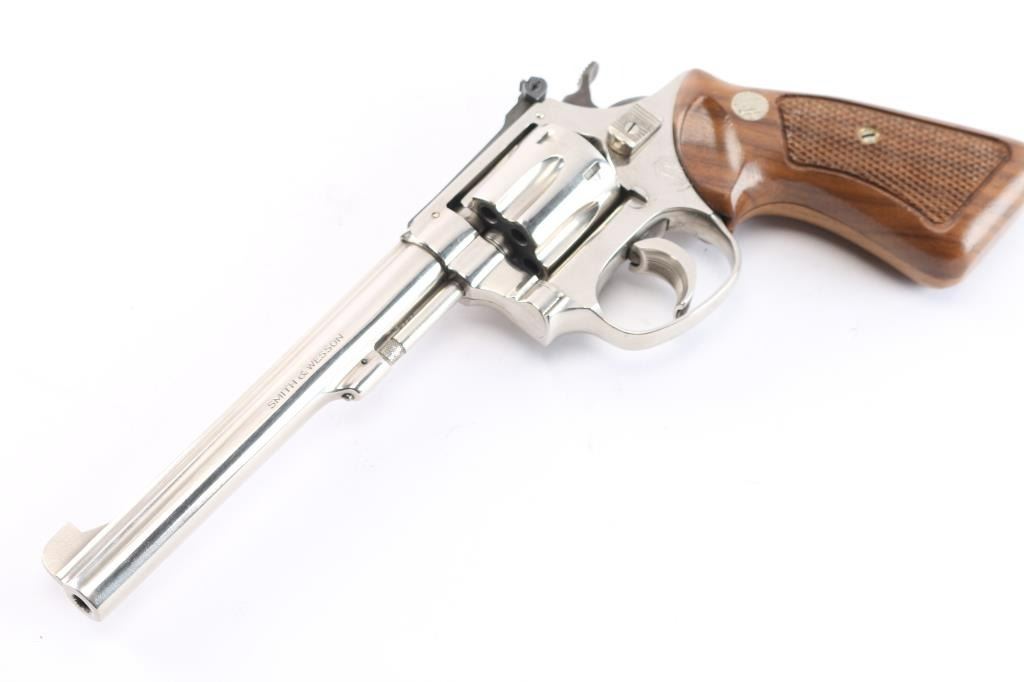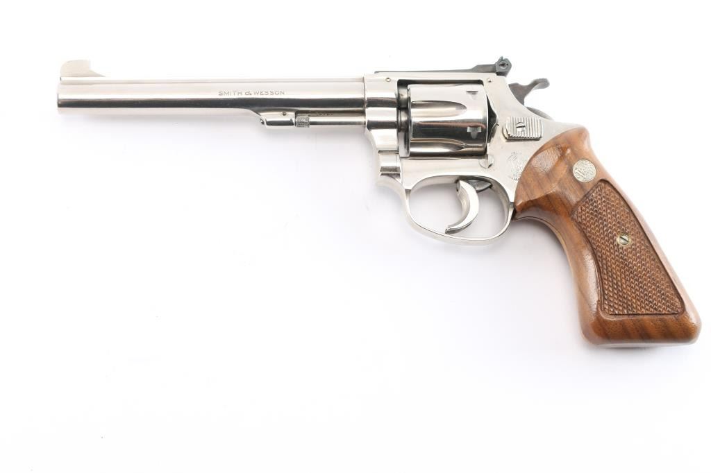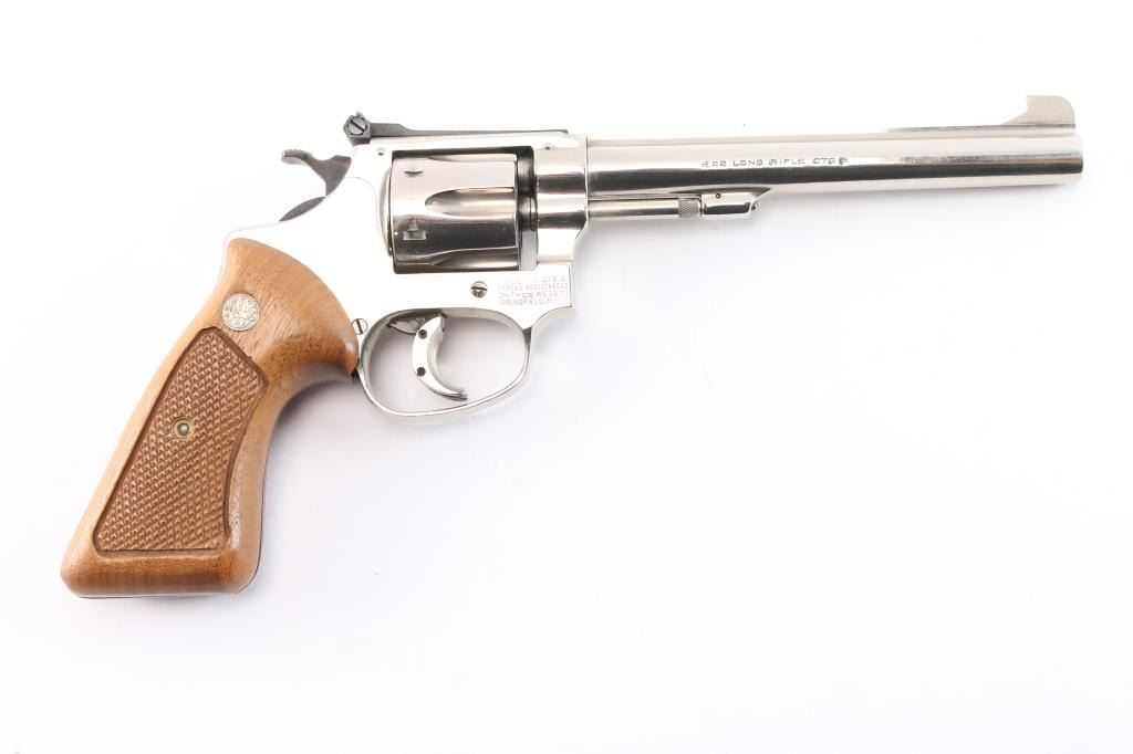 American made Smith & Wesson 6" double action .22 LR revolver, manufactured between 1953-1957. Built on an improved 'I' frame with three side plate screws, hammer safety block, coil mainspring, partridge front sight, micrometer adjustable rear sight, two piece wooden checkered grips with S&W medallions, short underlug, pinned barrel, fluted cylinder, checkered hammer spur, passive firing pin, added wide curved serrated trigger shoe, smooth backstrap, and smooth forestrap. The grips are later production grips without the diamond around the screw. Finish condition is about 98% with the lightest normal handling wear. The bore is excellent, and the cylinder also looks great. The grips are excellent.
