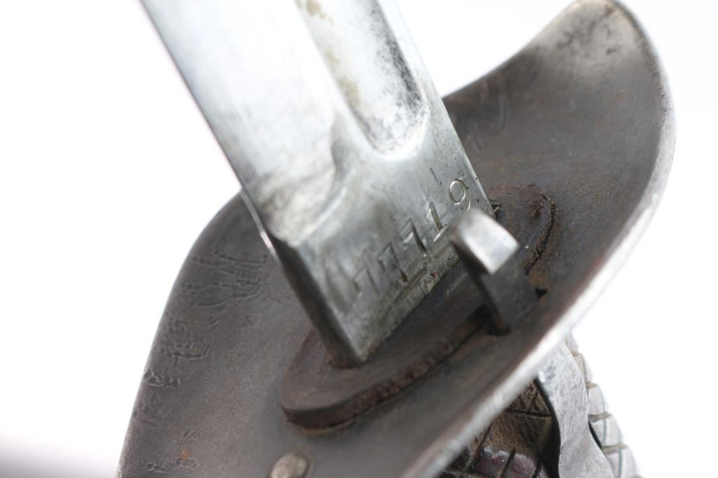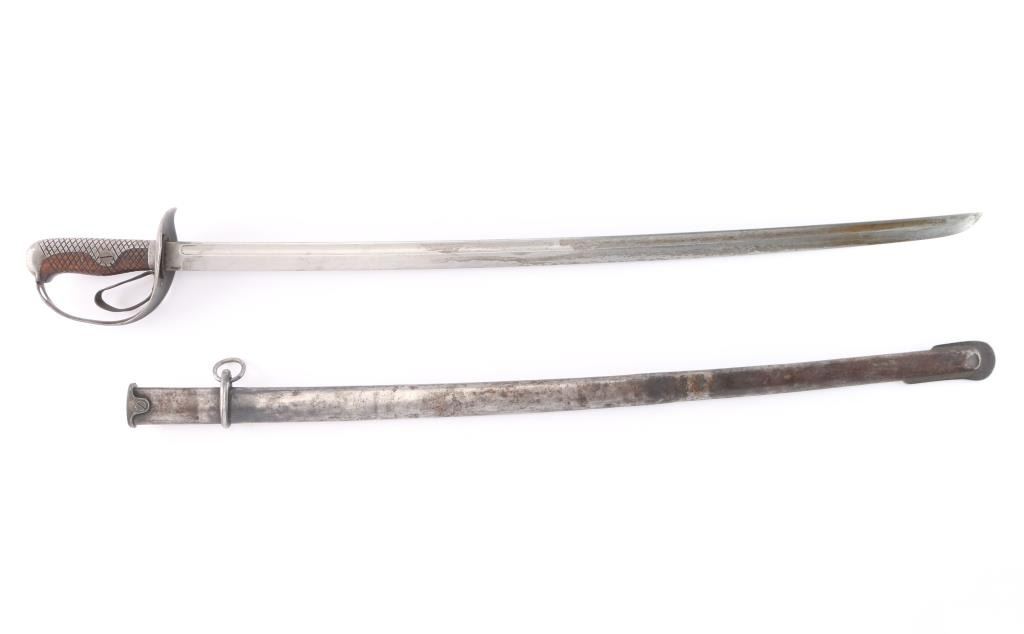 M1889 type 32 sword. The second pattern, known as Otsu,’ was issued to Army NCO's. Machined blade with Katana profile. Saw service Russo-Japanese war, WW1, and WW2. 30" blade, single edge with long fuller below the flat spine. Leather finger loop in guard. Steel guard has a checkered steel back strap and dove head pommel. Checkered wooden grips. Guard marked with the Tokyo artillery arsenal stacked cannon balls, date character for Meiji period (1868-1912) and arsenal control stamps, leather washer in place. Single loop steel scabbard with locking catch, brass lined throat. Ricasso serial number of "77719", number marked on the scabbard drag is "75753". Overall very good, bright blade, with very light signs of sharpening on the edge with some dried cosmoline, some shallow "door dents" on the scabbard. Original Japanese sword, not the Chinese copy.