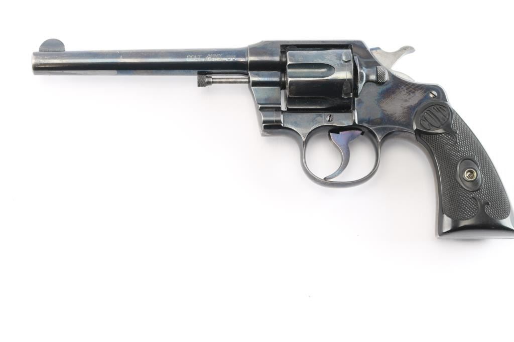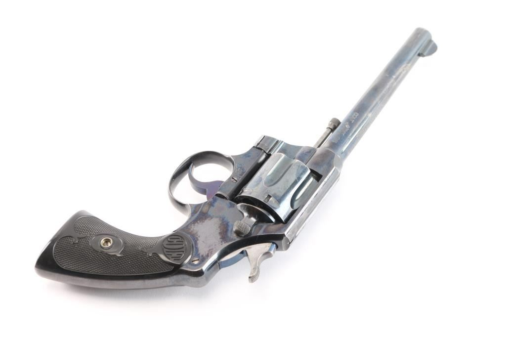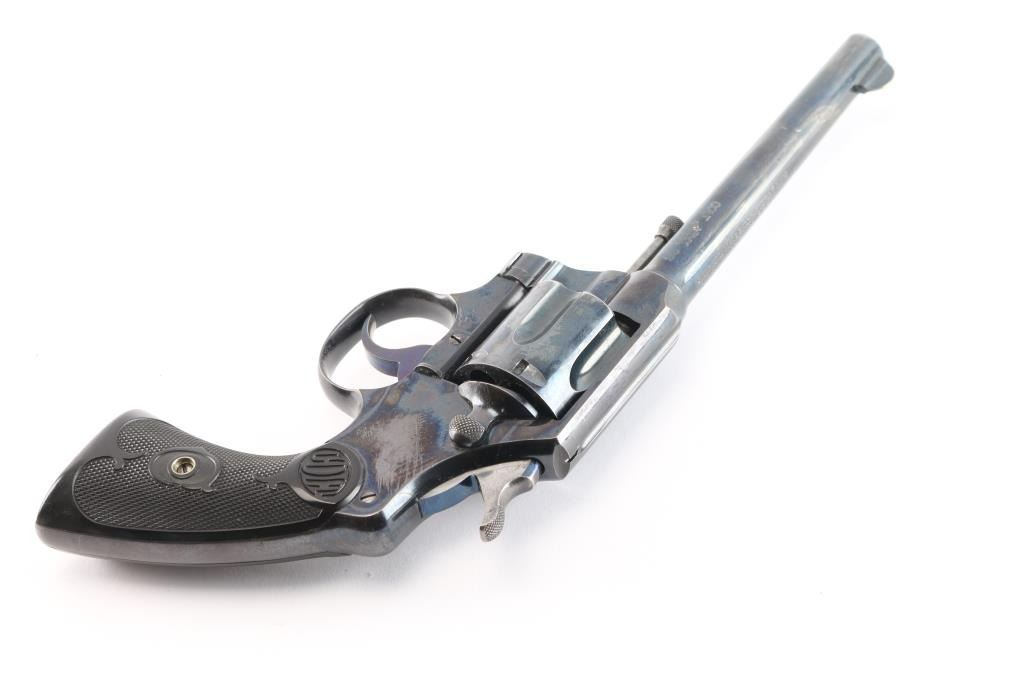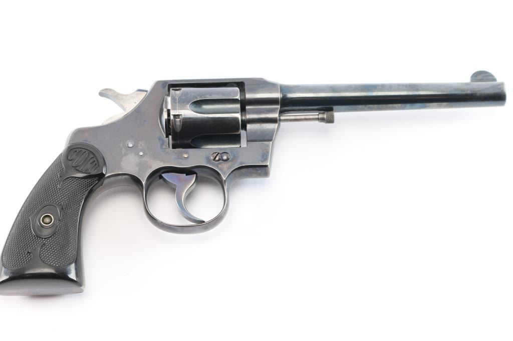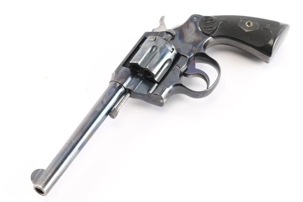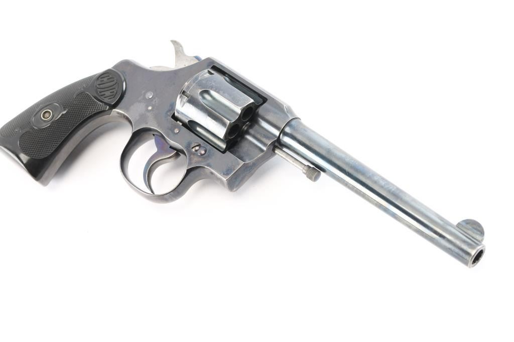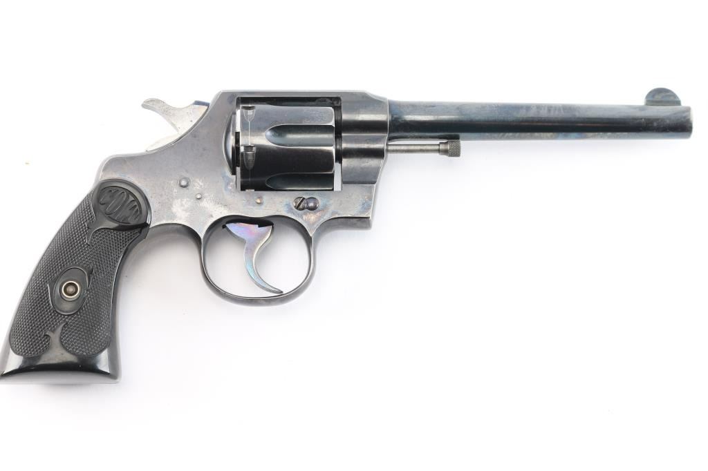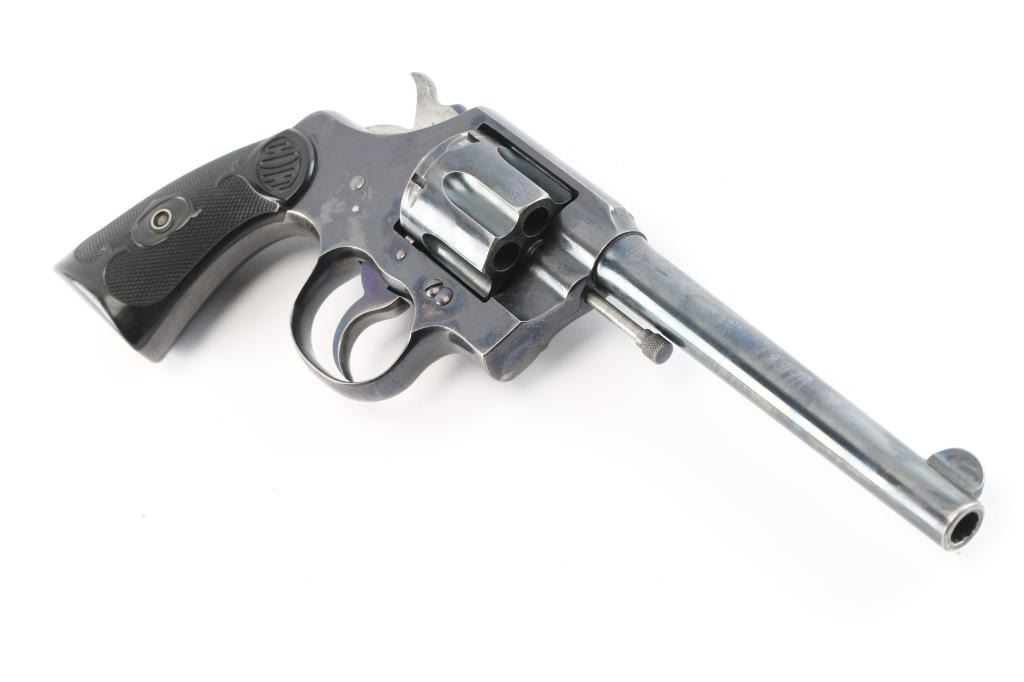 Vintage double-action revolver, 6-rd capacity. Built on the E frame. 6" round barrel, round front sight blade, with u notch cut rear sight. Exposed extractor rod. Blued metal finish. 2-line Colt address, and patent dates on top of the Barrel. "Colt Army Special" on left side of barrel, 'Rampant Colt" on left frame. Checkered hard rubber grips with 'Colt'. motifs. Manufactured in 1911. Blued finish retains about 85% with handling/edge wear, minor scratches. There is a small patch of pin-prick pitting on top of the barrel below the front sight. Bore is excellent/bright, action is smooth with tight lock-up. Grips are excellent. Condition would be a lot higher if not for the patch of pitting.
