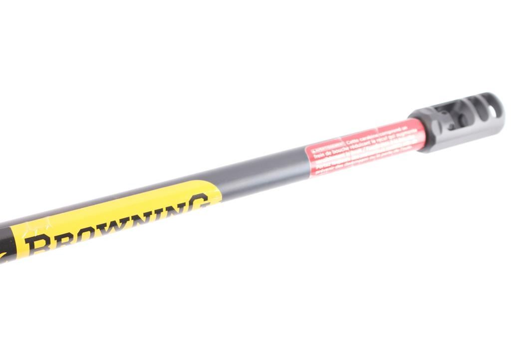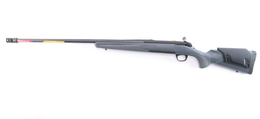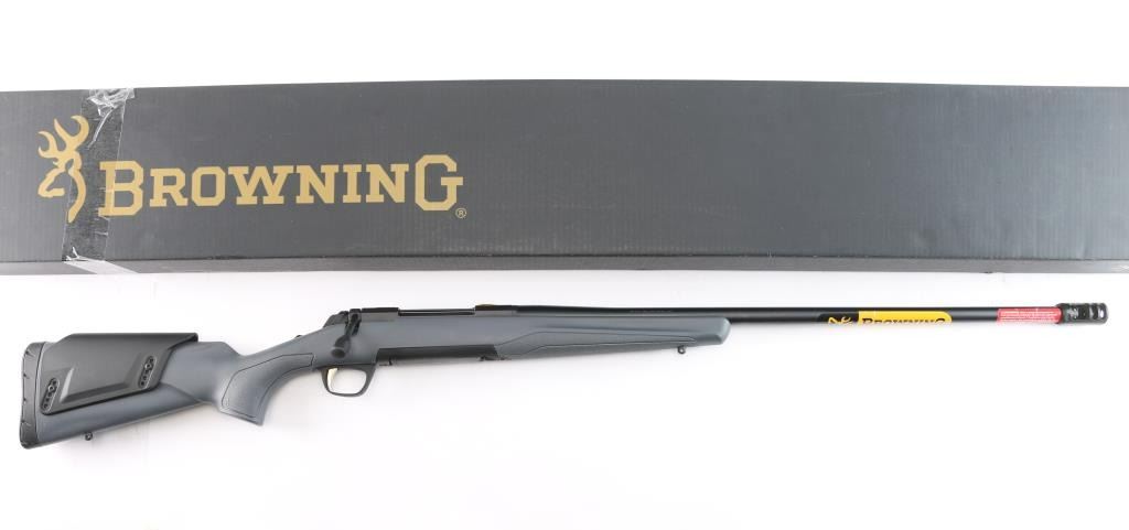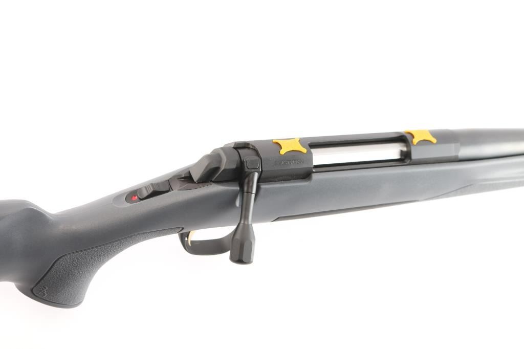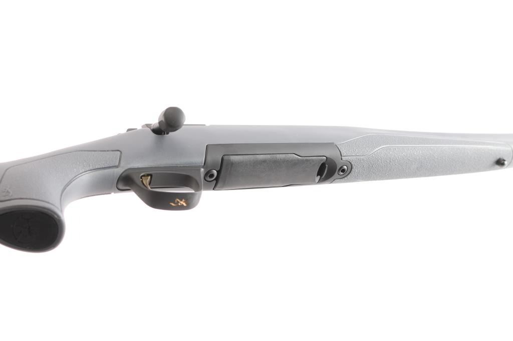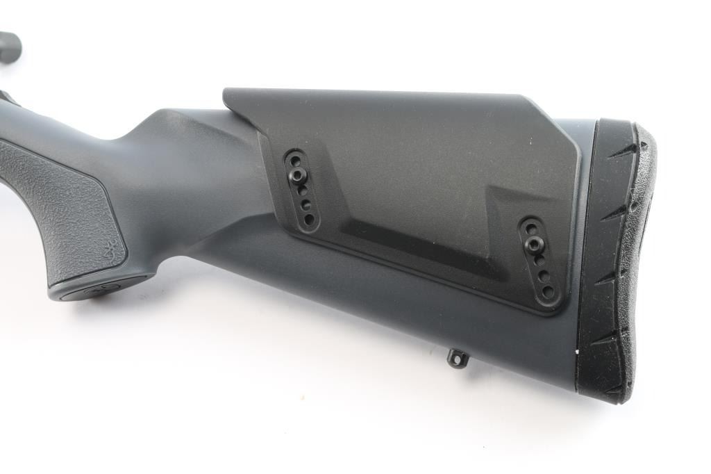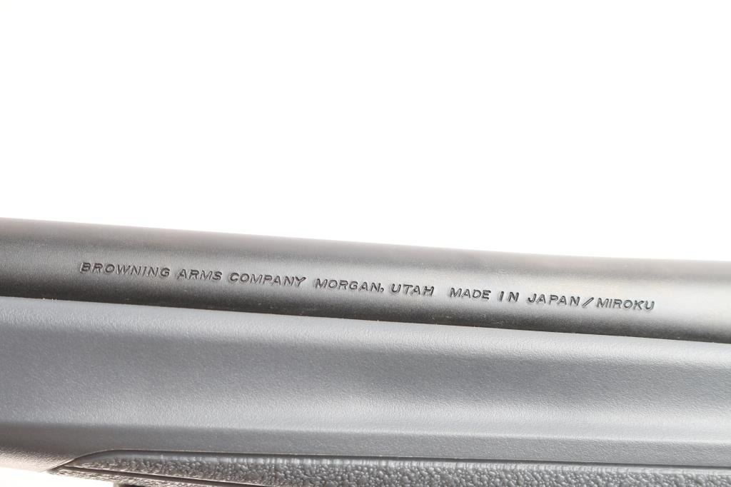 Made in Japan by Miroku and imported by Browning Arms Co. Morgan, UT. Chambered in .28 Nosler. Bolt action sporting rifle manufactured circa 2022. Features , 26" tapered barrel with a Recoil Hawg muzzle brake, no provisions for sights, receiver drilled and tapped for optics, manual sliding tang safety, detachable 3rd magazine, smooth gold accent trigger. Gray polymer stock with textured panels at wrist & forend, adjustable comb, swivel sling studs, soft textured rubber recoil pad. Bore is pristine. Retains approx. 99% finish, like new. Comes with factory box. Condition is NRA Excellent - like new. *** Modern Firearm***.