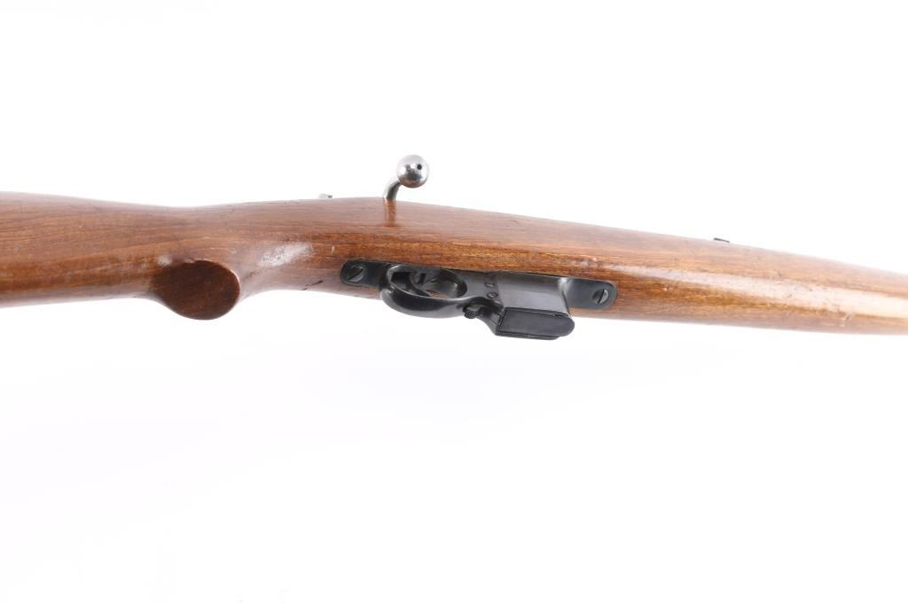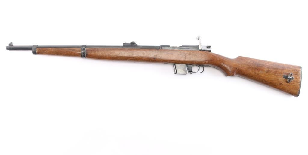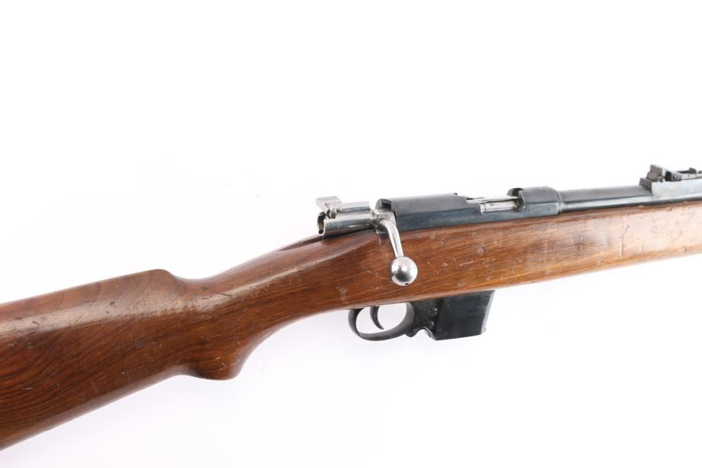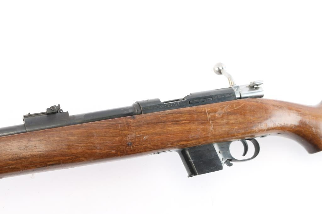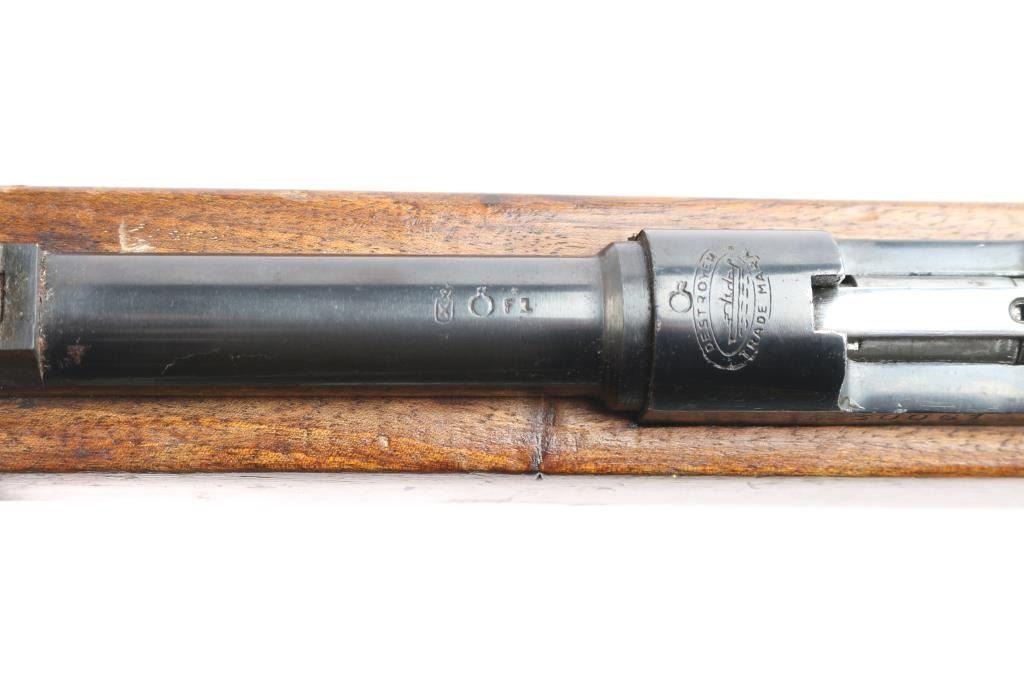 Spanish bolt action pistol caliber carbine manufactured by Gaztanaga y Compania and imported by CAI, of St Albans VT. The Destroyer Carbine is a small carbine chambered for the 9×23mm Largo (Bergmann) cartridge. It was used by Spanish police and prison services, including the Guardia Civil from 1935-1969. "F1" date code-1960, flaming bomb proofs. Features blued finish, bolt assembly in the white, full length wood stock with semi-pistol grip wrist, 21" barrel, blade front sight, flip-up ladder type rear sight, manual flag safety, 6-rd detachable magazine, side mounted sling swivels. Bore has what appears to be surface rust in the grooves. Retains 85% blued finish with scratches & scuff marks, edge wear. Wood is good condition with many scratches & dents, some gouges. Markings include "DESTROYER / TRADE MARK" on receiver ring forming an oval around the image of a naval vessel. Includes (1) magazine.