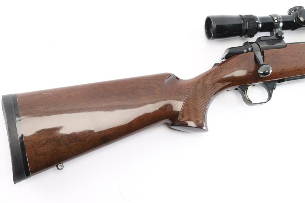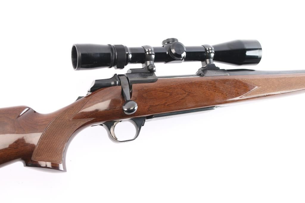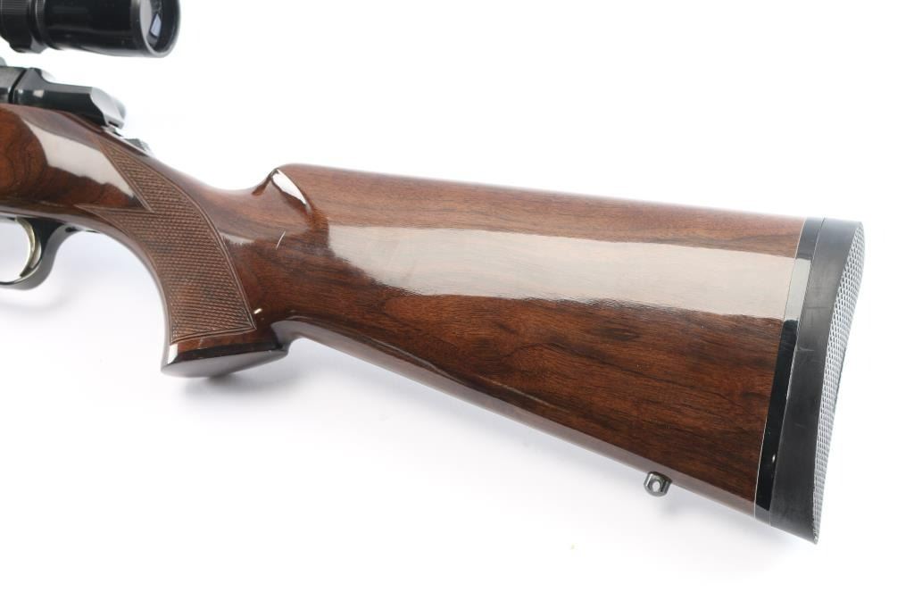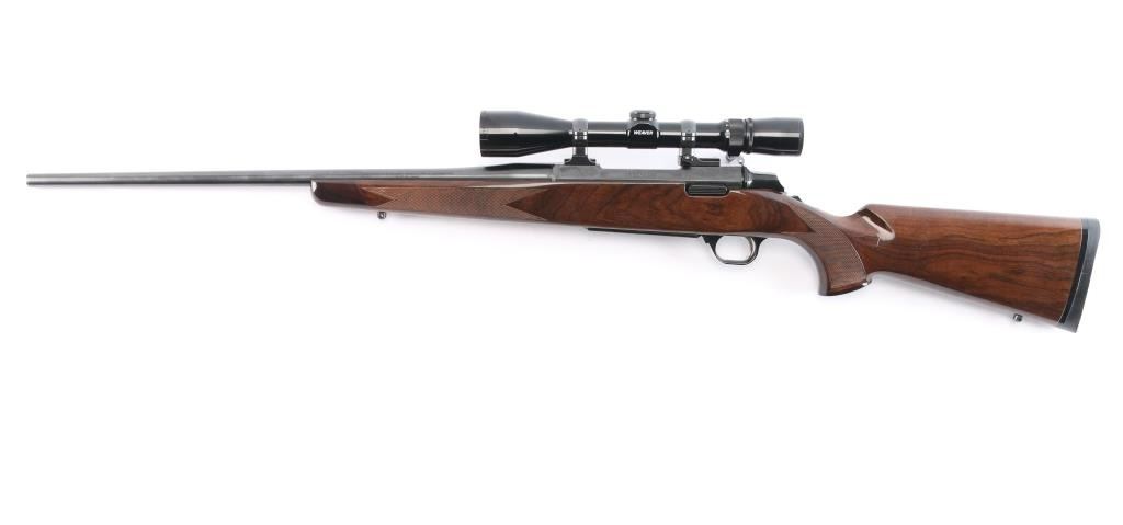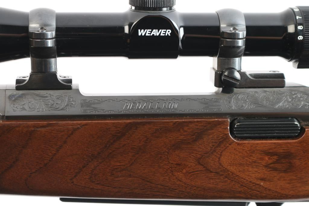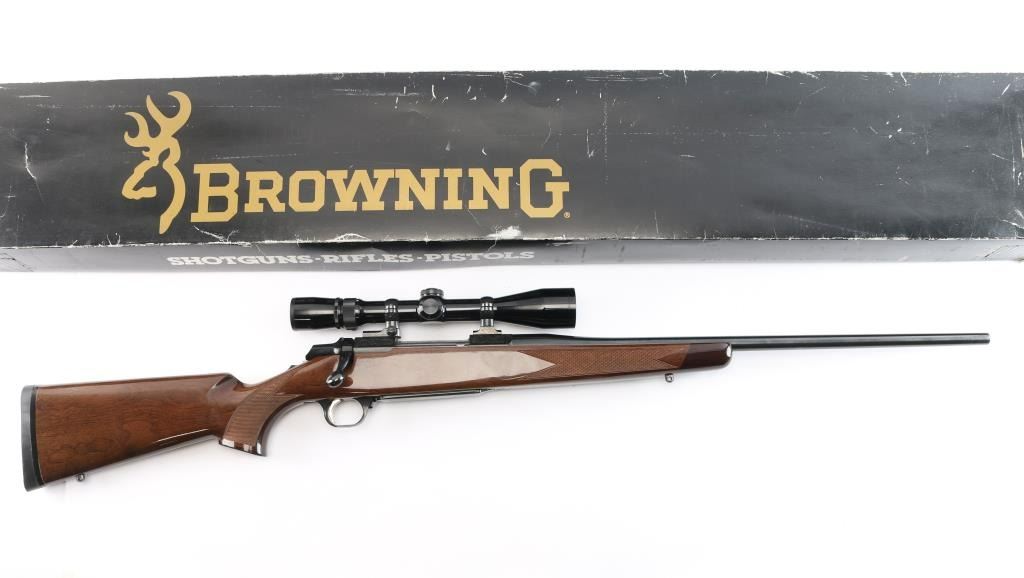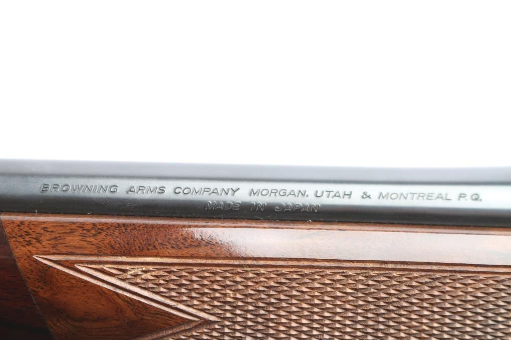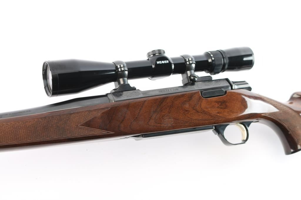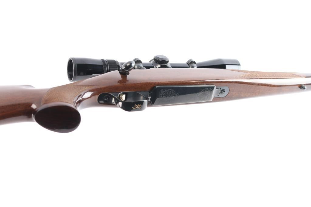 Made in Japan for Browning. Bolt action rifle chambered in .25-06 Remington, circa 1992. Features blued finish, 22" tapered barrel and receiver. Tang safety. Flats on receiver are engraved with a floral pattern and the word "Medallion" on the center left of receiver. No provisions for sights. Nice hi-gloss dark wood stock with checkering at wrist and forearm with accent colored grip and forend caps. Metal trigger guard with Browning "Buckmark" logo, engraved hinged floorplate, sling swivel studs, serrated gold colored trigger and Browning rubber recoil pad with a black spacer. Bore is excellent. Retains approx. 98% finish with no visible marks or wear. Wood is excellent except for one 1/4" vertical scratch on the left side of the butt stock and one 1/2" horizontal scratch on the right side of the butt stock. Includes mounted Weaver 3-9X scope with a fine hair cross reticle, brown leather sling and original factory box. Action is smooth/tight. Condition is NRA excellent. ***Modern Firearm***.