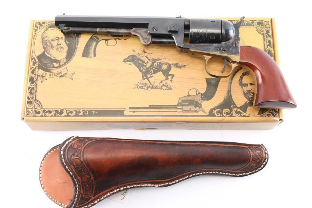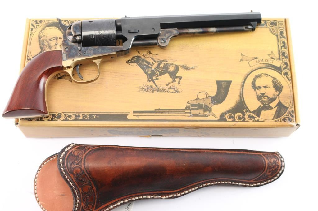 #X34653 'Man With No Name' Italian made by Uberti, imported by Cimarron F.A. Co. replica of the 1851 Navy model used by Clint Eastwood in the 1960s spaghetti westerns. Retaining a Civil War-era, black powder style loading lever, converted to handle modern factory smokeless cartridges in .38 Colt or .38 S&W Special, this 7 1/2" octagonal barrel, finished in blue and color casehardening, with a brass back strap and trigger guard. Naval engagement scene on cylinder, smooth wood grips. Revolver is in like new condition. Bore is pristine, appears unfired. Comes in factory box with manual, cable lock. Also included is a "Old West Leather' cross draw "Slim Jim" style leather holster.