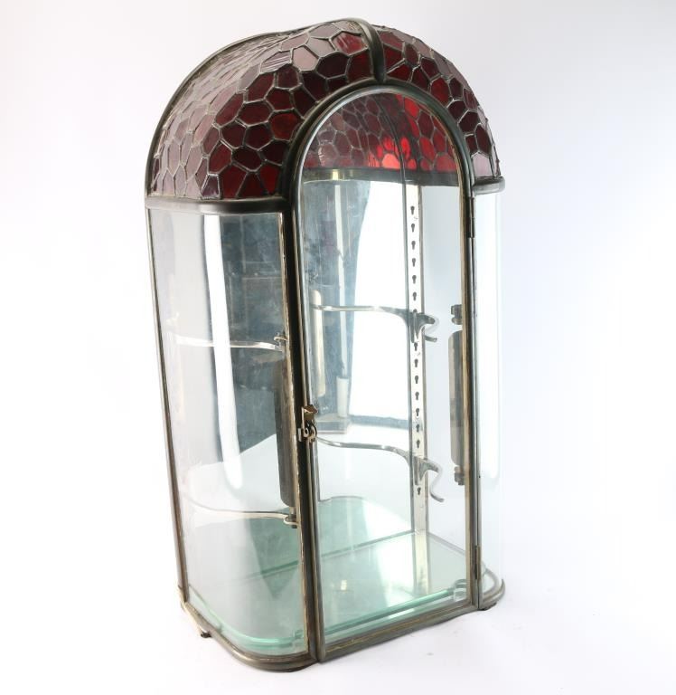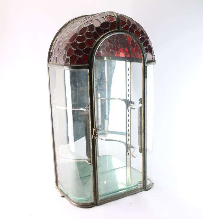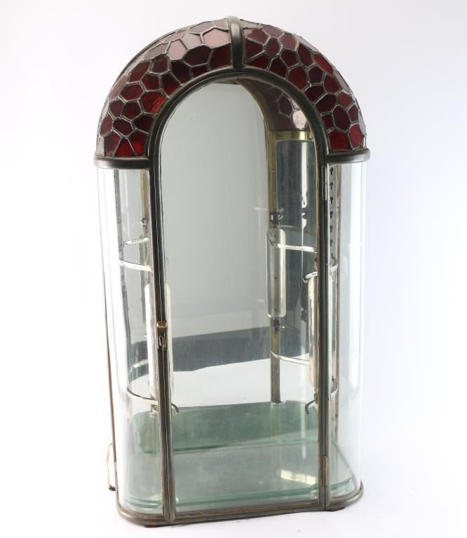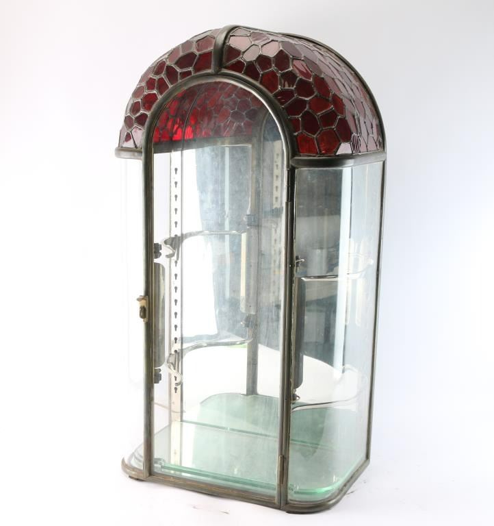 With ruby red stained glass and leaded dome, circa 1900-1920's. Measures 36" tall by 19" wide by 11" deep. Two adjustable glass shelves with chromed arms that mount into keyed slots. All hand-made by a competent or expert craftsman who may have made lamps as it has the "Tiffany" lamp look in styling. Great patina and very good to near fine unrestored original condition. Held Larry Shelton's prized California knives, razors and gold rush items.