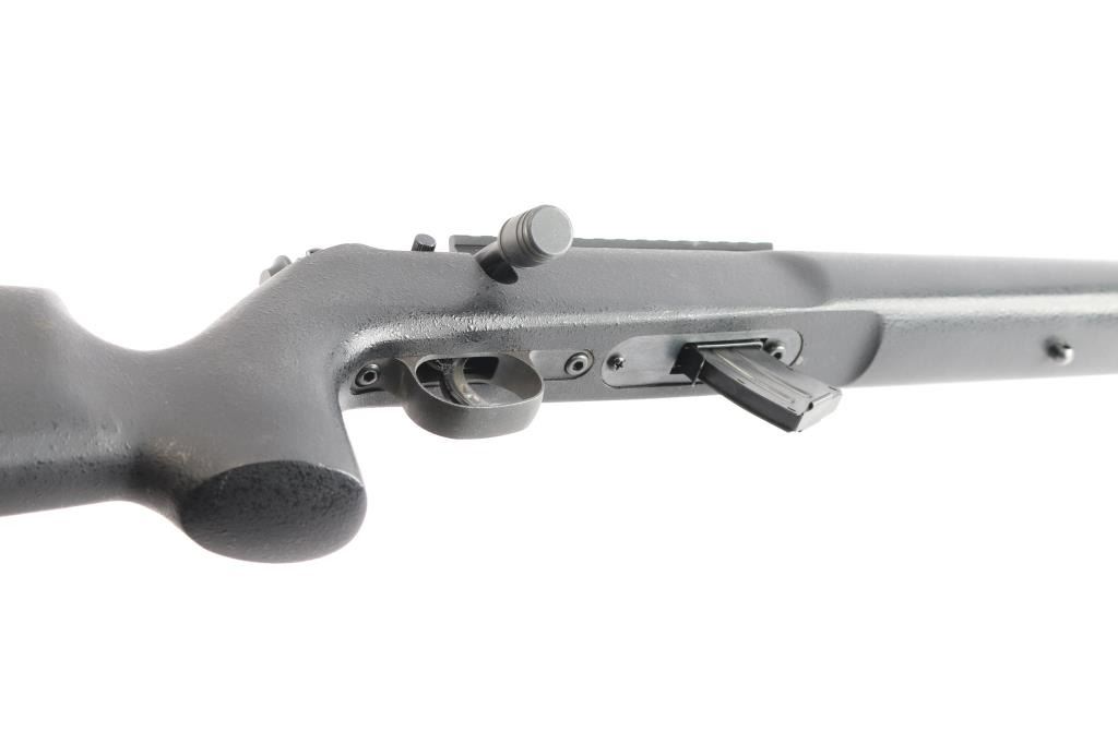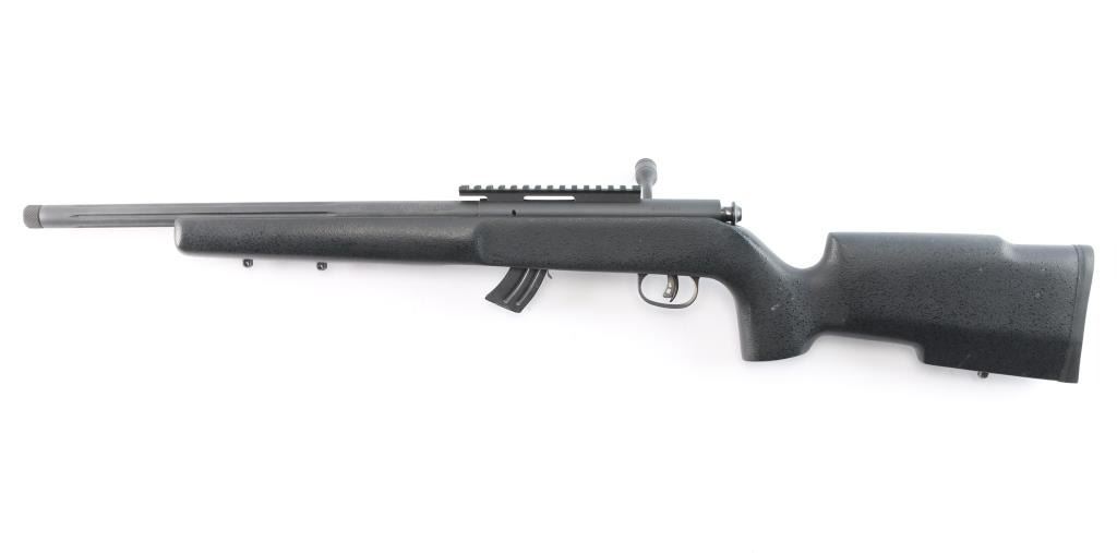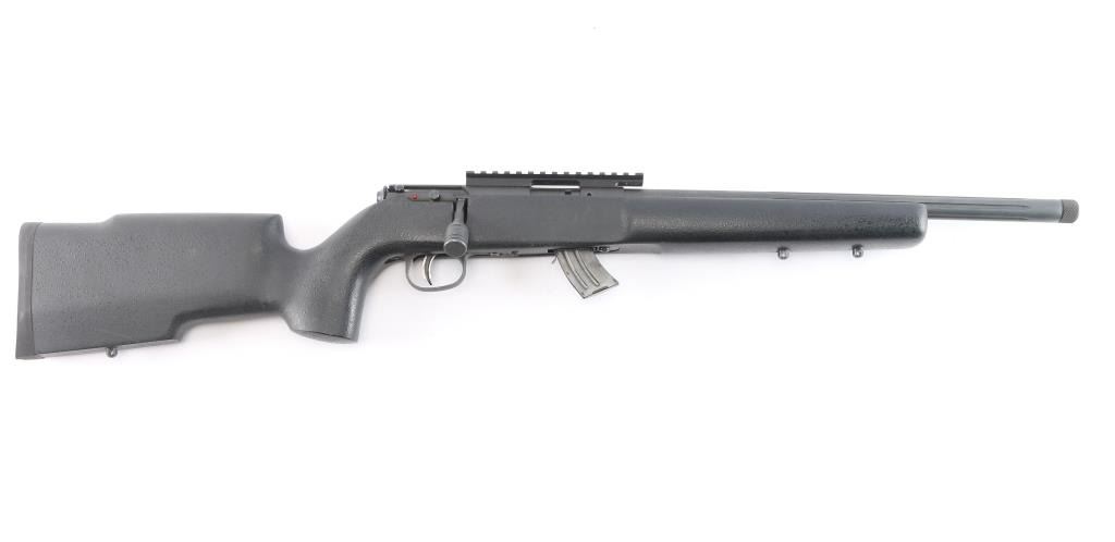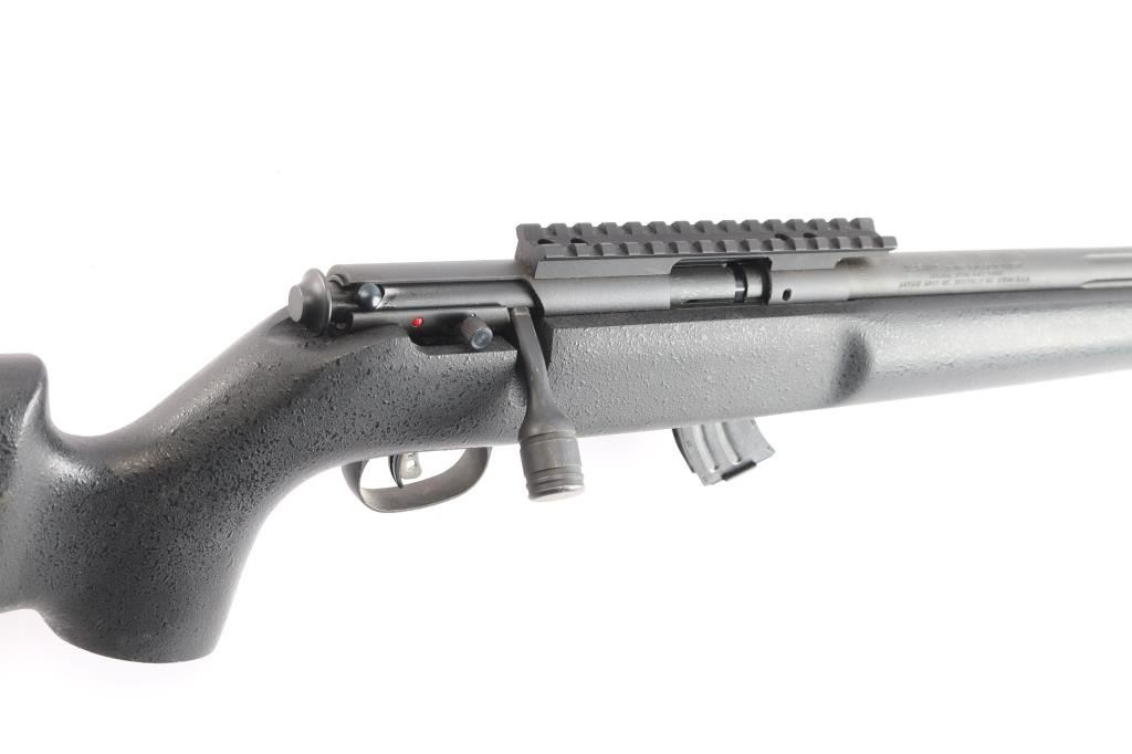 Optics ready Canadian made magazine fed bolt action sporting rifle chambered in 22 Long Rifle. Imported by Savage Arms Inc. of Westfield, M.A. with import marks on the left side of the barrel. Features a matte black finish, 16" fluted barrel with threaded muzzle/cap & no provisions for sights, adjustable Accu-trigger, manual safety on the right side of the receiver, detachable 10 round magazine, and pebbled black synthetic semi-pistol grip shoulder stock, black rubber recoil pad. One piece multiSlot scope base installed on receiver, 3 sling studs. Rifle retains approximately 98% of its matte finish showing very little wear. Action is smooth, the bore is excellent/bright, the synthetic stock is near fine.