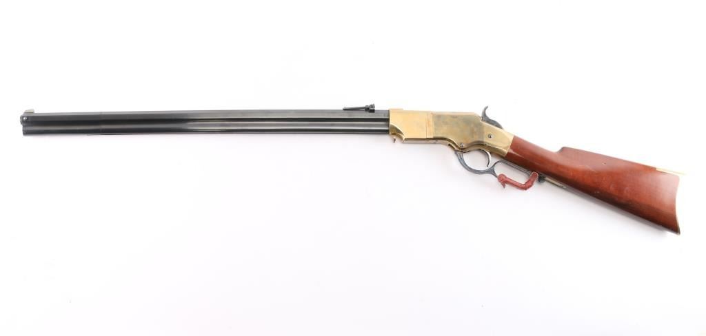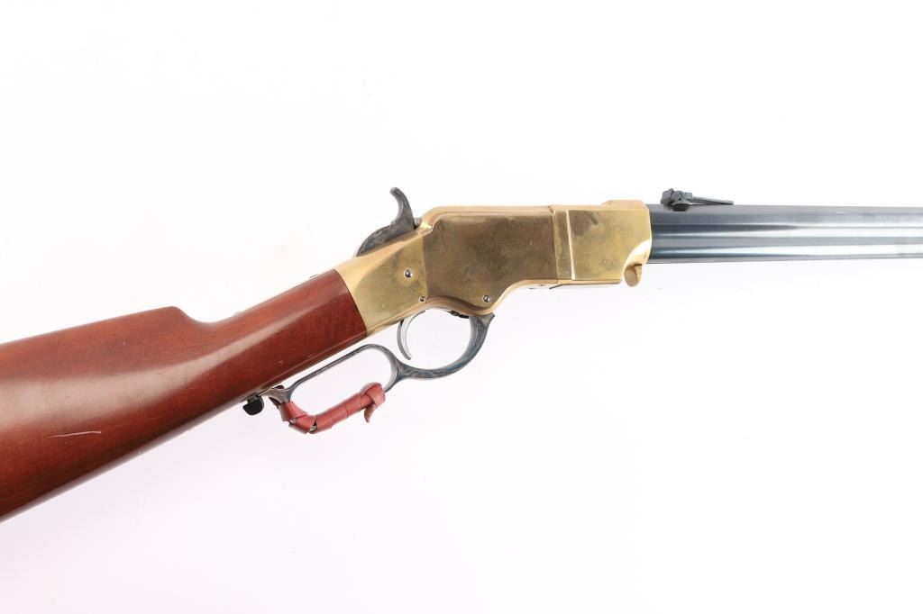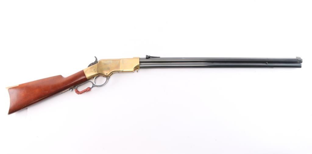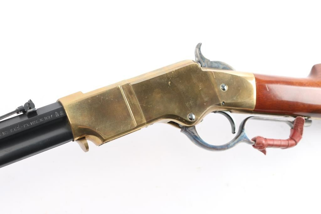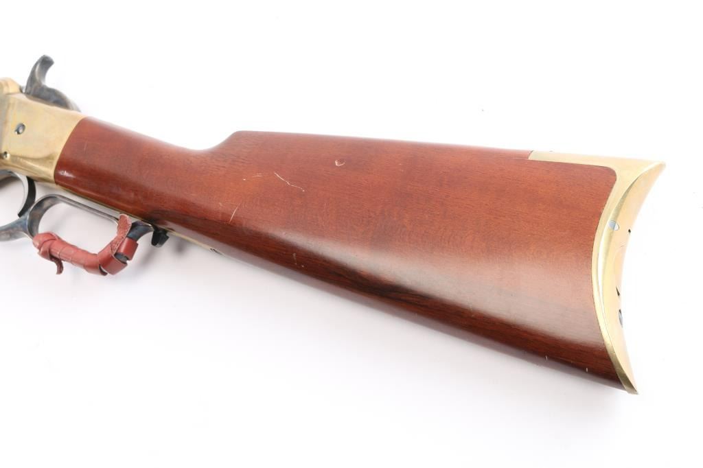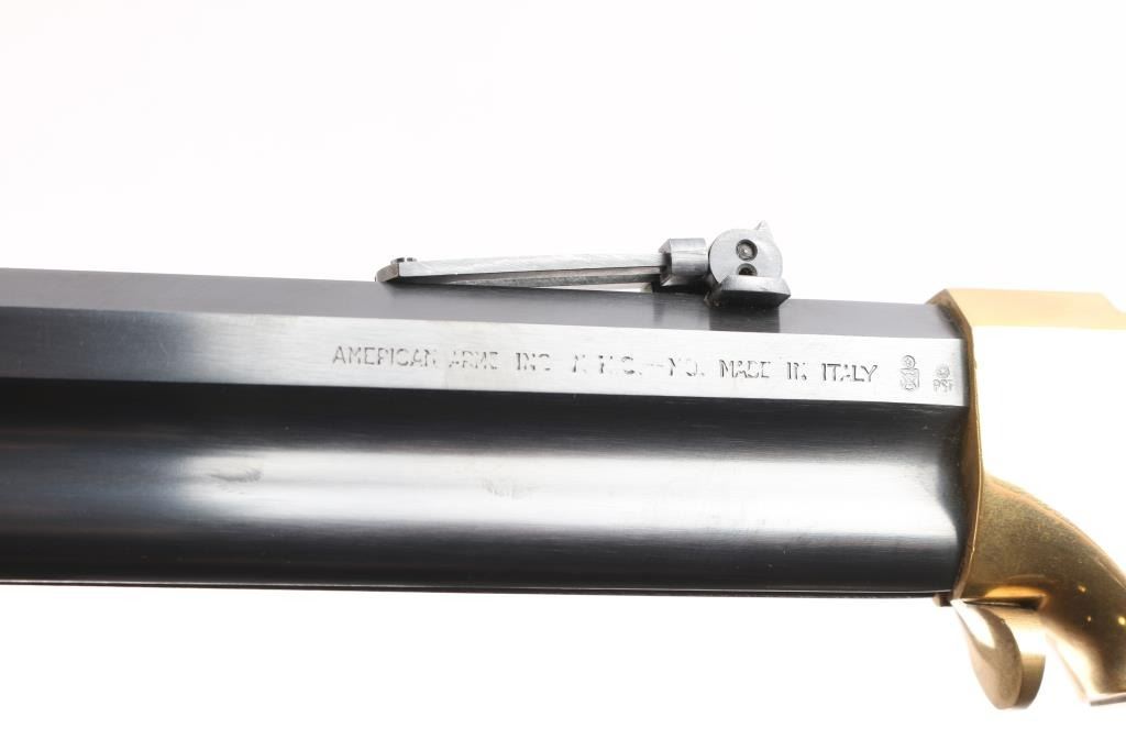 Made in Italy by Uberti and import by American Arms Inc., Kansas City, MO. Lever-action rifle chambered in .45 Long Colt ammunition. Features 24" blued octagonal barrel with a brass blade front sight and ladder type rear sight that flips down to provide an open "V" notch. Polished brass receiver and crescent buttplate, full length tube magazine, case hardened lever and hammer, bright polished sides on trigger and lever locking latch. Bore is pristine. Retains approx. 95% finish with some handling marks. Wood buttstock is near excellent condition with scattered light scratches and several small dents. Condition is NRA Excellent