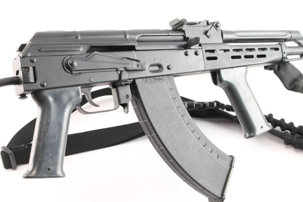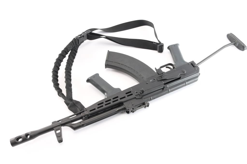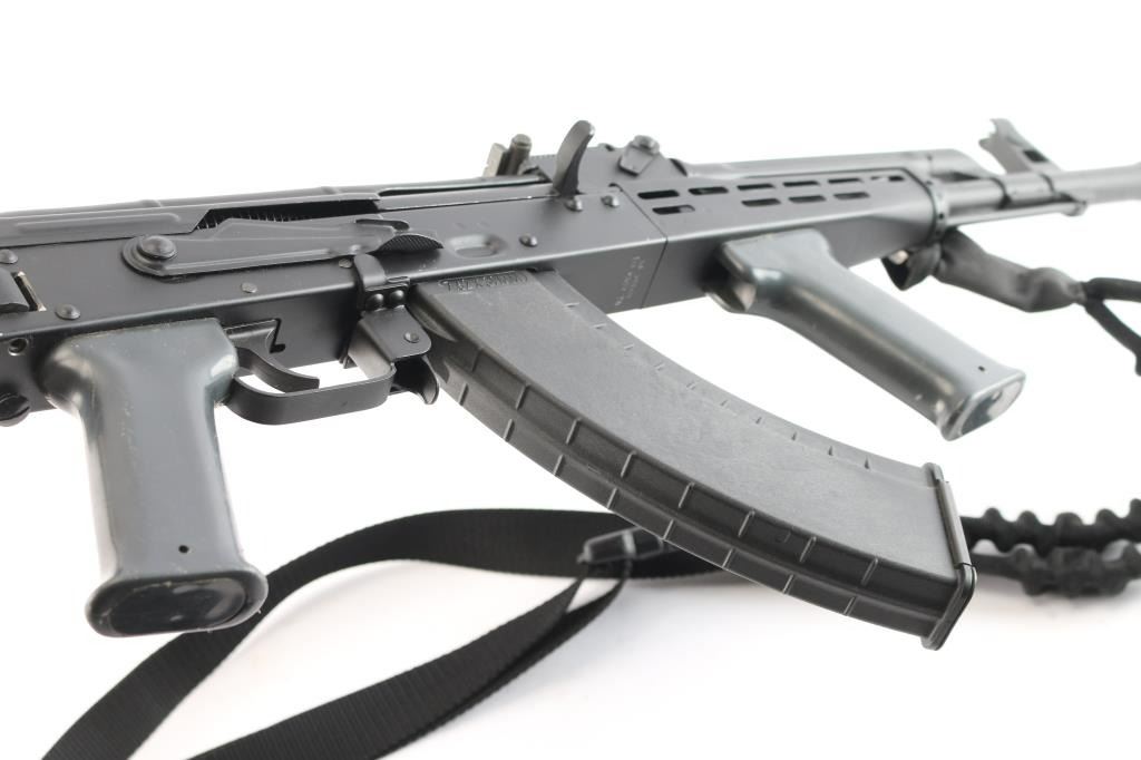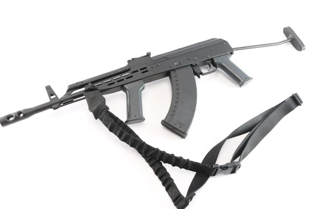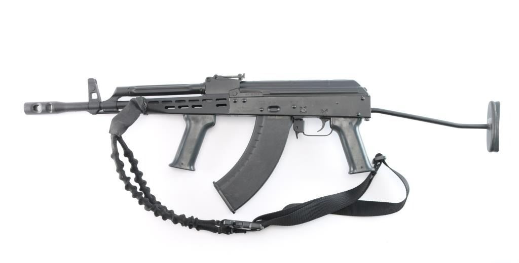 Hungarian semi-automatic rifle imported by TGI Knoxville, TN. Based on AK-47/AKM design. Features black paint finish over parkerized metal, 12" threaded barrel with welded 5" ported muzzle brake installed. Protected post adjustable front sight, tangent rear sight, manual safety, right side-folding metal stock, vented metal handguard, gray plastic K-grip and pistol grip, sling loop on gas block. Bore is very good/slightly dirty. Retains 95% finish with few scratches, edge wear and handling marks. Includes one Tapco 30rd polymer magazine, cleaning rod and one-point sling. Condition is NRA Excellent. *** Modern Firearm ***.