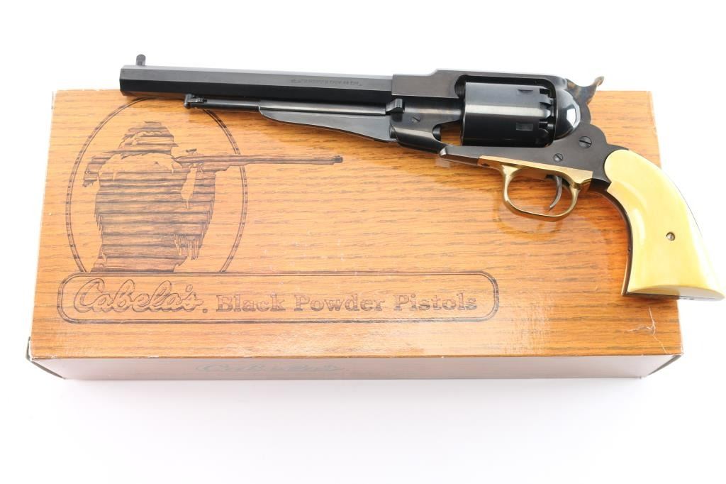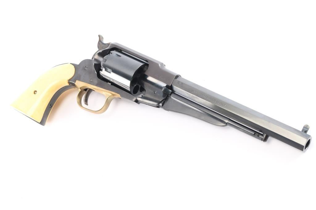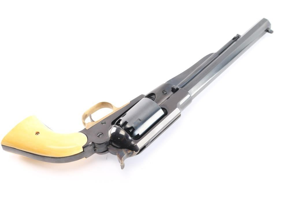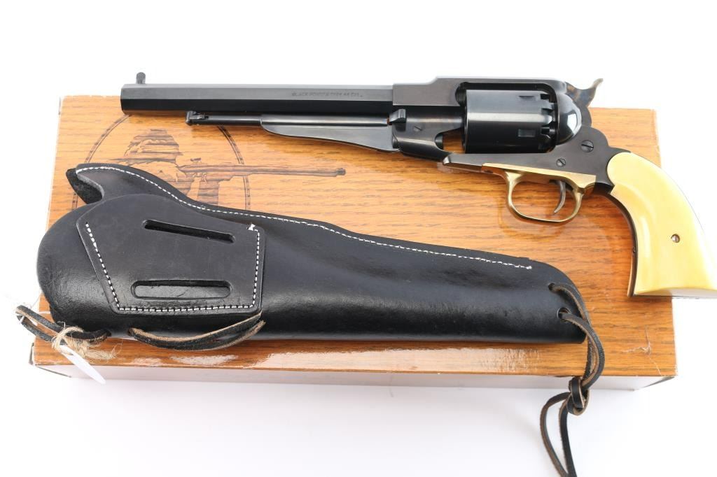 Italian replica of the Remington New Model Army design black powder "Cap 'n' Ball" single action revolver. Features blued finish, case colored hammer, and trigger, brass trigger guard, smooth wood factory grips (Included) have been replaced with a nice set of Tombstone Gun Grips aged ivory grips, 8" octagon barrel, loading lever, blade front & fixed notch rear sights. Appears unfired, with excellent condition bore & charge holes. Finish is excellent , excellent grips. Comes with factory box with matching label, manual and factory grips. Also included is a nice black leather 'Slim Jim' style holster with floral designs, like new.