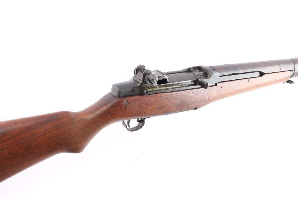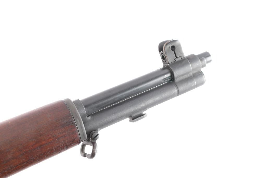 US military semiautomatic rifle manufactured February 1943. SA barrel dated 2-43, D28290-14-SA, on the side of the trigger group. hammer marked C46008-7 SA, Safety marked SA, op rod marked 6535382 SA, receiver marked 3 11 C SS and D 28291 17 and the bolt is marked D28287-12SA S04. Arsenal reworked. Features parkerized finish, blue barrel, wood stock & hand guards, 24" barrel, adjustable sights with protected front blade & protected rear peep, fixed magazine for en-bloc clip, manual safety Handguard and froe stock a darker than the shoulder stock , "P" proof behind triggerguard, ordnance crossed cannons cartouche on left stock with "S.A. E.Mc.F in square next to it. (Colonel Earl McFarland worked as an arms inspector from June, 1942 to July, 1943) Correct for this rifle. .Bore is very good condition, lightly frosted, strong rifling. Metal parts retain 95% medium gray/blue finish. Shows edge losses & handling marks. Wood is very good/sound, the usual minor scratches/dings. A correct mid WW2 rifle