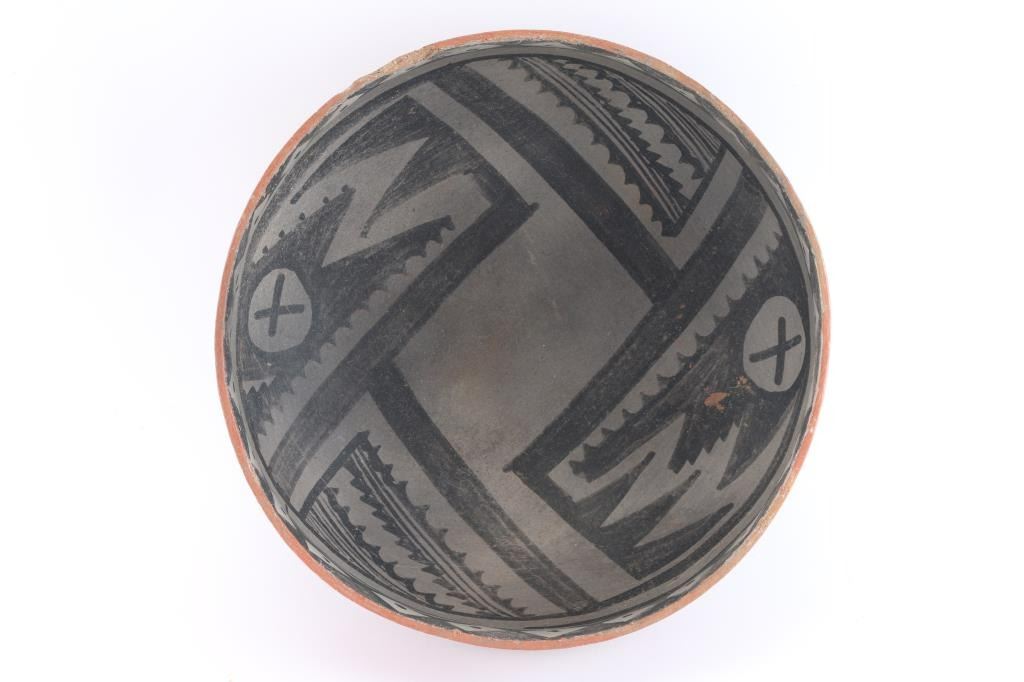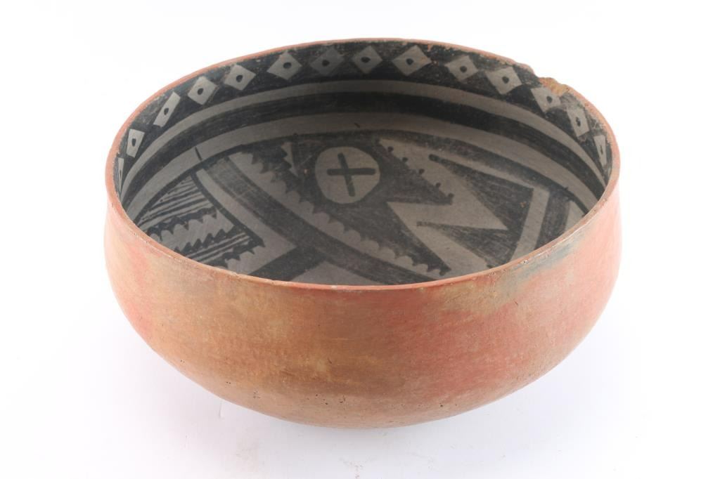 Approximately 12 1/2" diameter by 5 3/4" deep. Circa 1300-1450 (600-700 years old. Good paint and color. Some chips and losses on the rim. A private California collector obtained from Knox Galleries AZ. Rare in this very good condition with no discernable restorations.