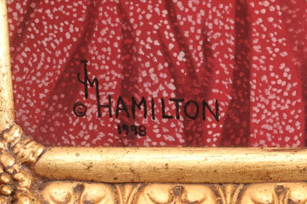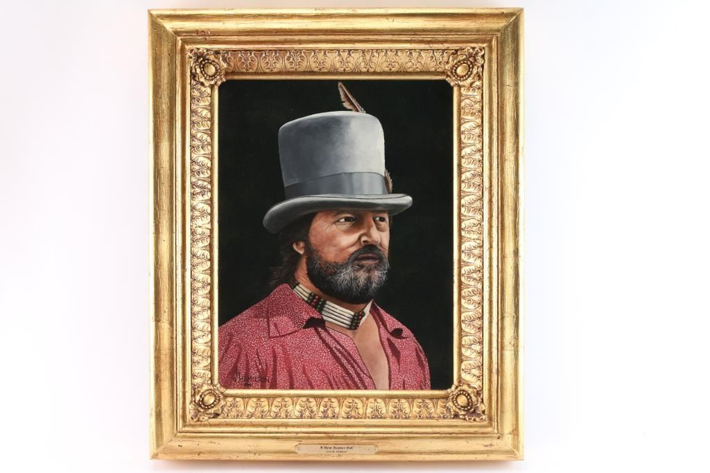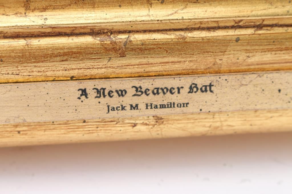 By Colorado artist, Jack M. Hamilton, entitled "New Beaver Hat". Hamilton loved the outdoors, nature's wildlife and American history. He spent years watching, studying and photographing his favorite subjects, often from his working cattle ranch in southern Colorado. Painting on both canvas and panel, Jack worked entirely in the medium of oil. Self-taught, Jack painted in the manner of the old masters. Hamilton was exhibited at many of the country's finest galleries and at many fine art shows. His work has been featured on the cover of, as well as in, national magazines. Measures 19" x 14.5".