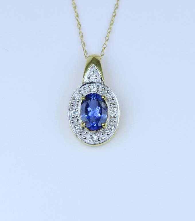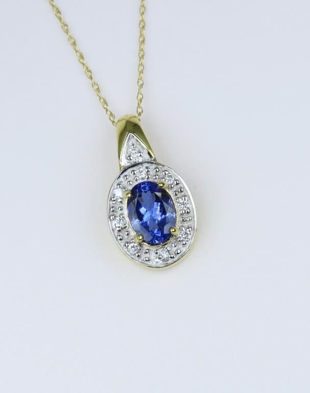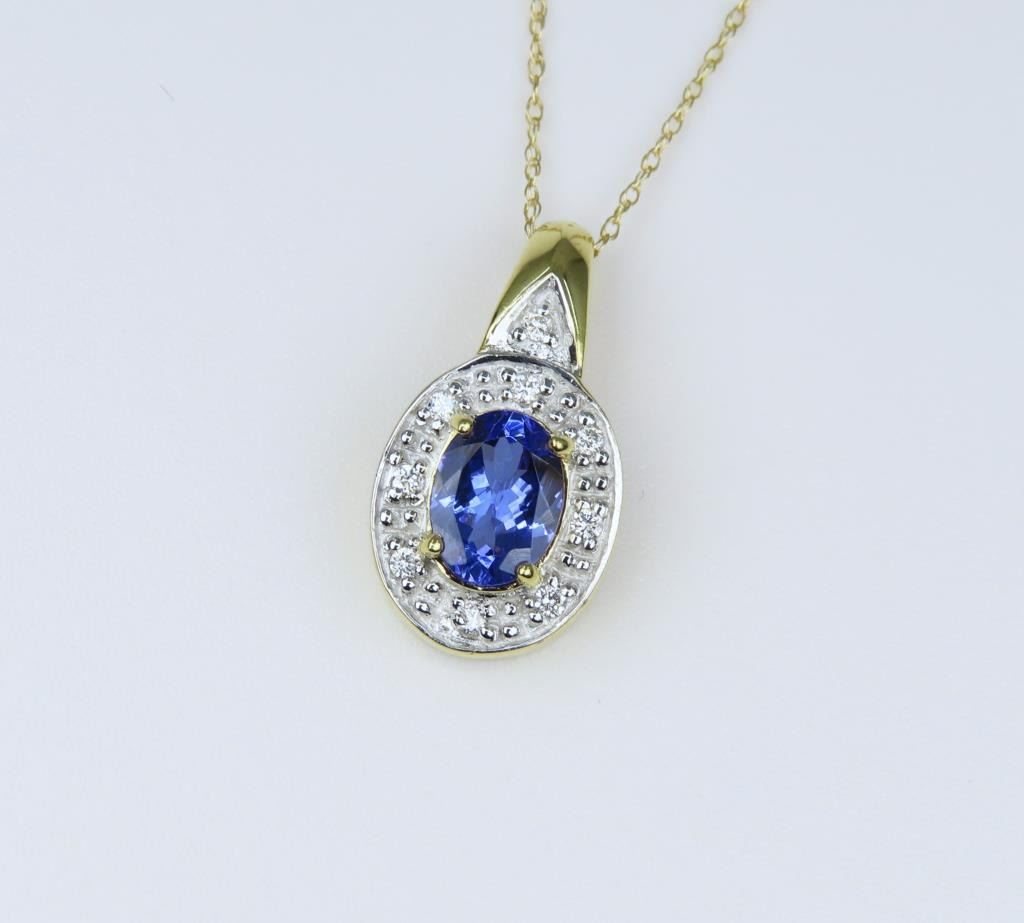 Featuring an oval cut Tanzanite with bright Blue/Violet color framed with 9 round cut Diamonds with a combined gem weight of approx. 1.50 carats set in an 18 karat yellow gold setting.