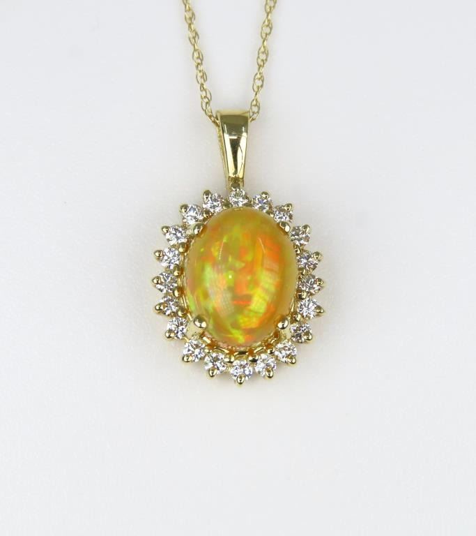Stunning Fine Welo Ethiopian Opal and Diamond Pendant with Opal weighing approx. 4.00 carats framed with 24 “IDEAL” cut Diamonds weighing approx. 0.50 carats with G-H colors and VS clarity set in 14 karat yellow gold setting. Retail $4,000-$6,000.