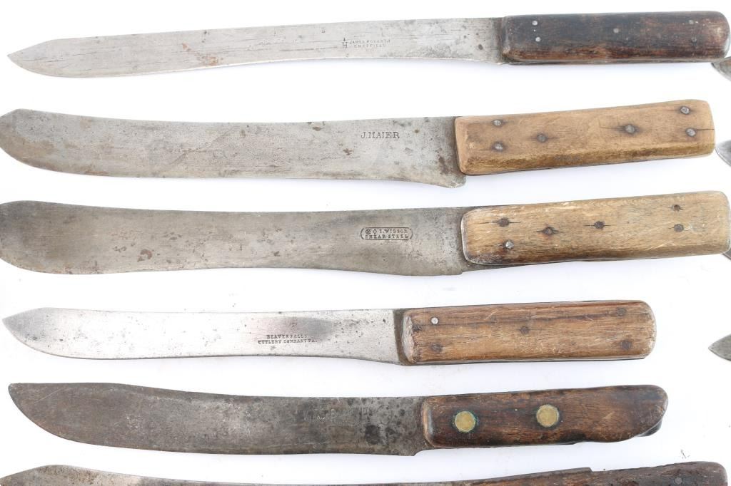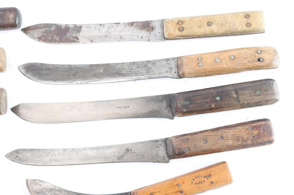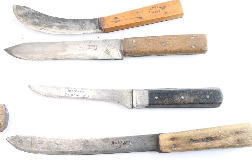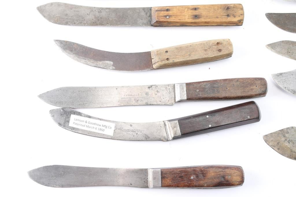 Skinning/butcher knives from frontier era. Five Russell Green River, J. Maier, Lamson & Goodnow (1860), Wilson-Sheffield, Beaver Falls-PA. All well-used and most sharpened. Blades 5" - 9 1/2". Good overall. Some we have never seen another in 56 years of dealing! James Wells "Buffalo Hunt" Collection, values up to $150 each.