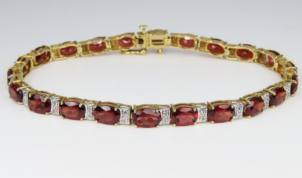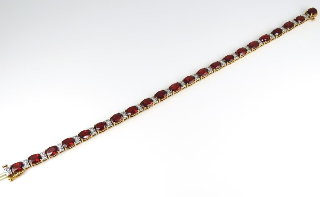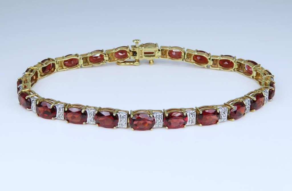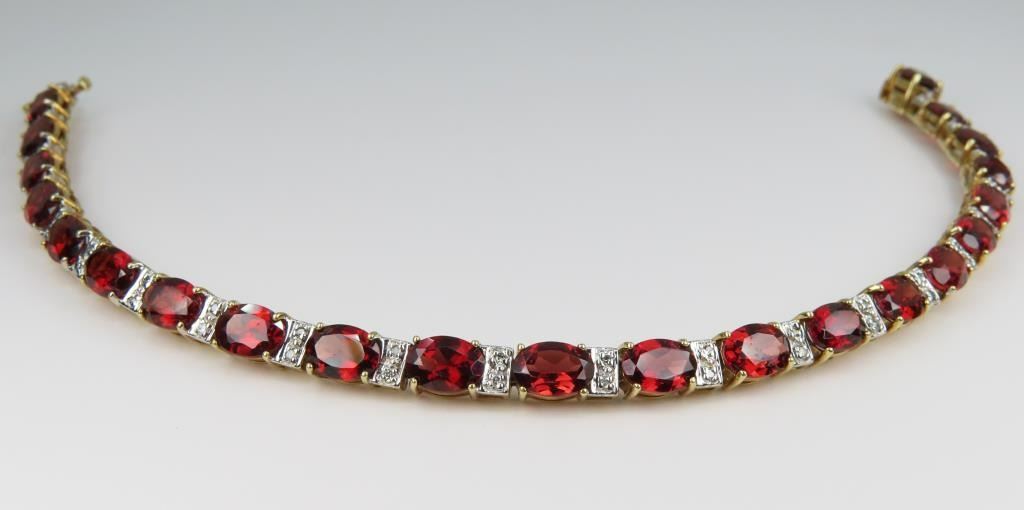 Featuring over 20 oval cut, extra vibrant Red Garnets weighing approx. 18.00 carats accented with 44 round cut accent Diamonds set in a heavy 10 karat yellow gold setting with a gold weight of approx. 15.00 grams. Retail $5,000-$7,000.