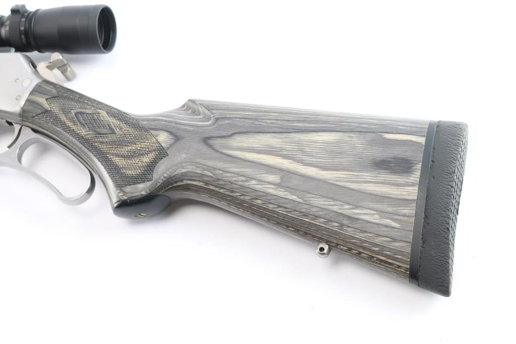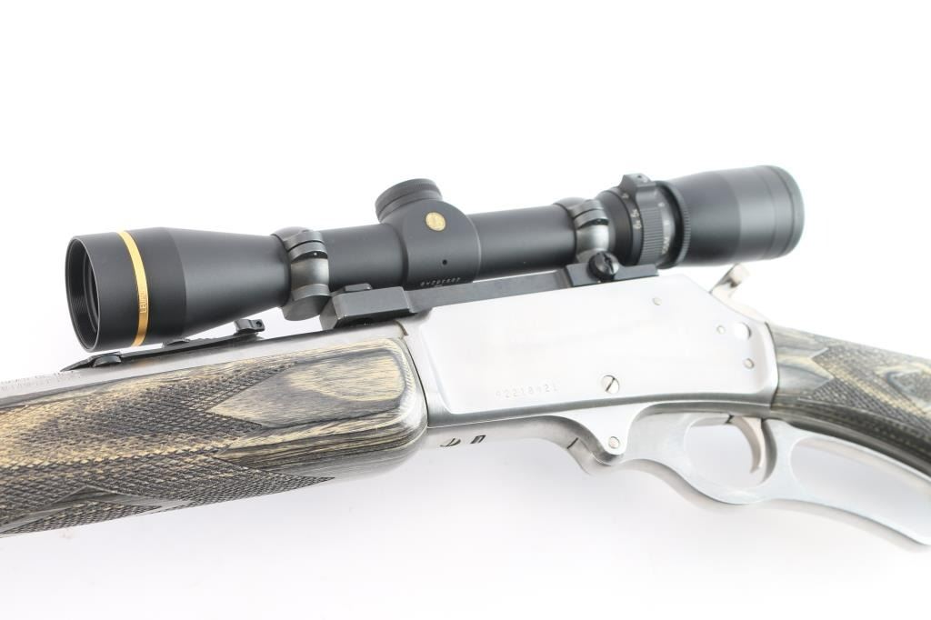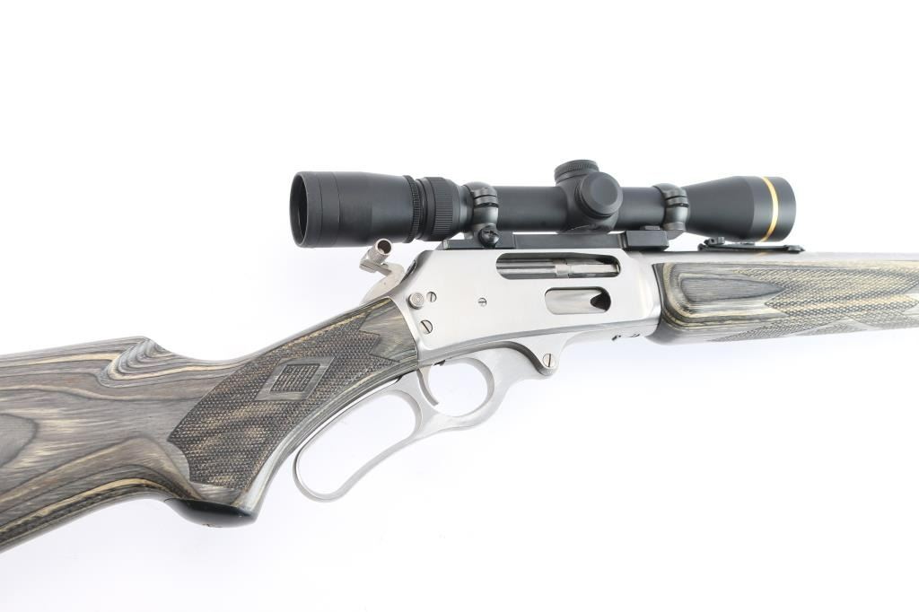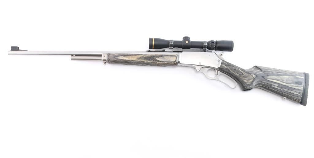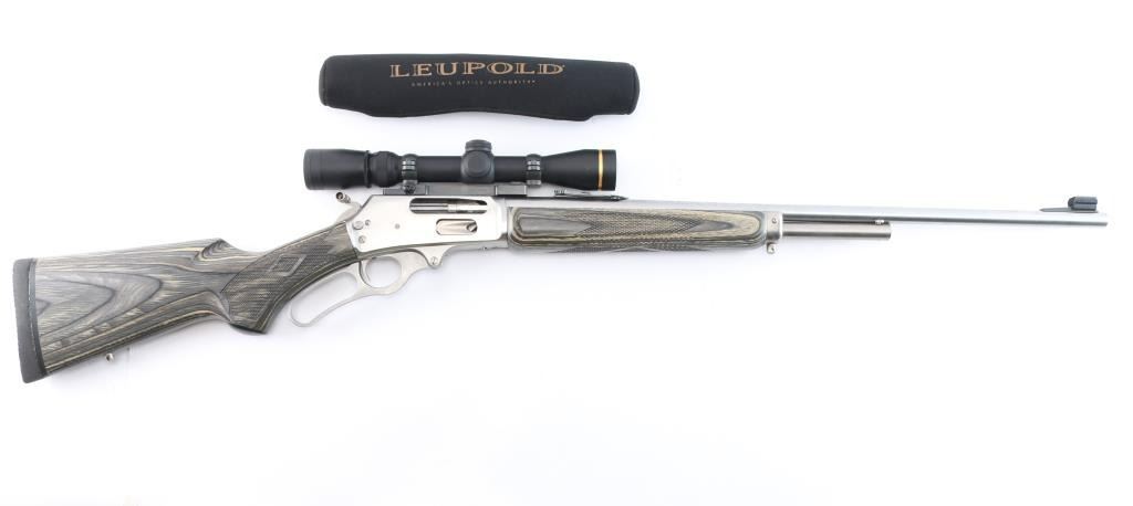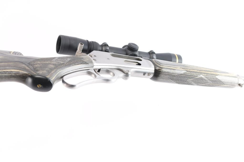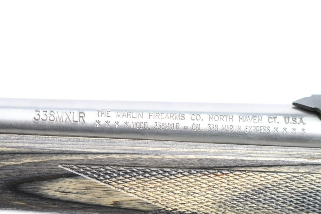 MXLR-Marlin Express Long Range. Stainless steel lever action repeating rifle chambered in .338 Marlin Express. Manufactured 2009, (Discontinued 2009-2019) Features a fully SS finish, 22" barrel, 3/4 tube magazine, ramped & hooded front sight, adjustable rear sporting sight, drilled & tapped receiver, serrated hammer spur with knurled finger extension, smooth trigger, push button safety. The stocks are two-piece checkered gray laminate wood with a capped forearm and grip, straight comb, sling stud in the belly and the forearm cap, and a black rubber Decelerator buttpad. Mounted with a Leupold VX-3 1.75-6x32scope, duplex reticle, clear optics. Rifle shows very little use or wear. Action is smooth, bore is pristine and wood stocks are fine. Comes with factory box. NRA Condition-Excellent. Modern Firearm.